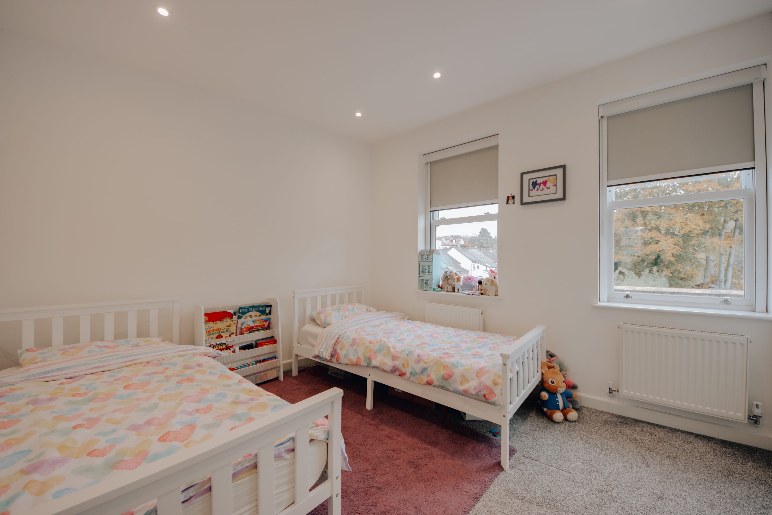 Upstairs, three well-proportioned bedrooms continue the home’s refined design story, each echoing the same sense of calm sophistication found throughout. The principal suite (18’8” x 14’5”) occupies the top floor, a private and tranquil sanctuary featuring bespoke fitted wardrobes and a spacious en suite bathroom, complete with Velux window that bathes the space in natural light. Two additional bedrooms are equally impressive, offering flexibility for family, guests, or a stylish home office. The main family bathroom exudes hotel-like comfort, featuring a deep bathtub with integrated shower and high-quality contemporary fittings that harmonise with the home’s cohesive aesthetic.