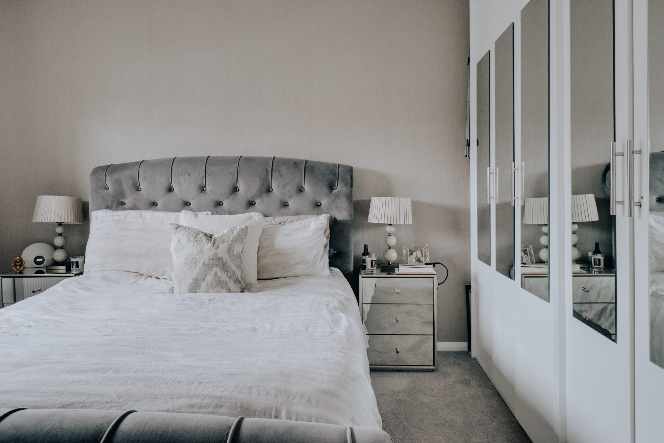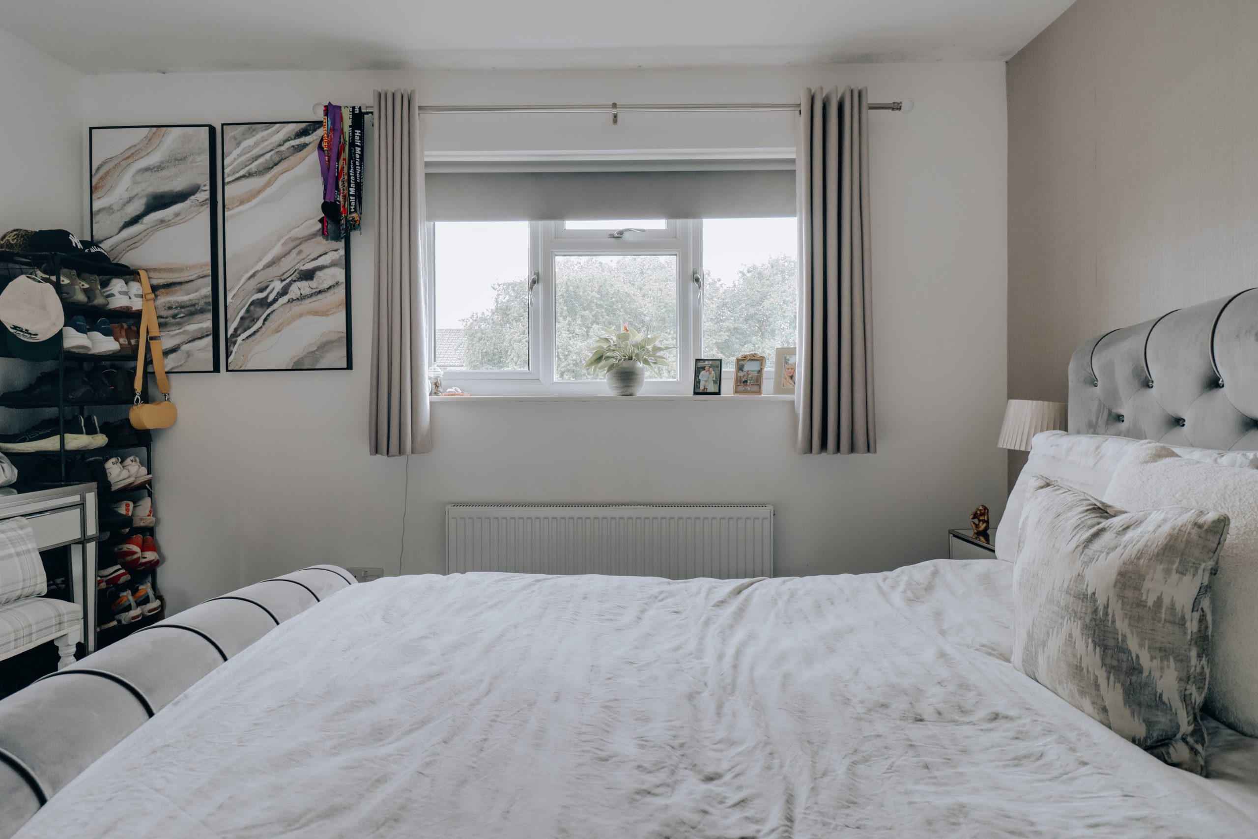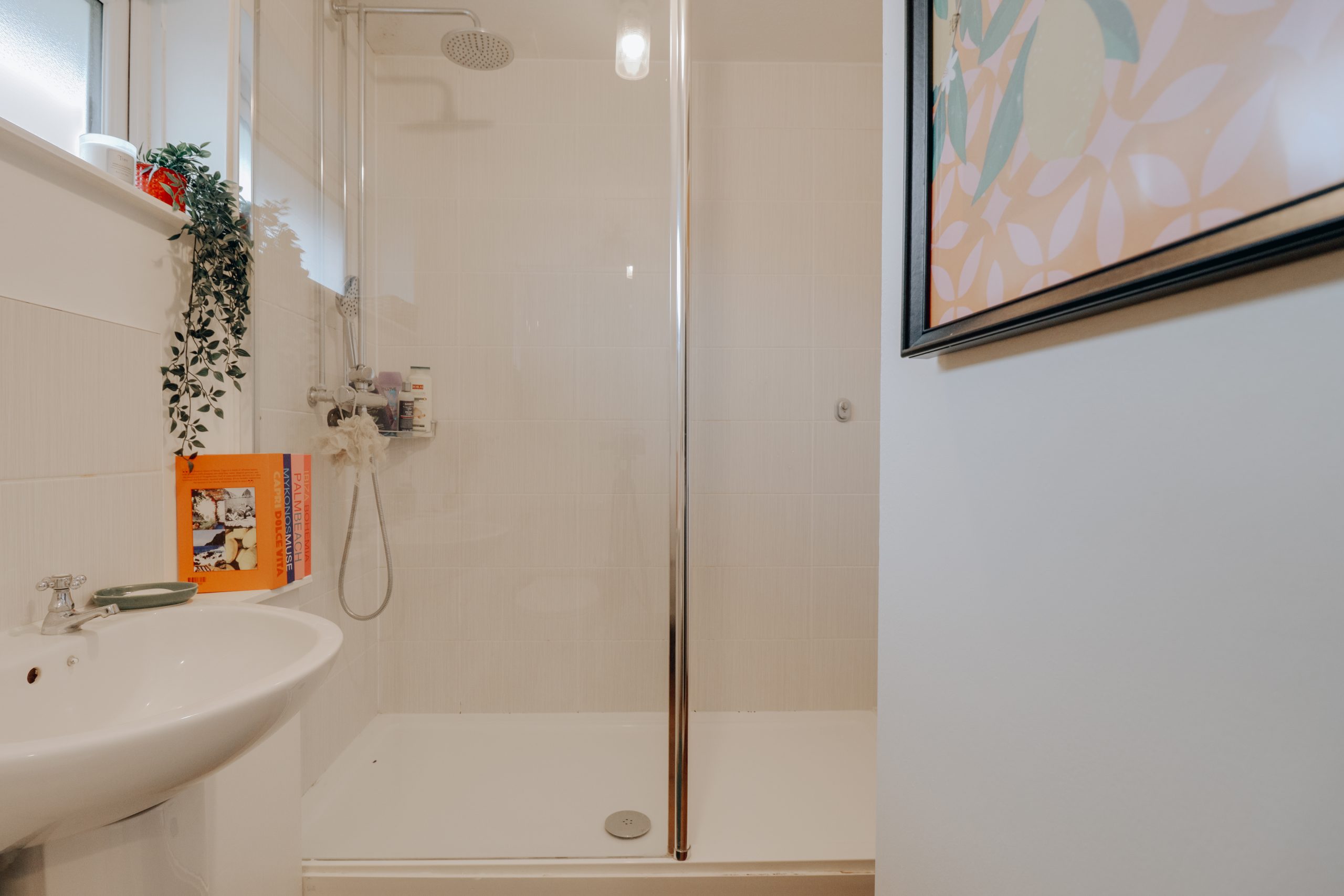Upstairs, the principal bedroom features built-in wardrobes, while across the landing, a beautifully finished bathroom is fitted with a walk-in rainfall shower and neutral tile slips.