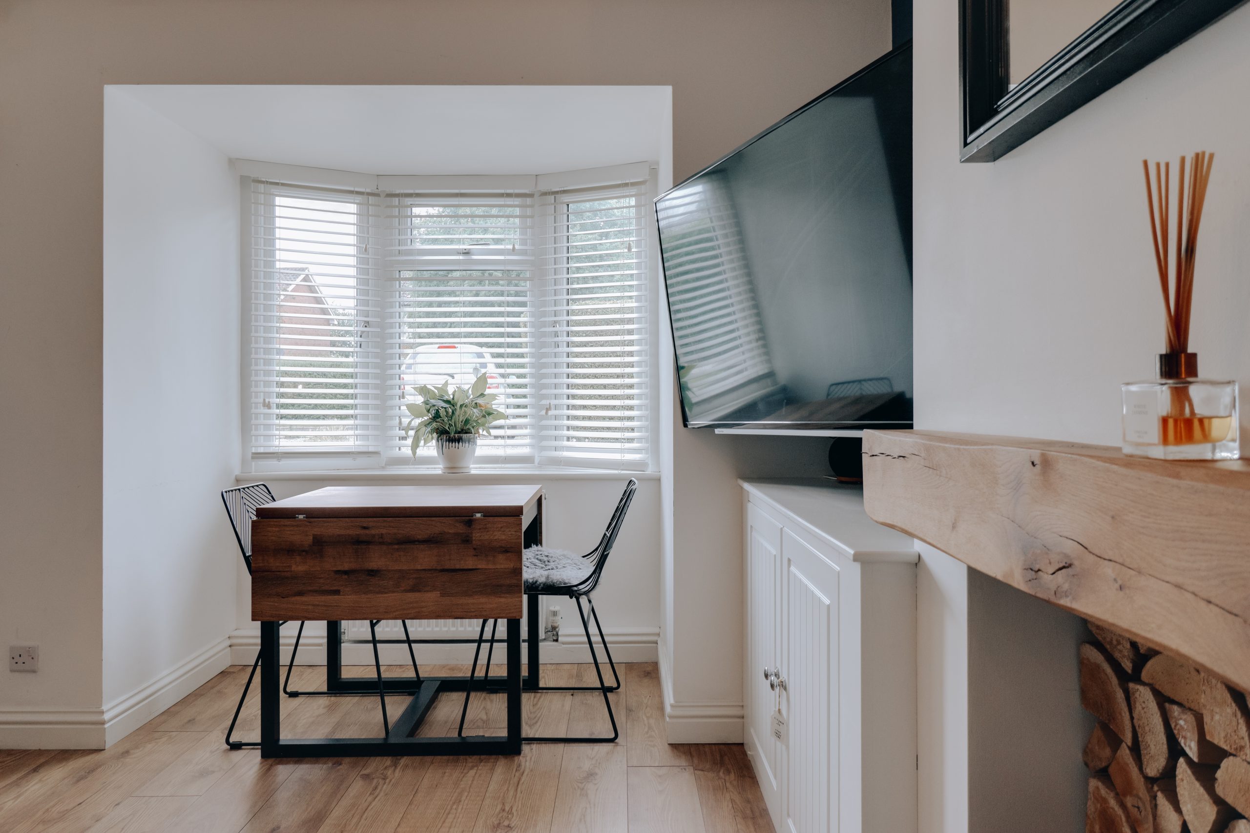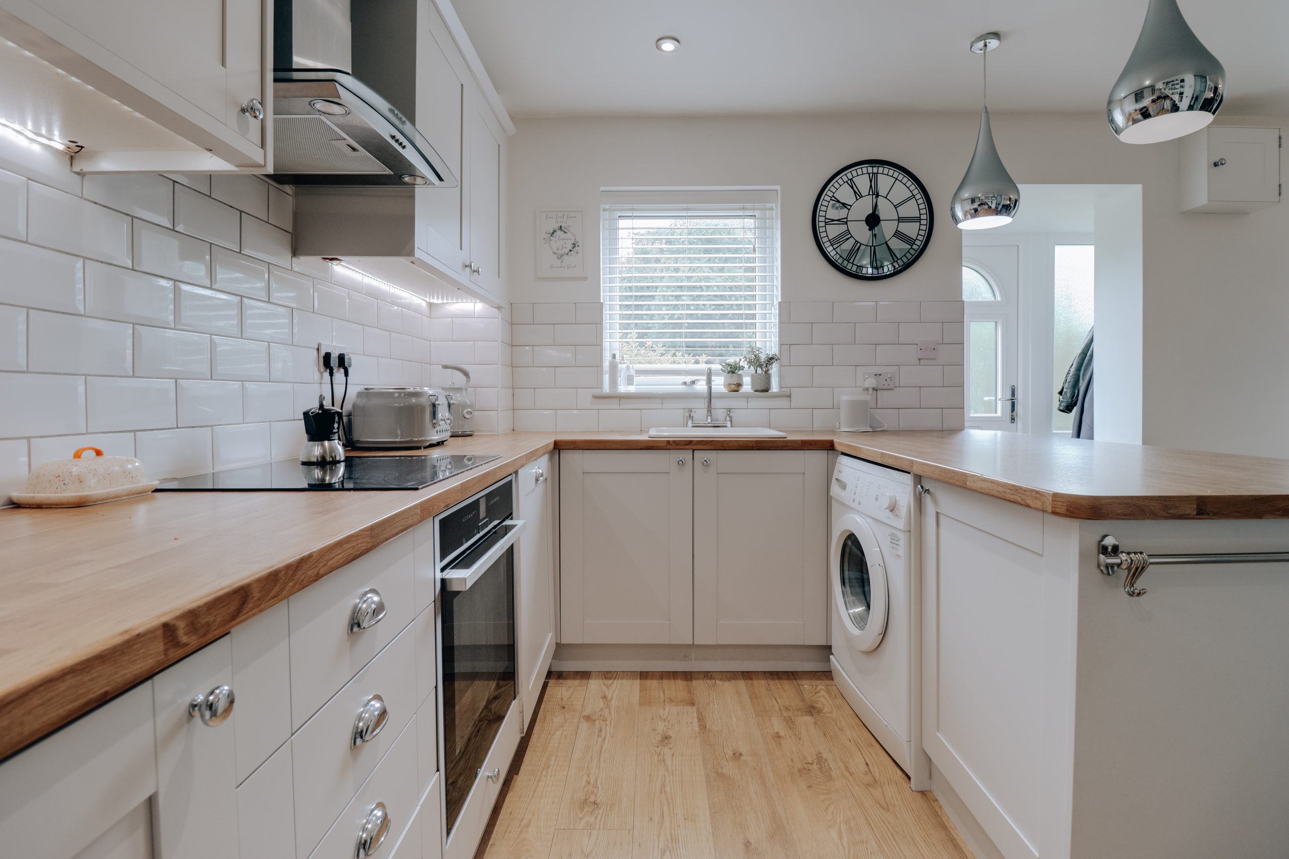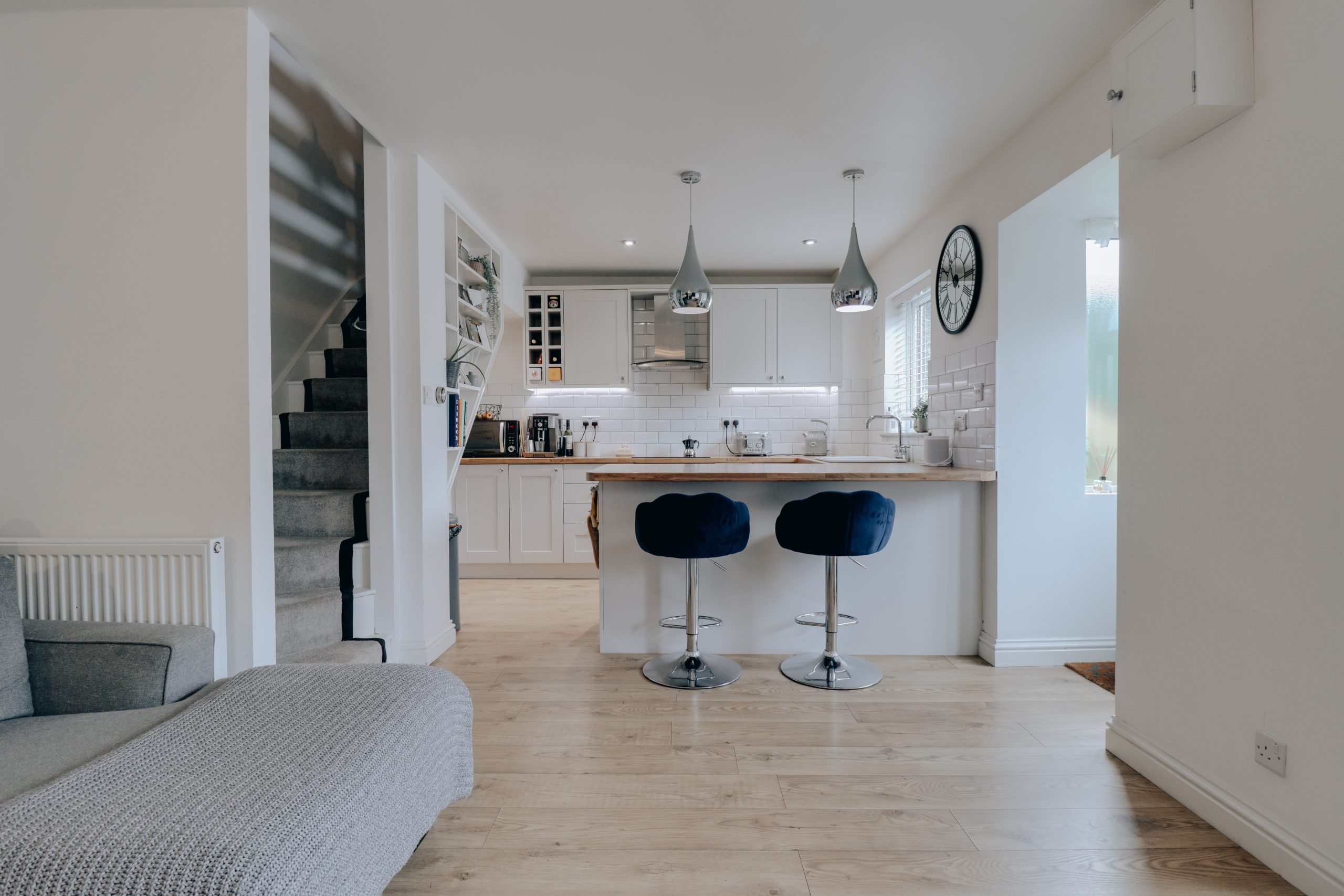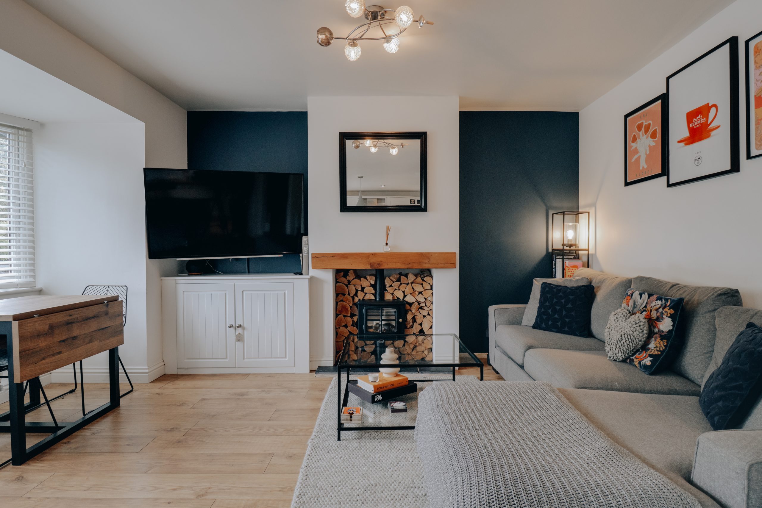 Beyond a smart, low-maintenance front garden, a welcoming porch provides a useful buffer, perfect for coats, boots and bags, before the home opens into a superbly presented open-plan living space measuring approx. 15'2" x 21'6". Designed with effortless flow and modern living in mind, this space stretches the full depth of the house, offering clearly defined zones for relaxing, dining and cooking. There’s a soft, neutral palette throughout, lifted by warm wooden flooring and a rich navy feature wall that adds depth and sophistication. At the far end, the sleek contemporary kitchen comes complete with integrated appliances, streamlined cabinetry, and ample worktop space for home chefs and casual entertainers alike.
