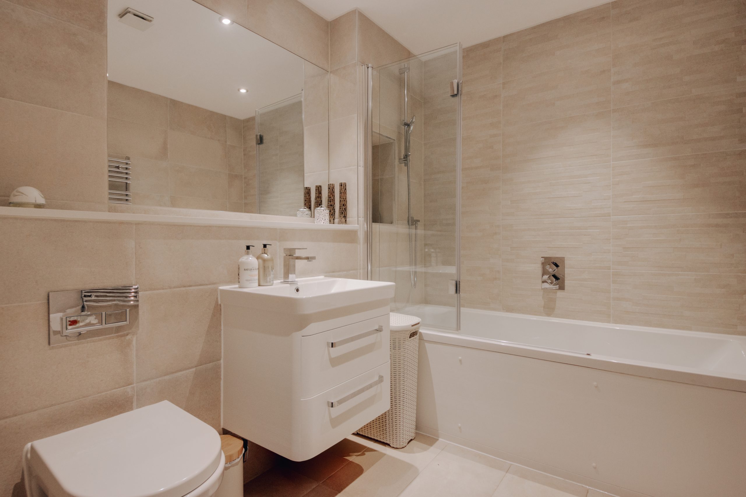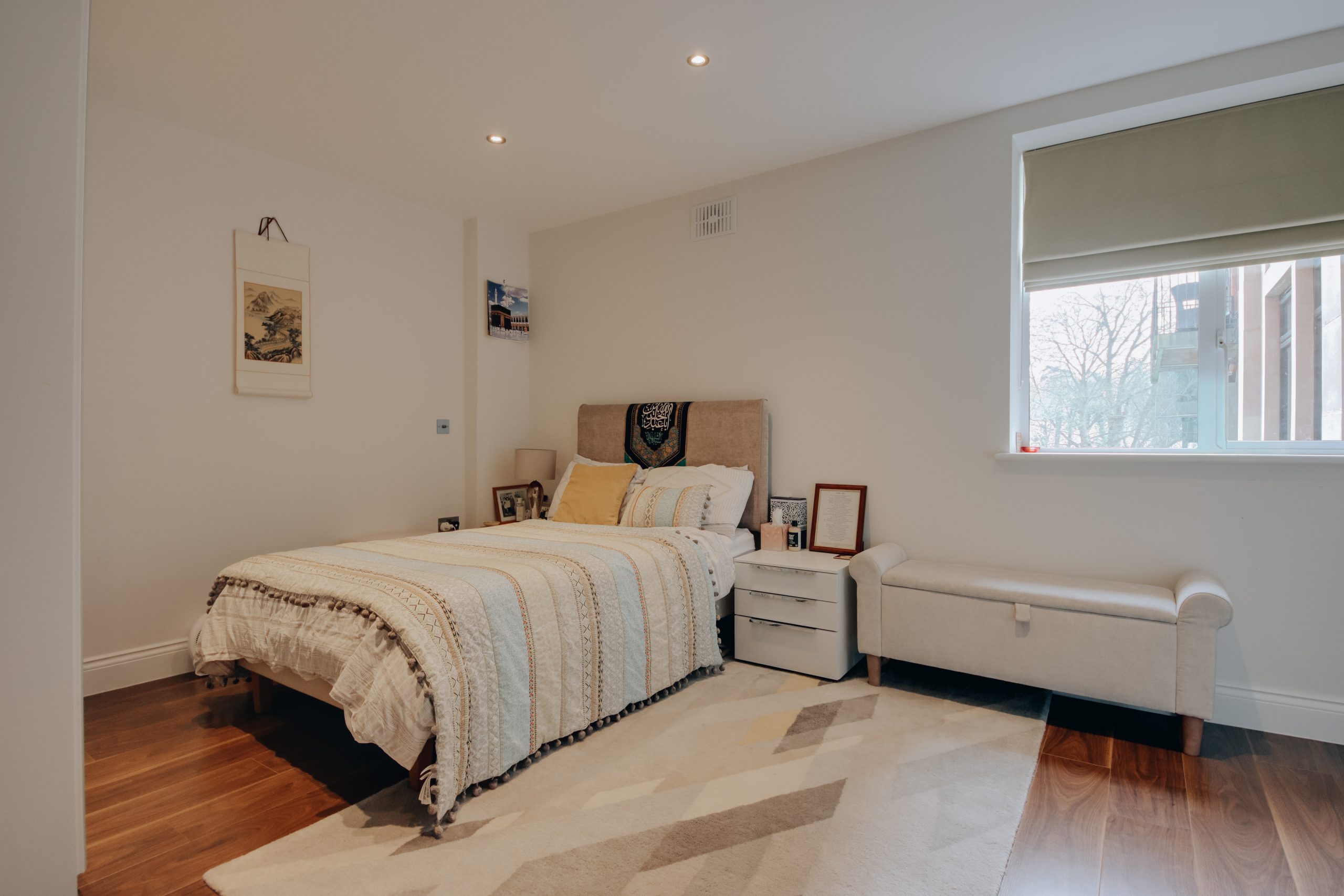 The principal bedroom is a genuine retreat, calm and well-lit, with a contemporary en-suite shower room and integrated cabinetry that absorbs storage without encroaching on the room's sense of ease. The second bedroom, an impressive fourteen feet in length, carries the same unhurried aesthetic and offers real flexibility: a composed guest room, a home office, or something quietly in between. The family bathroom is finished in neutral tile, its freestanding bath complemented by a rainfall shower overhead.