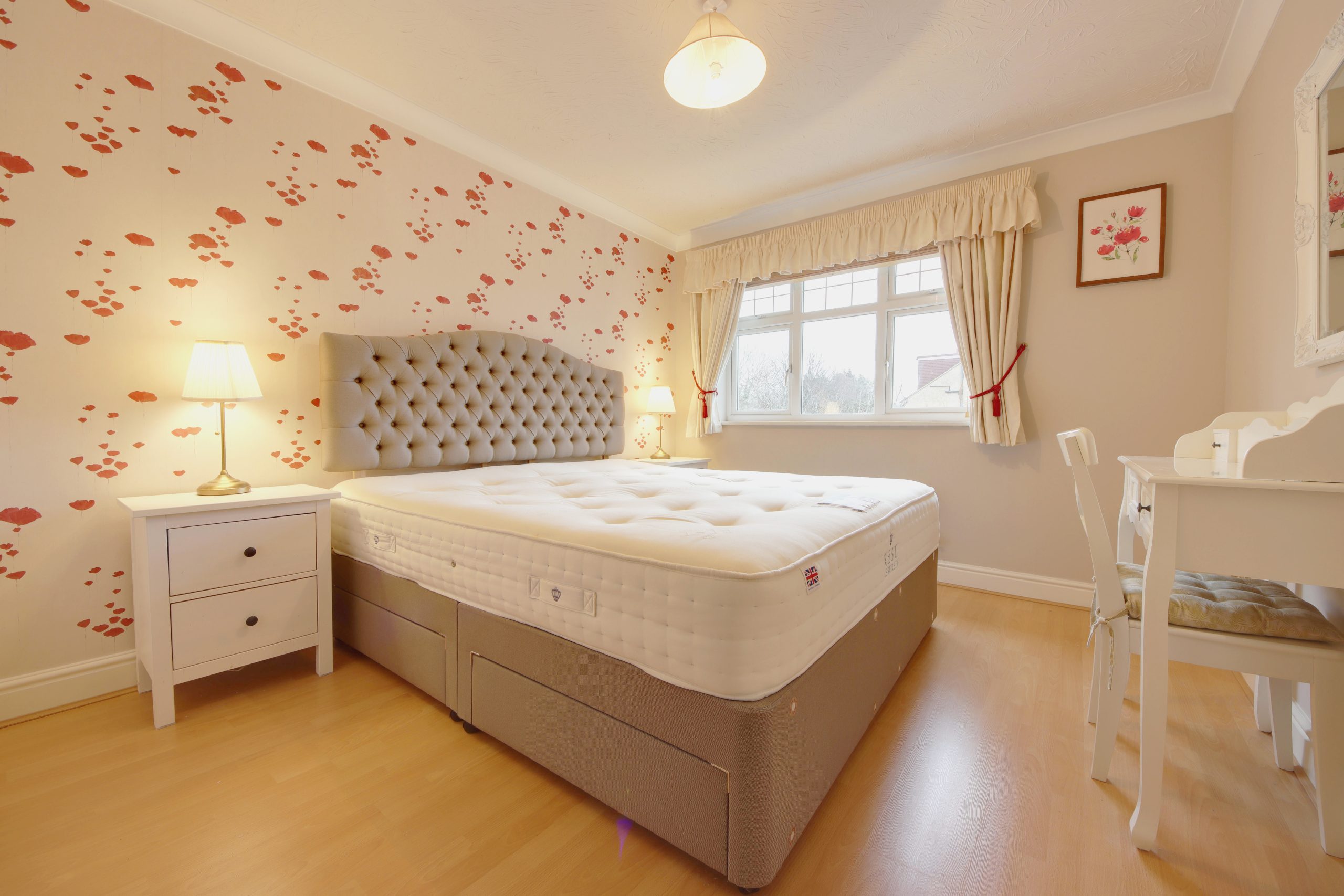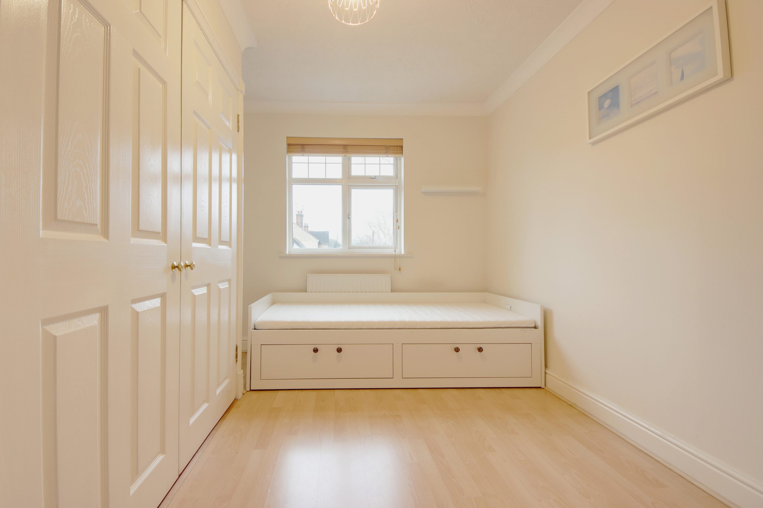The main bedroom, an impressive 15ft space, comes with the added luxury of an en-suite bathroom and in-built cabinetry for extra storage. Completing the property is a family bathroom, elegantly finished in neutral floor-to-ceiling tiles, two large storage cupboards, and a spacious second bedroom.