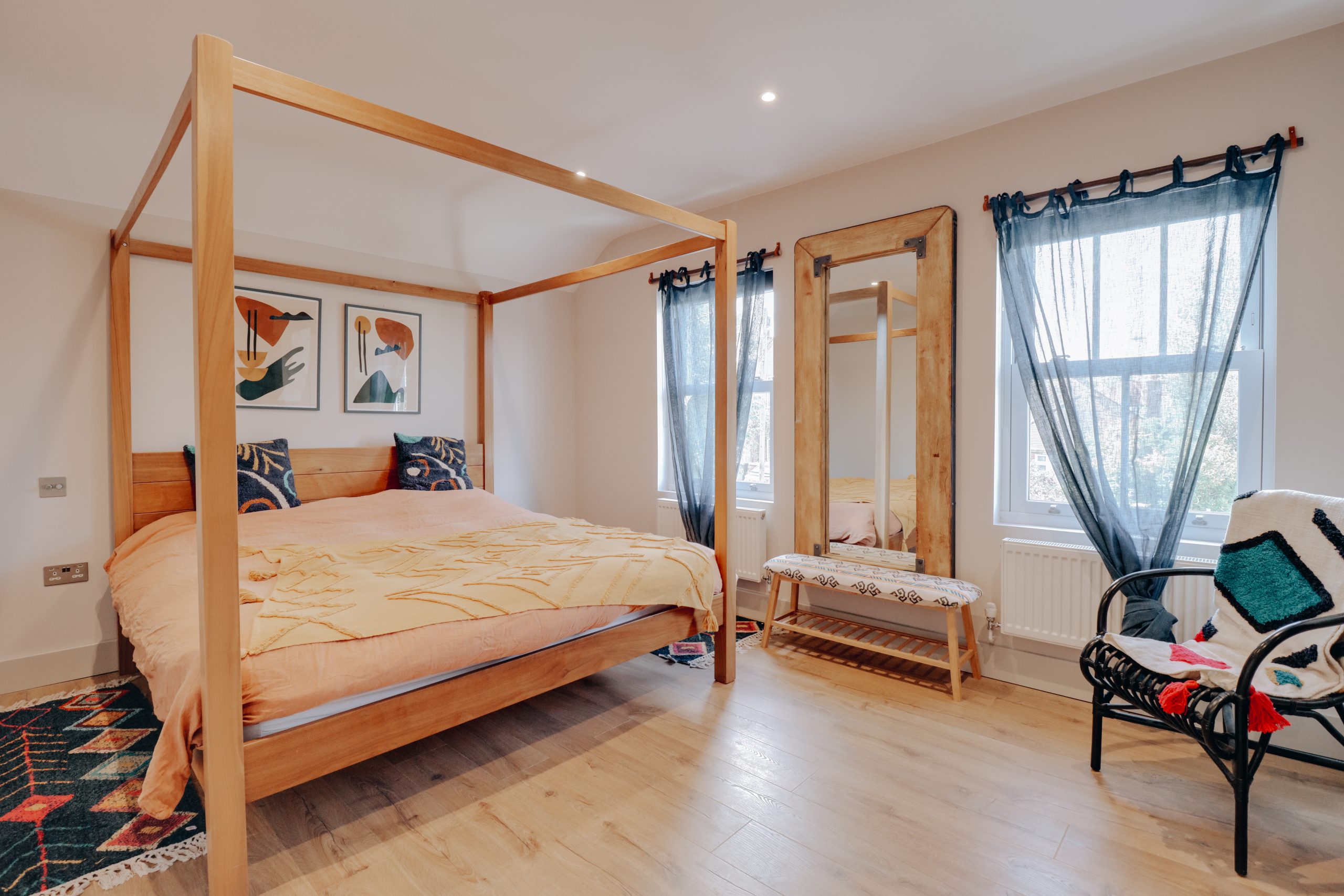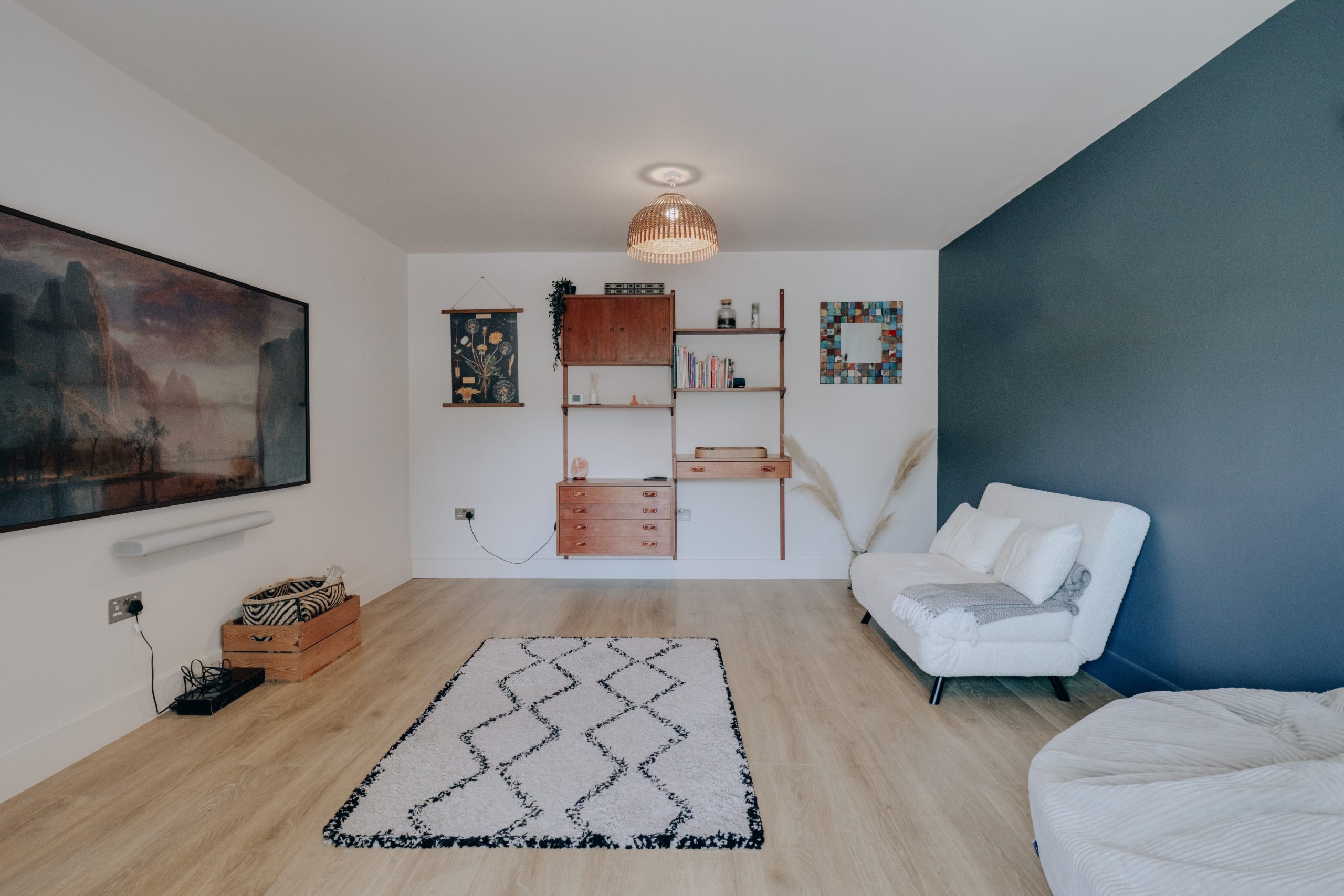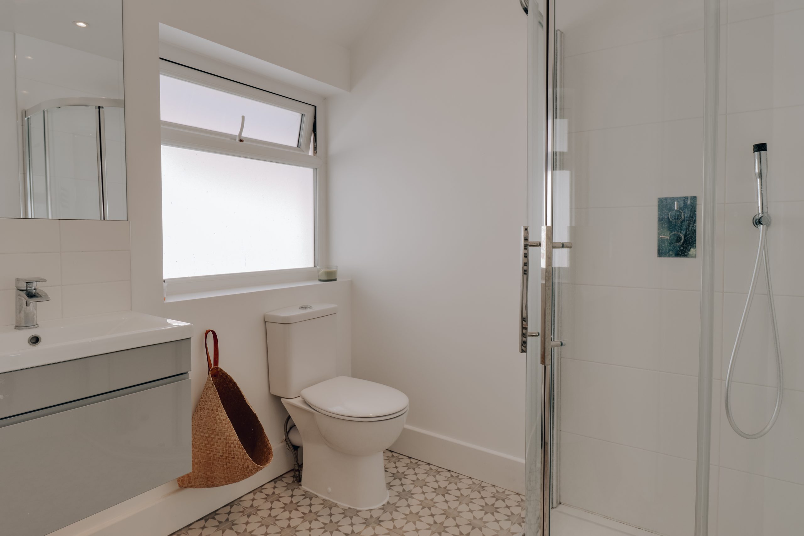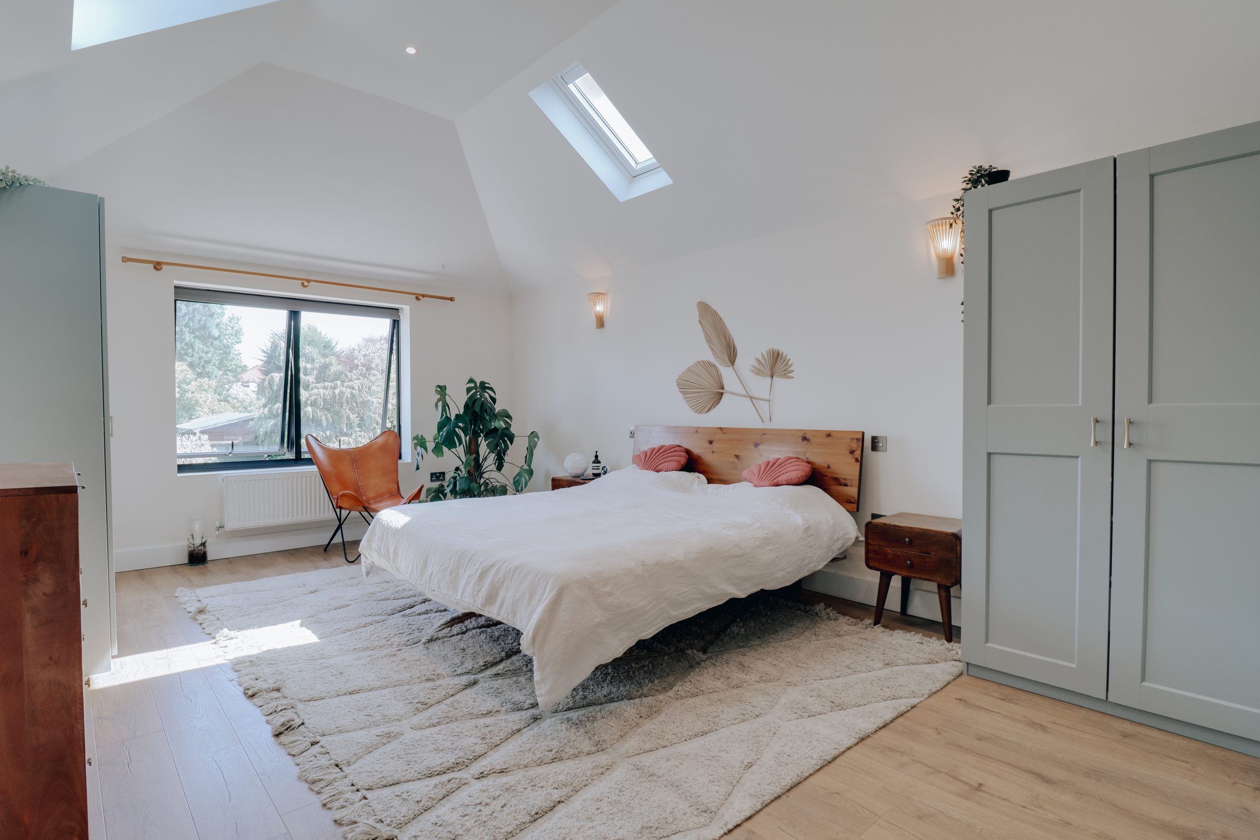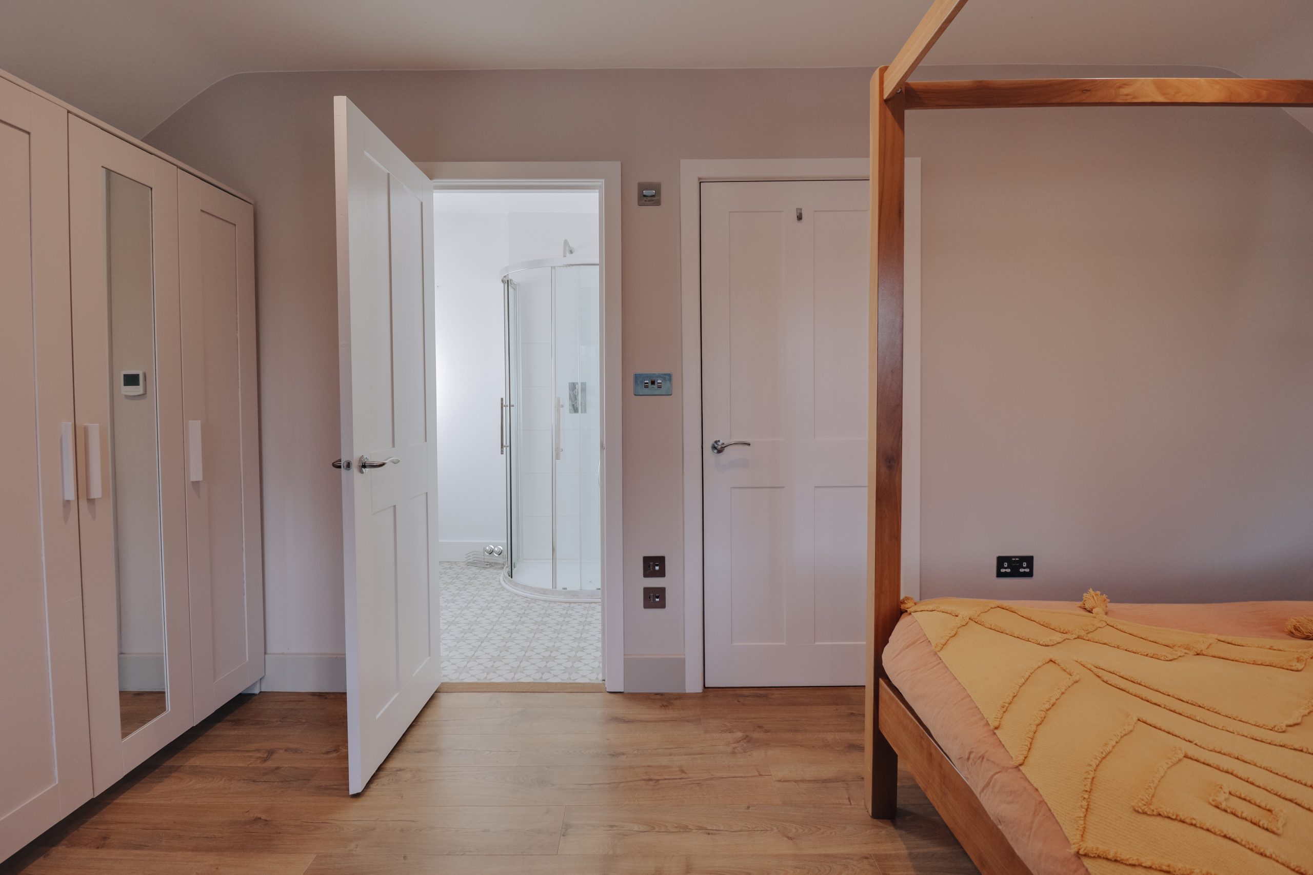 Upstairs, the layout continues to impress. The principal suite, measuring 18'6" x 12'10", is a calming sanctuary with its vaulted ceiling, minimalist whitewashed palette, and striking anthracite-framed windows. Overhead skylights invite natural light to pour in, while the generous en-suite is finished with the same attention to detail seen throughout. The three additional bedrooms all follow a cohesive and refined design language, offering both style and substance. The second bedroom includes its own en-suite wet room, making it an ideal guest suite. The family bathroom has been curated with equal care - a freestanding bath with overhead rainfall shower, set against crisp white tile slips, feature-painted walls, and a striking abstract tiled floor, offers both comfort and visual intrigue. Additional highlights include wired infrastructure for internet boosters in each room, CCTV installation points, and clever storage solutions, including attic access and multiple built-in options throughout the home.
