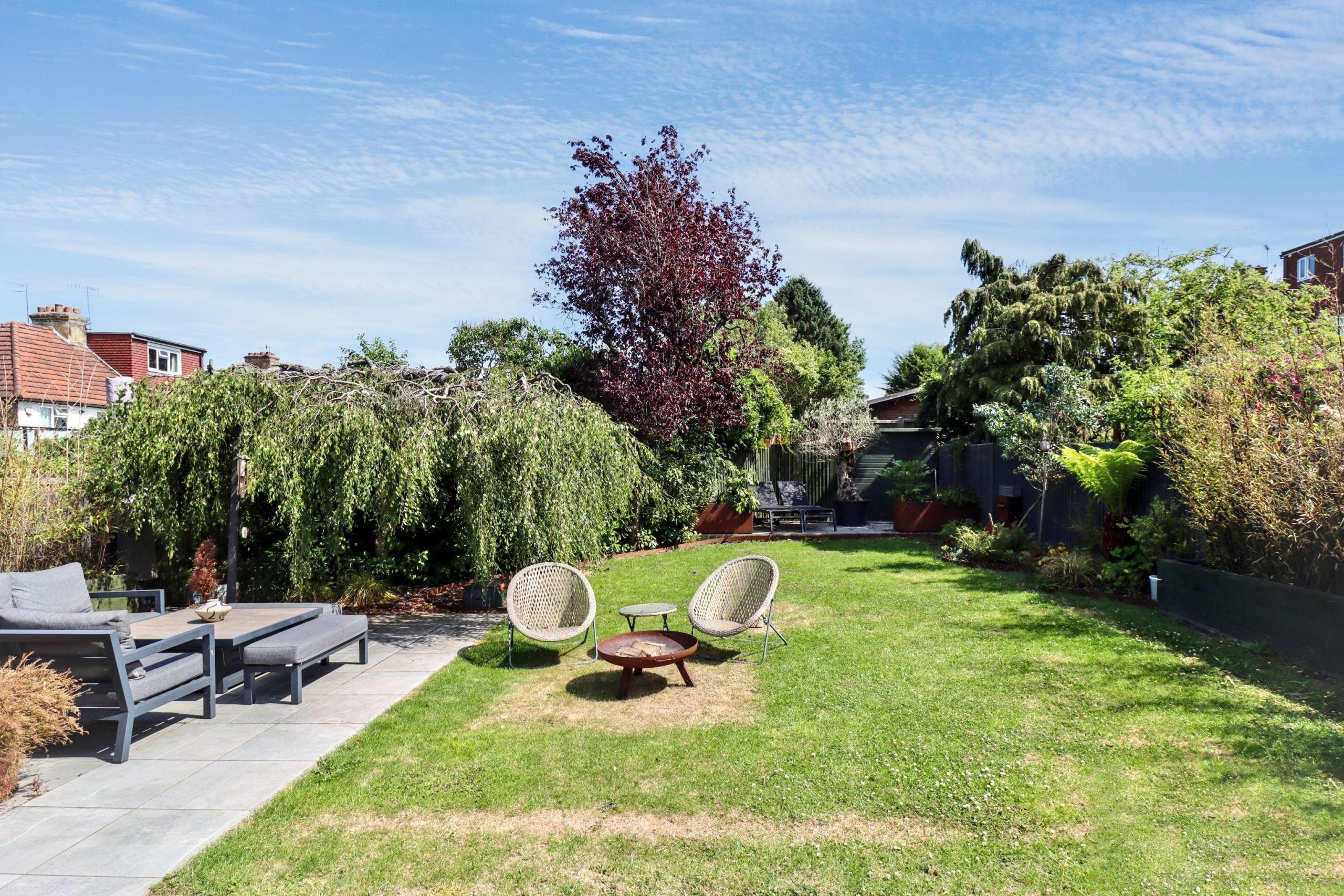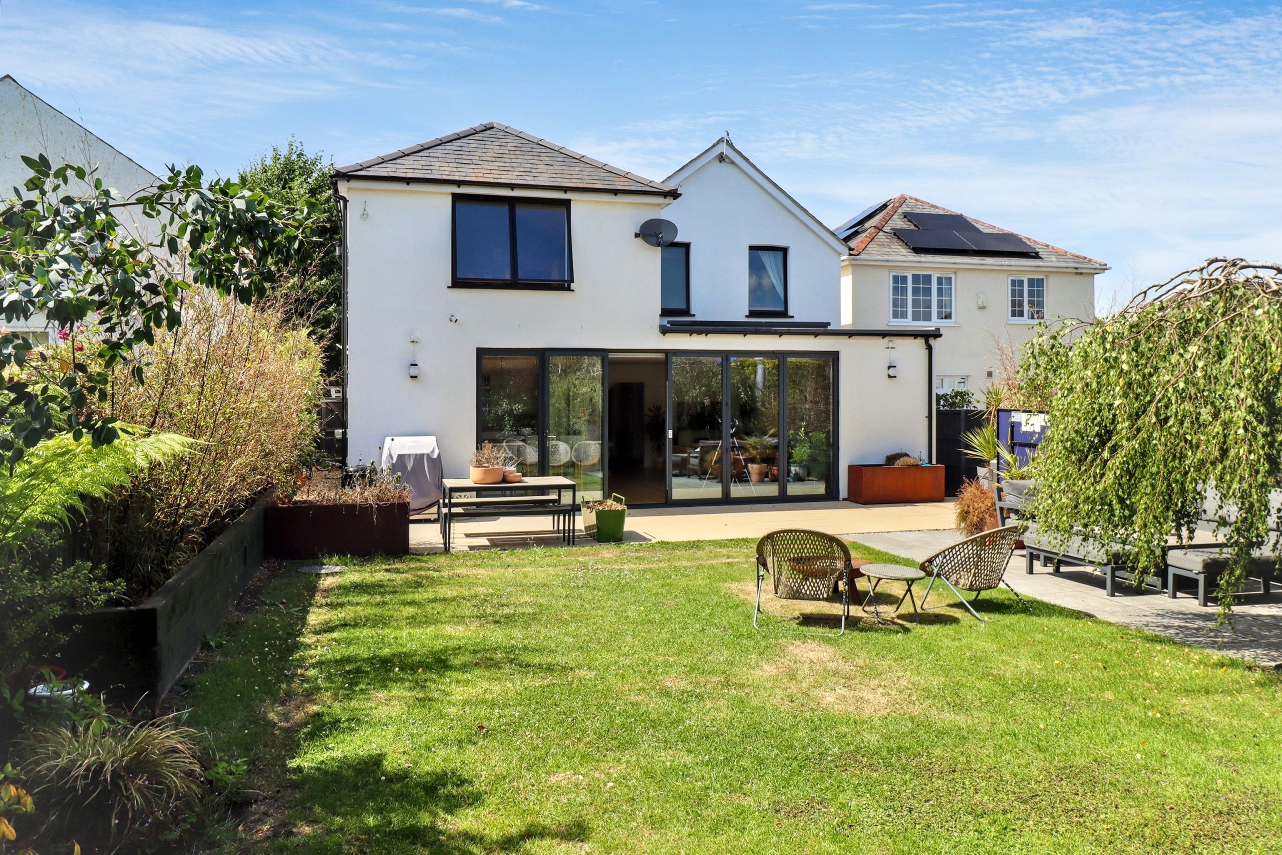 To the rear, the beautifully landscaped south-easterly facing garden has been designed as an extension of the home’s effortless style. A generous stone patio, perfectly levelled to align with the internal floorplan, creates a natural flow from the kitchen and dining space. Raised beds frame the patio with greenery and seasonal interest, while the well-kept lawn beyond provides ample space for outdoor entertaining, relaxation, or family life. Whether hosting summer soirées or enjoying a peaceful morning coffee, this garden offers the ideal balance of design and usability - a true finishing touch to a home created with modern living in mind.