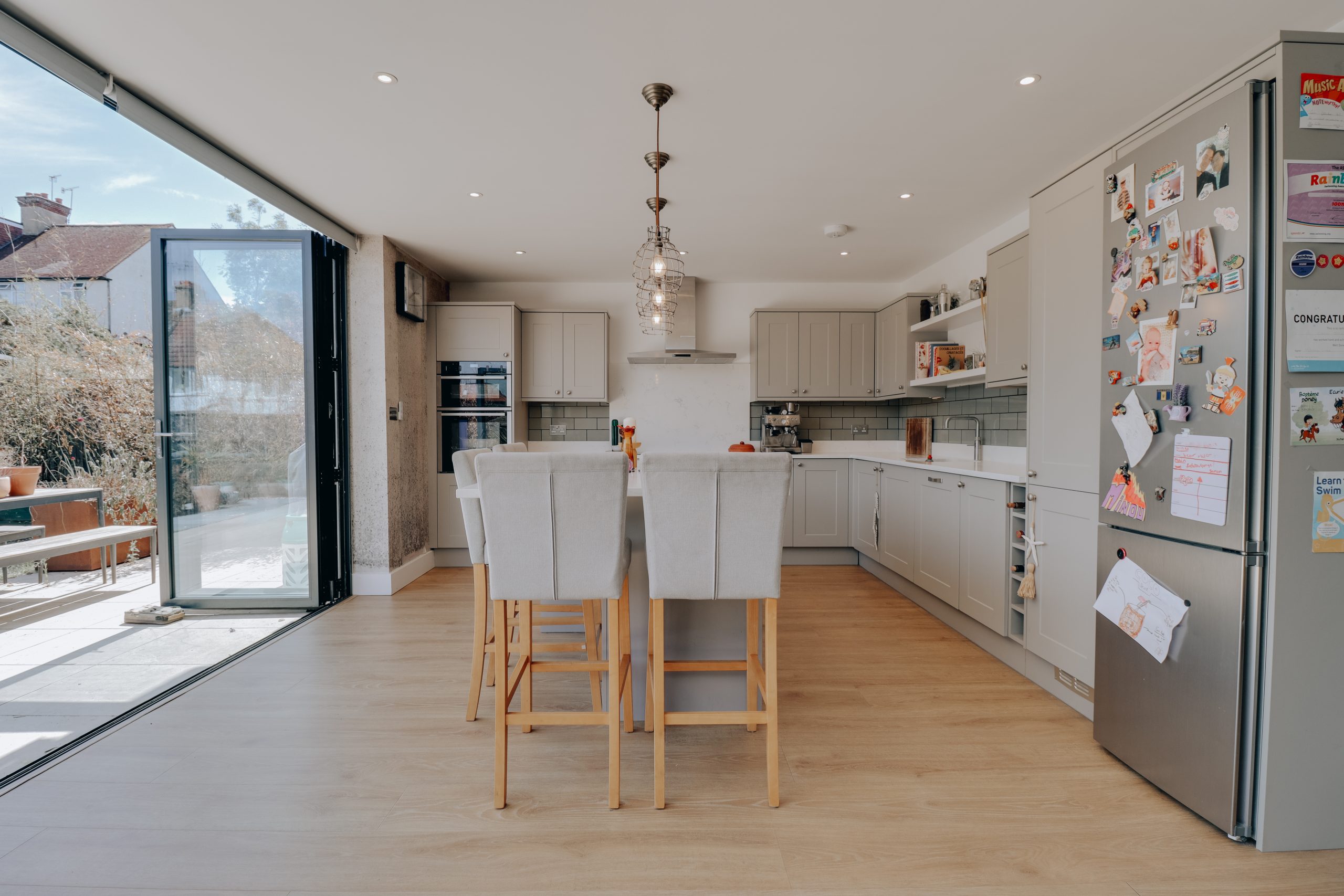 Step inside and you’re met by a wide, welcoming hallway - the central artery from which each beautifully considered space unfolds. To the right, a generous second reception room (16’11” x 12’10”) currently serves as a media room but could just as easily be a playroom, formal lounge or guest suite. Every detail, from the engineered wood flooring to the bold navy feature wall and large bay window, has been selected for both impact and comfort. At the rear, the open-plan kitchen/living/dining area is the undisputed heart of the home - a spectacular, light-filled showpiece that’s been designed with entertaining in mind. Almost 30ft wide, this space is illuminated by expansive bi-folding doors, a feature skylight, and clever LED perimeter lighting that adjusts with the mood. The kitchen itself blends form and function effortlessly: a central island offers casual seating, while the surrounding cabinetry houses a brand-new wine fridge, boiling water filter tap, dual oven, and flush induction hob - every appliance meticulously chosen to elevate the everyday. The ground floor also hosts a third reception room (ideal for home working), a utility room with a secondary sink, water softener, and additional hot water cylinder to meet increased demand when hosting guests. There is also a stylish WC, and the entire ground level benefits from underfloor heating, part of a system that extends throughout approximately 80% of the house.