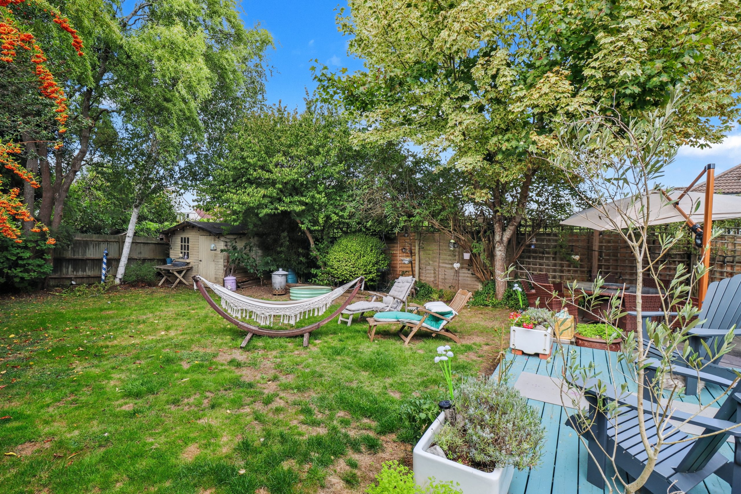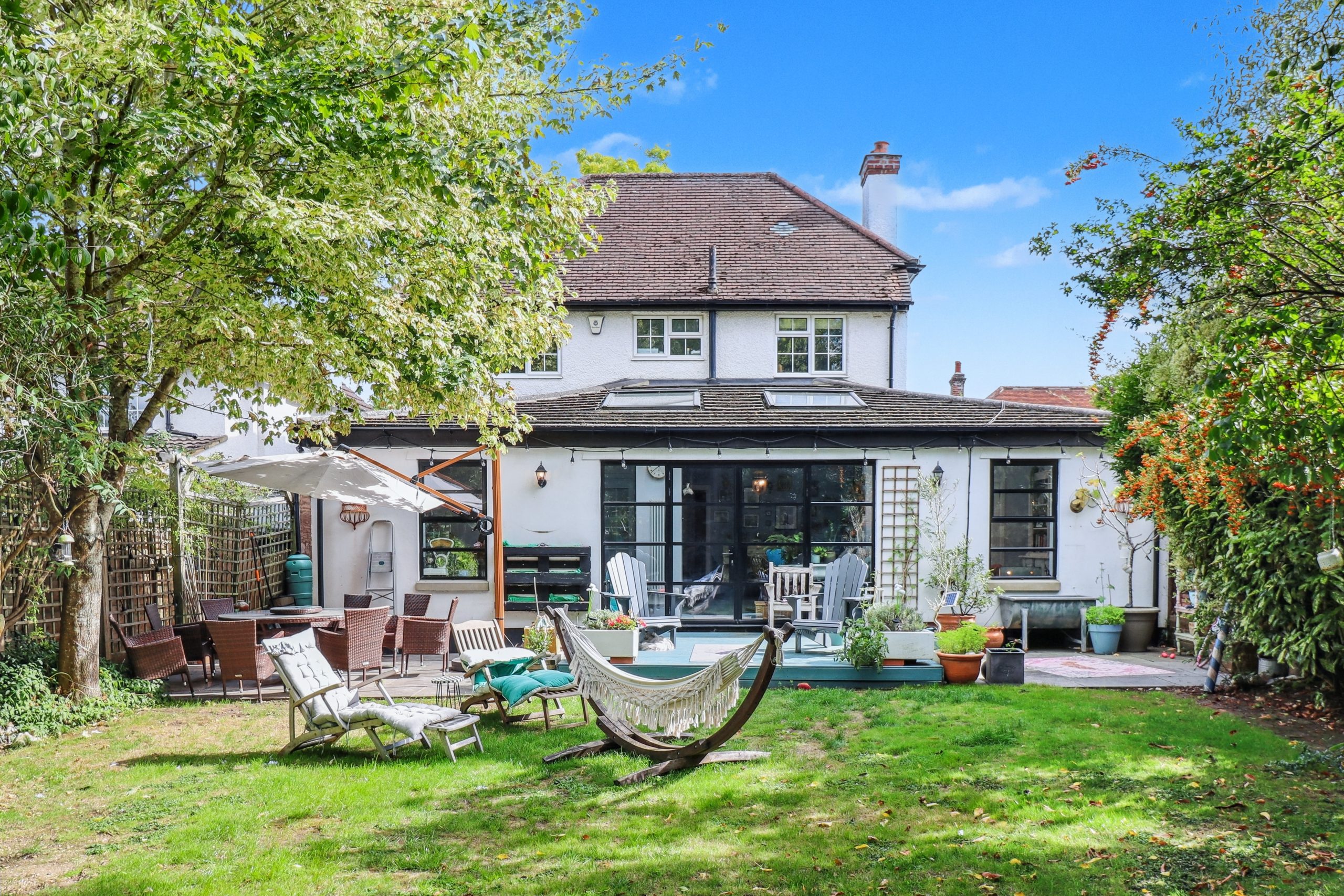 To the rear, the landscaped north-easterly garden feels like a natural continuation of the home itself. A blue decking, set flush with the internal floor level, opens directly from the kitchen and dining area to create a seamless indoor–outdoor connection. Raised beds bring structure and seasonal colour, while the lawn beyond offers a generous stretch of green for both relaxation and play. Whether it’s summer evenings spent with friends or quiet mornings with a coffee, the space combines style with practicality, making it a fitting complement to the house.