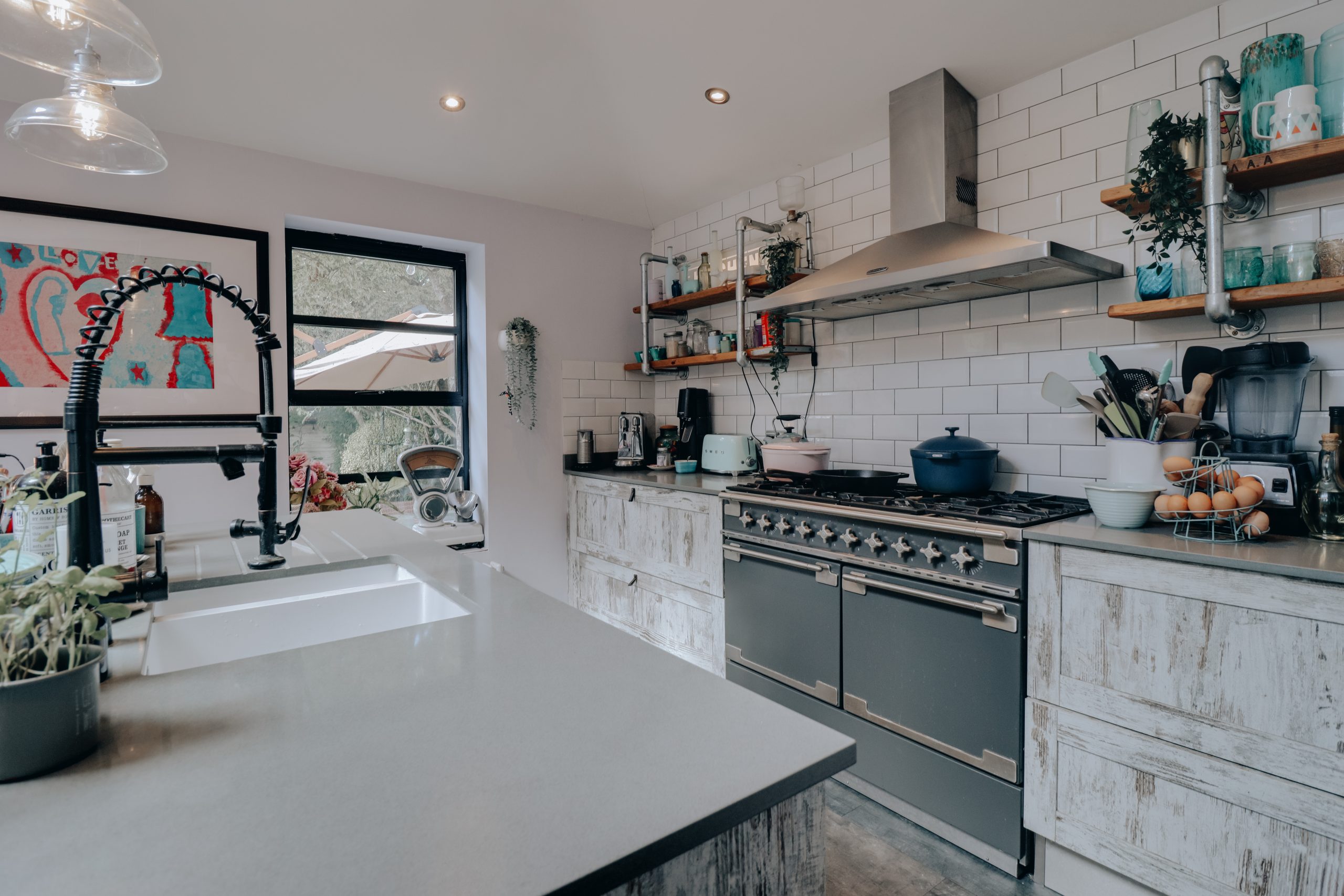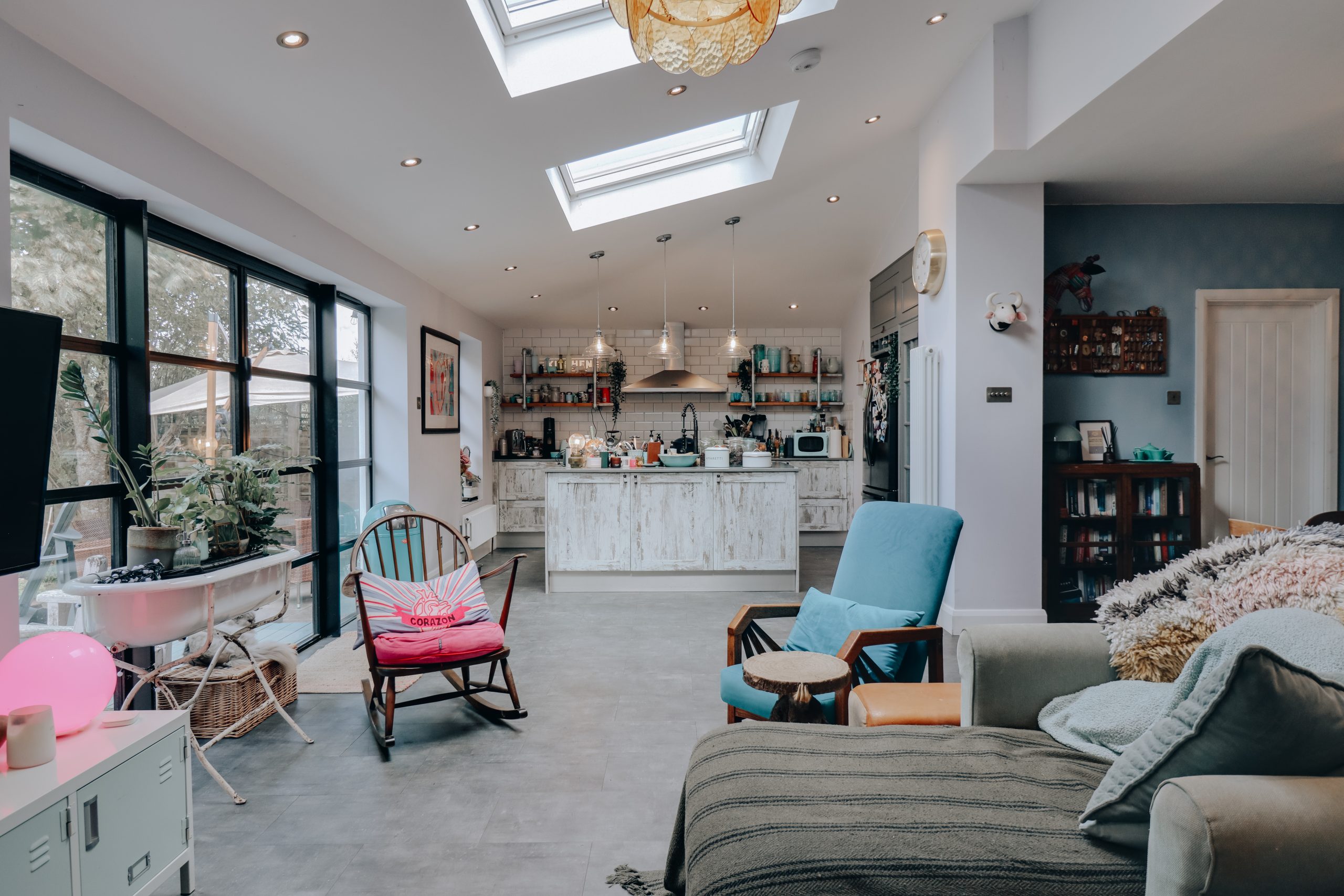 Step inside and a wide, welcoming hallway sets the tone; a central artery from which the home’s beautifully balanced spaces unfold. To the right, a generous second reception (17’ x 11’11”) offers genuine versatility. Currently arranged as a guest suite, it could just as easily become a playroom, an elegant lounge, or a creative studio – a room ready to flex with the needs of modern life. The rear of the house reveals its defining feature: a remarkable open-plan kitchen, living, and dining space that serves as the true heart of the home. Spanning almost 34 feet in width, the T-shaped design is a statement in both scale and natural light. Expansive glazing frames the garden while a series of skylights bathe the interior in sunshine throughout the day. Designed with entertaining in mind, the proportions allow for both relaxed family living and large social occasions, striking a rare balance between comfort and sophistication. The kitchen combines elegance with efficiency. A generous central island anchors the room, while sleek cabinetry conceals a suite of carefully chosen appliances, including a bold five-point gas hob. What was once part of the original kitchen has been cleverly repurposed into a walk-in larder – ideal for storage or as a discreet prep area when hosting. Completing the ground floor is a separate utility room and a stylish WC with side access, offering easy connection to both the garden and driveway and adding further practicality to the home’s thoughtful design.