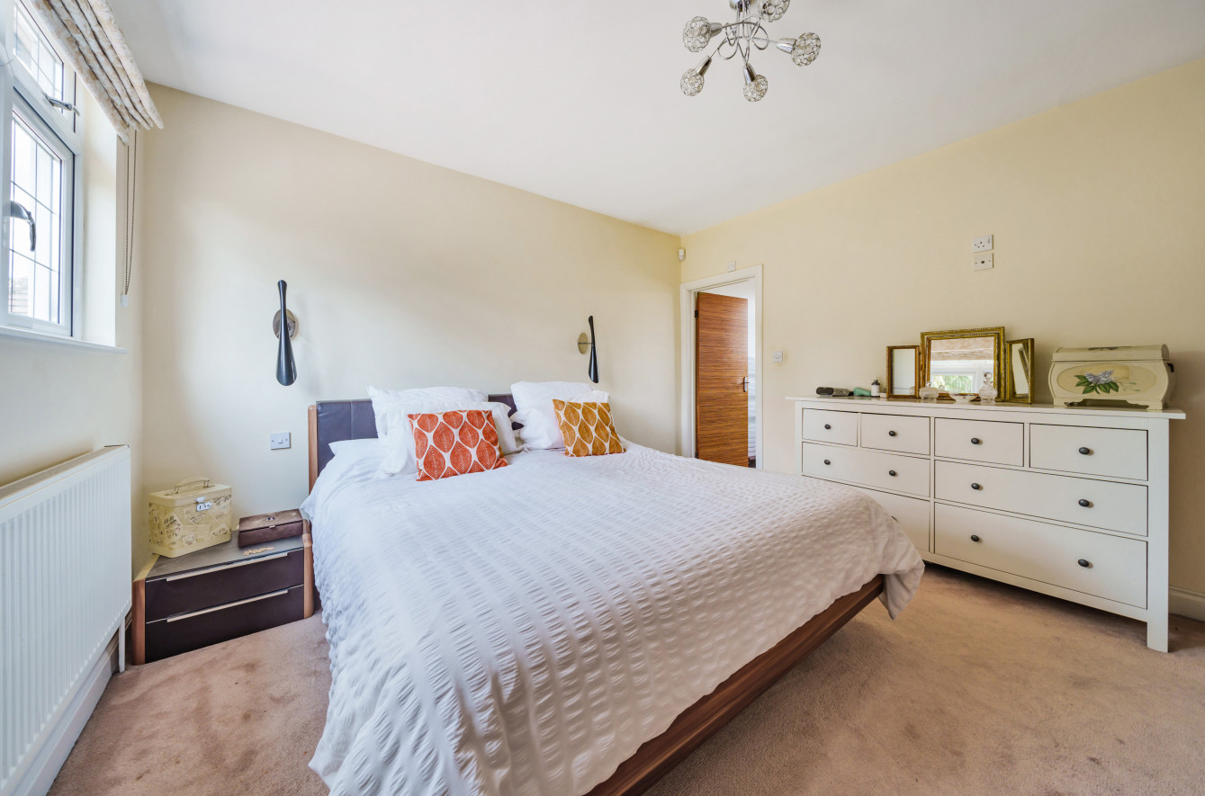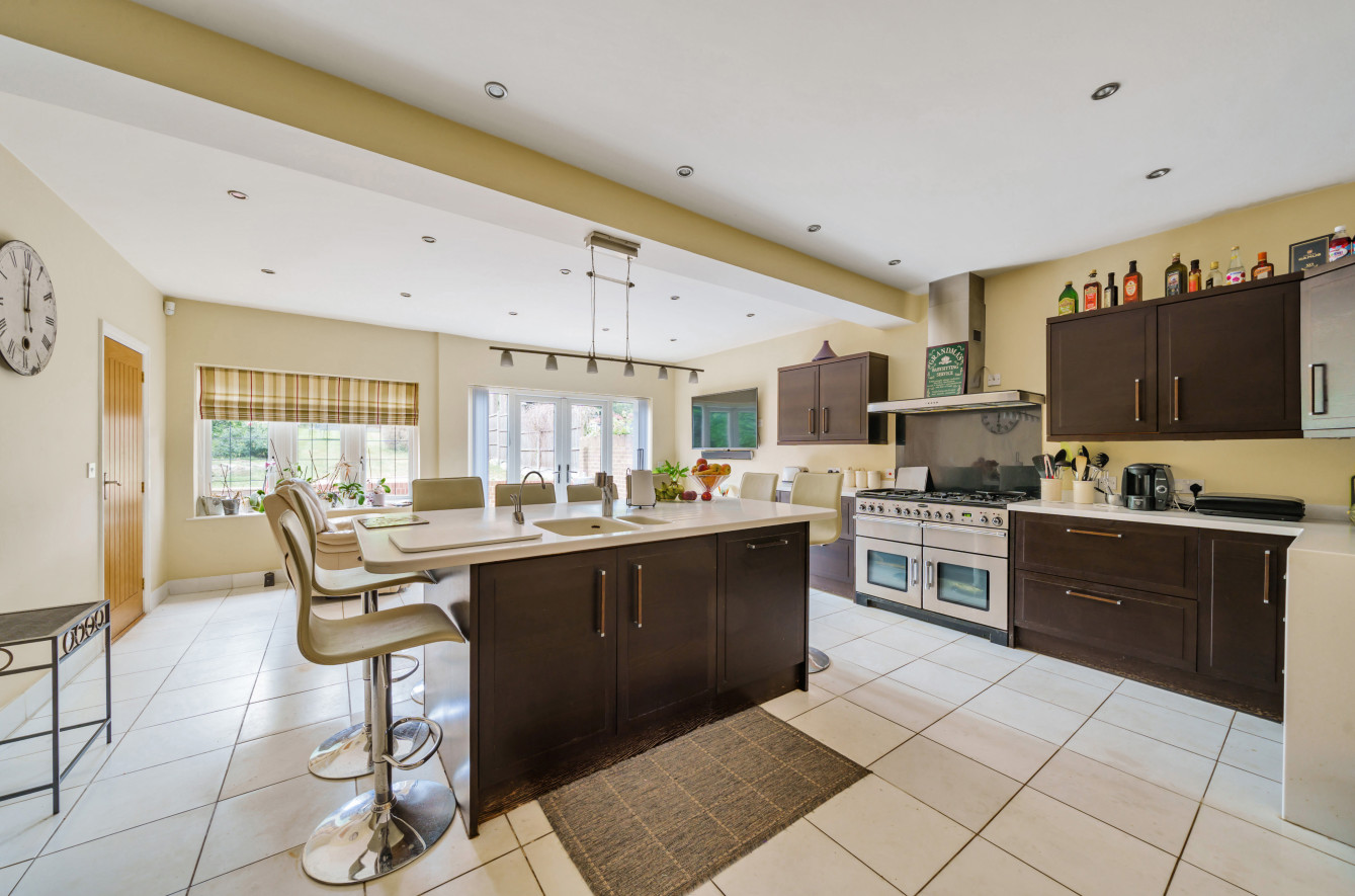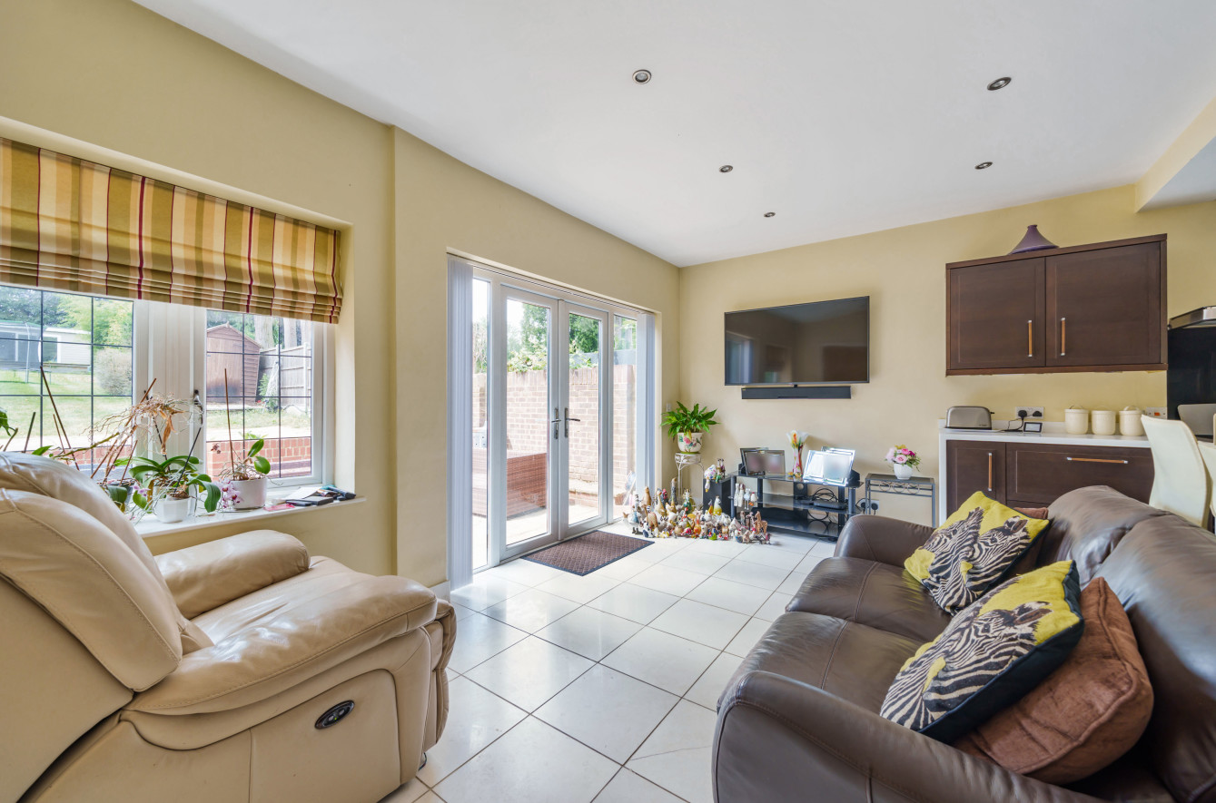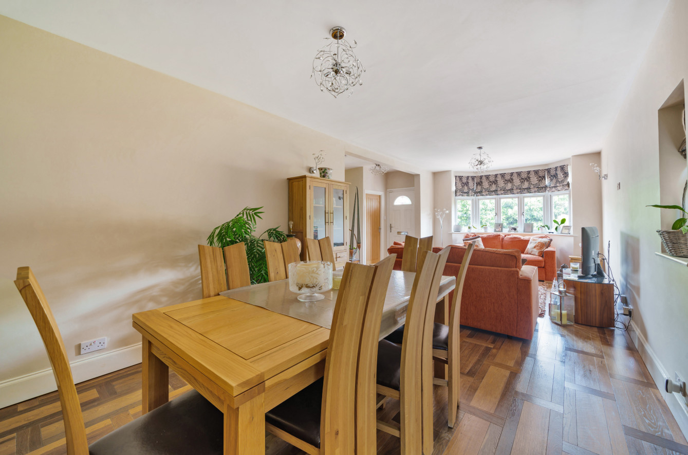 The front door opens onto a central hallway, offering direct access to the property's two main living spaces. To the left, a 28ft, open-plan living/dining room is situated at the front of the plan. A generous bay window with feature roman blinds serves as the focal point, while the dining area, located at the back of this space is home to a large table, sitting amidst an array of quality free-standing furniture. Unmistakably modern, the fully-integrated kitchen lies at the rear of the plan, where mahogany cabinetry works in harmony with the neutral walls and tiled flooring. The ground floor is completed by a 11ft bedroom with an en-suite shower room, currently being used as an office with superb views onto the rear garden.