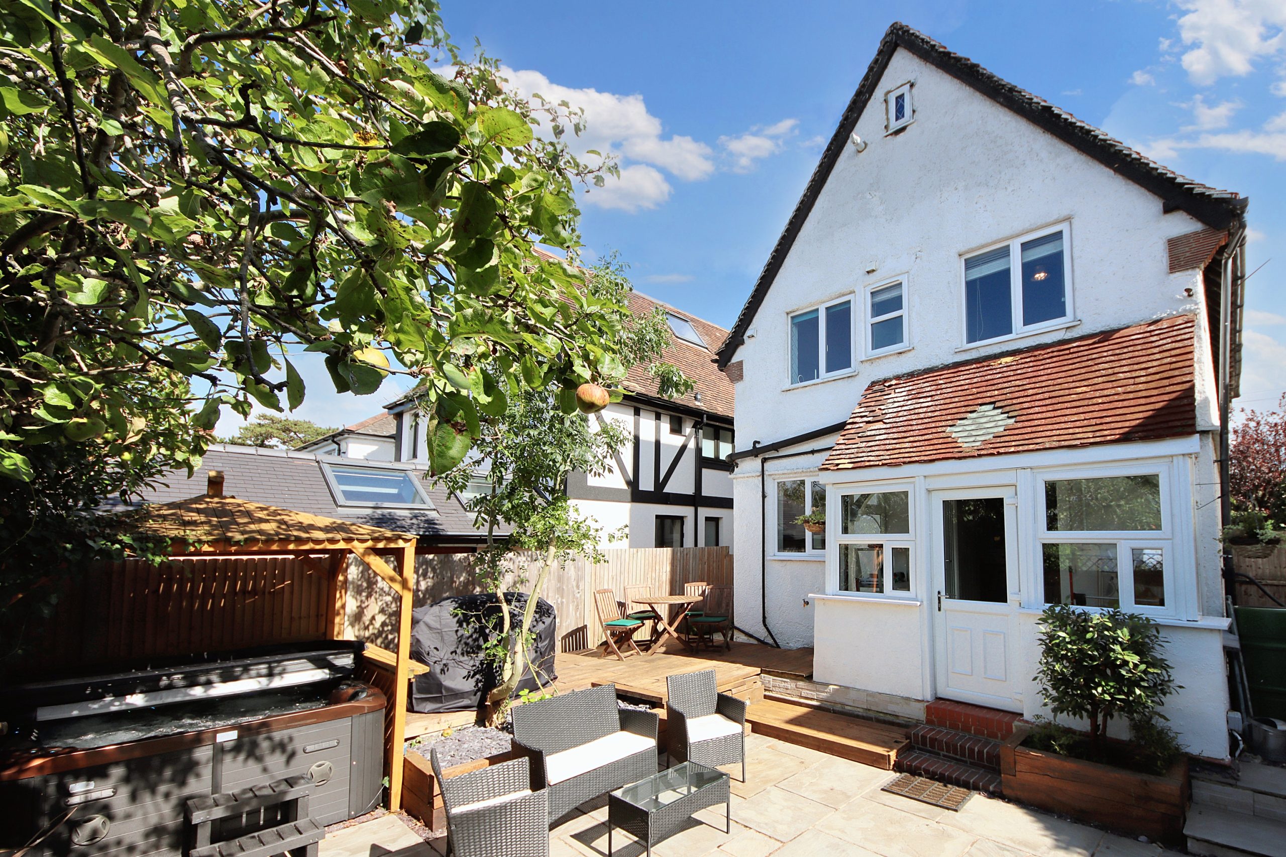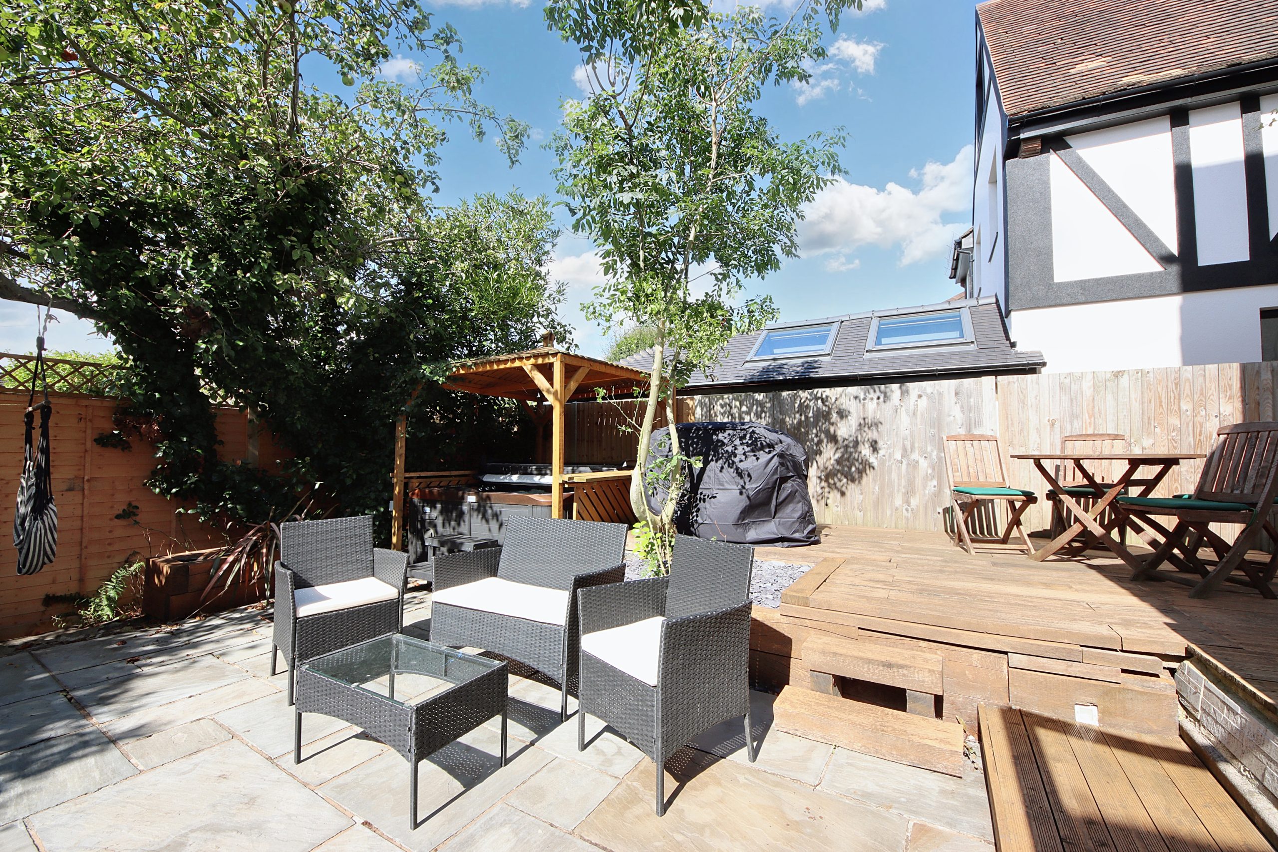 The property extends further to the rear, where a private, west-facing garden awaits. A large patio area, accessible via steps from the kitchen’s adjacent utility room, provides the ideal setting for outdoor relaxation and entertaining. Cleverly designed zones within the garden include a raised decking area, perfect for al fresco dining. A luxurious five-person hot tub completes this serene outdoor space, and is available for purchase with the property.