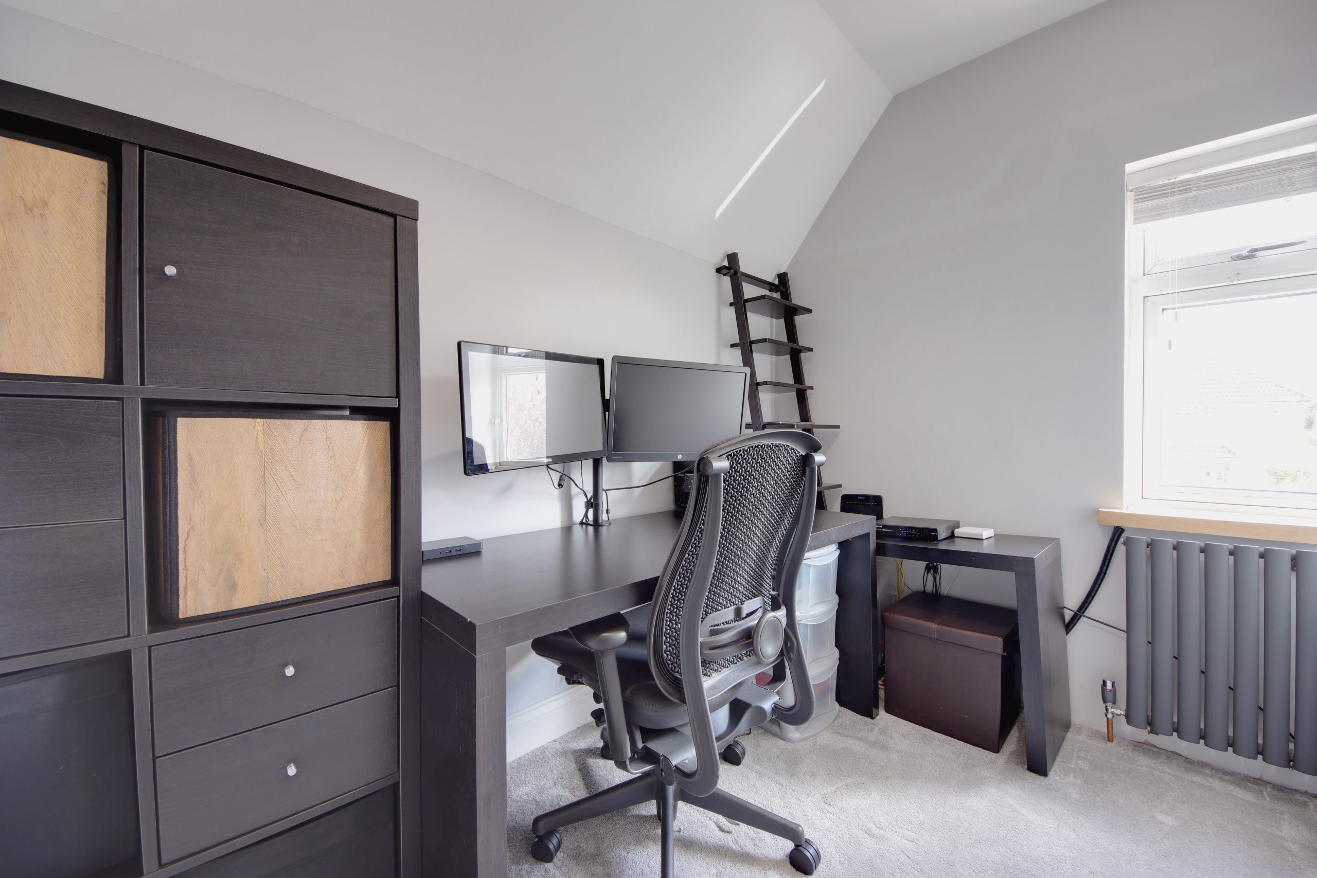 Upstairs, the first floor houses three spacious bedrooms, with one currently being used as a home office. The second bedroom features an en-suite bathroom, equipped with a state-of-the-art walk-in shower complete with body jets, a luxurious rainfall showerhead, and integrated radio. This shower can even be converted into a steam room for added relaxation. The principal bedroom is equally impressive, with bespoke built-in cabinetry and large, easterly-facing windows that invite ample morning light.