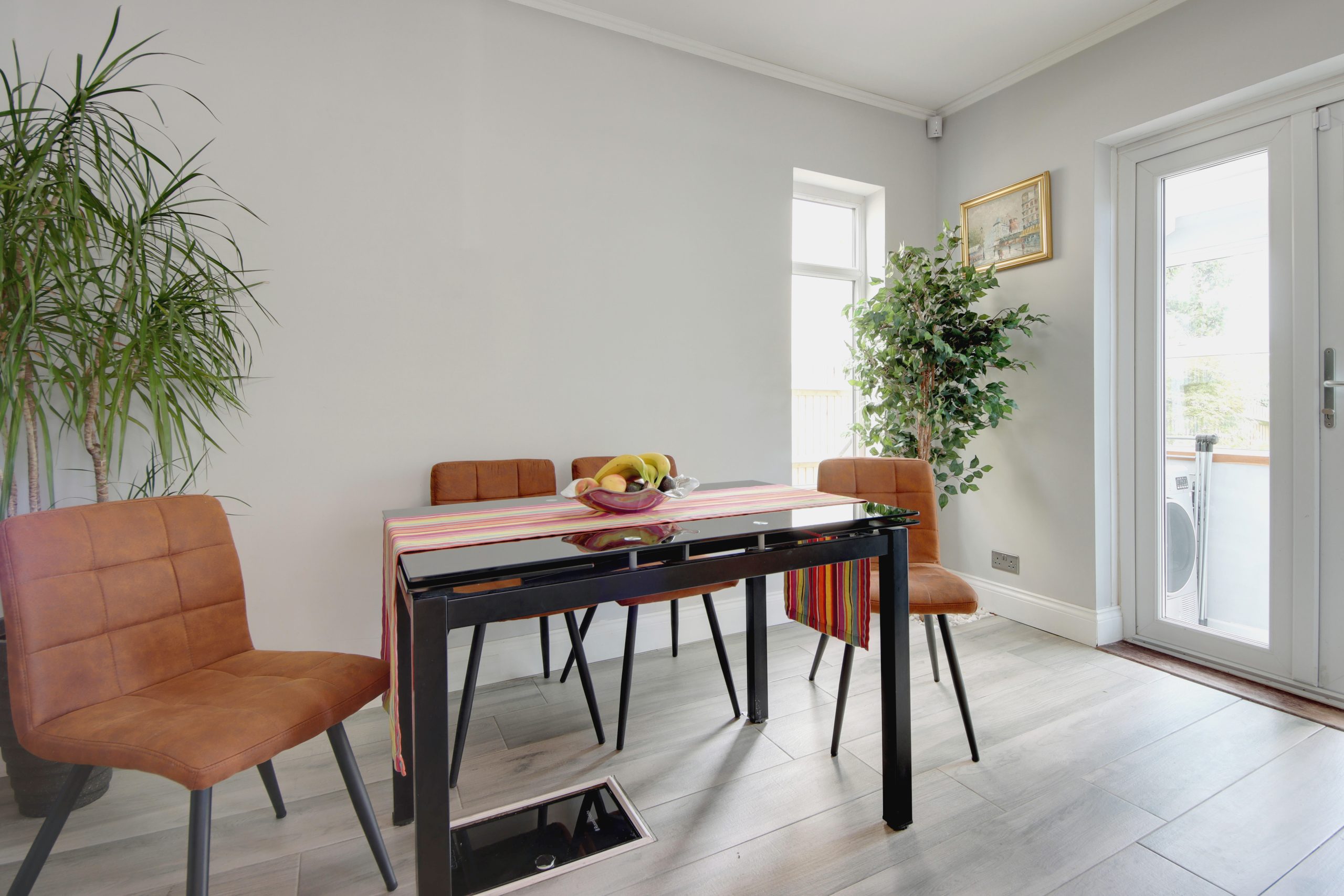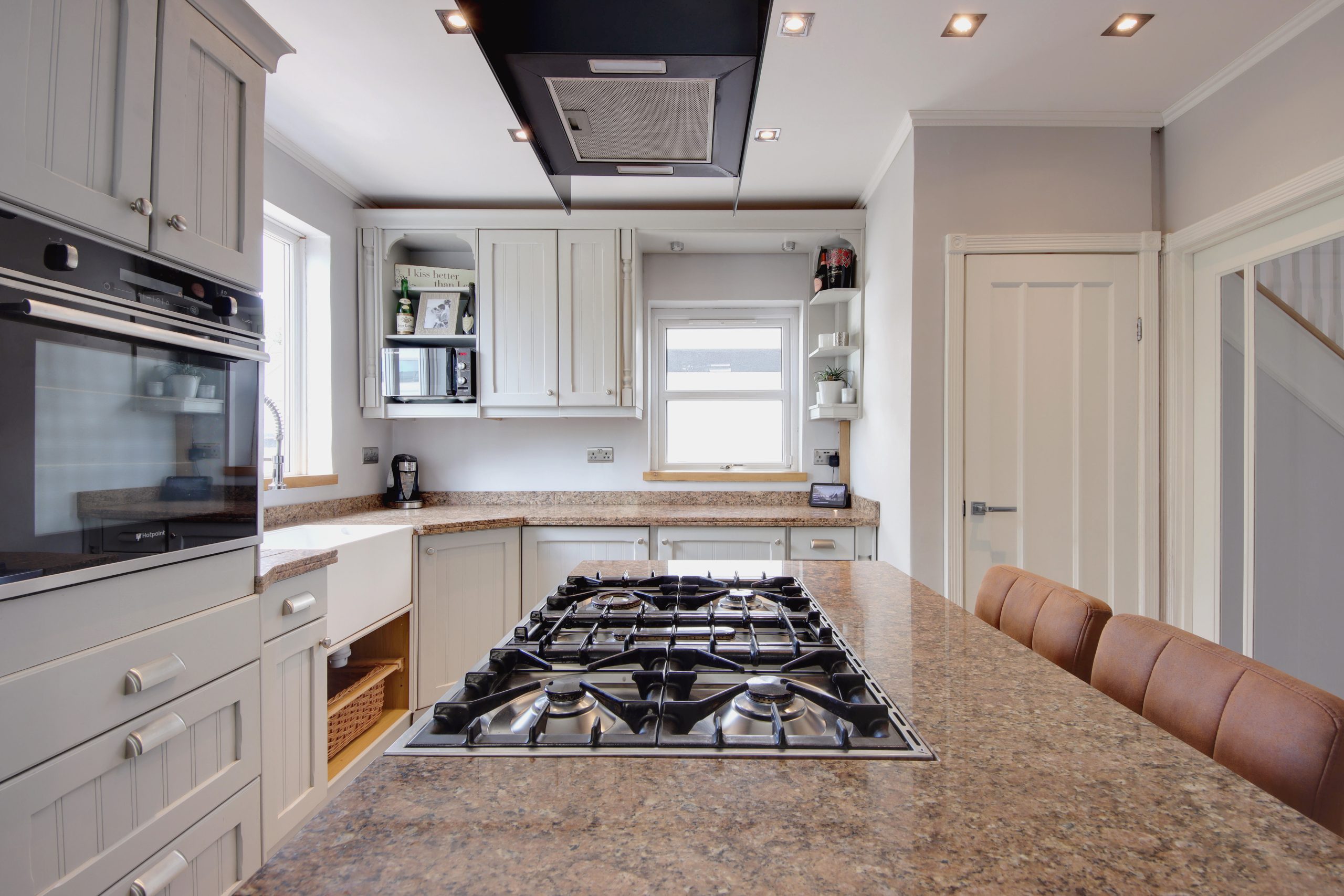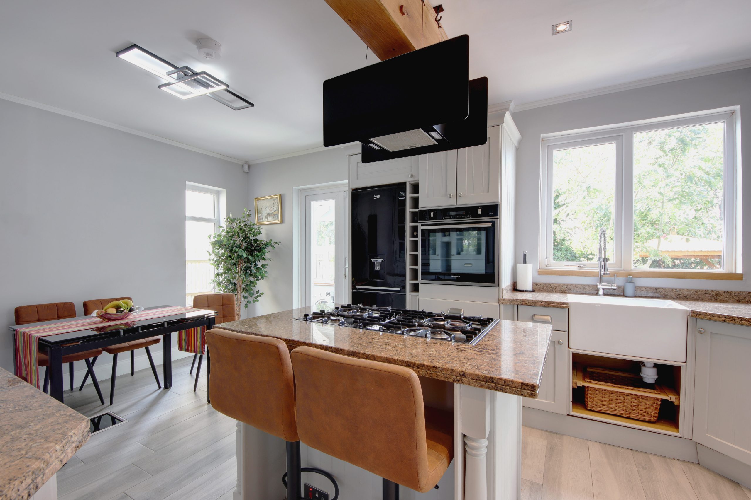 At the rear of the house, a stunning 16ft open-plan kitchen and dining area takes centre stage. The space is finished with sleek, underfloor-heated tile flooring, and a unique, modern hanging extractor fan. The Chippendale kitchen features a centrepiece island and premium double-thickness granite worktops. A comprehensive range of integrated appliances, including a washing machine, Bosch dishwasher, and underfloor wine fridge, ensure functionality meets style. Expansive rear glazing floods the space with natural light. This is a Smart-Home that is mobile and smart assistant-enabled controlling the home's surround sound and smart home features (including a 5-camera CCTV system, hot tub controls, Hive heating and wireless alarm system) provide modern convenience.
