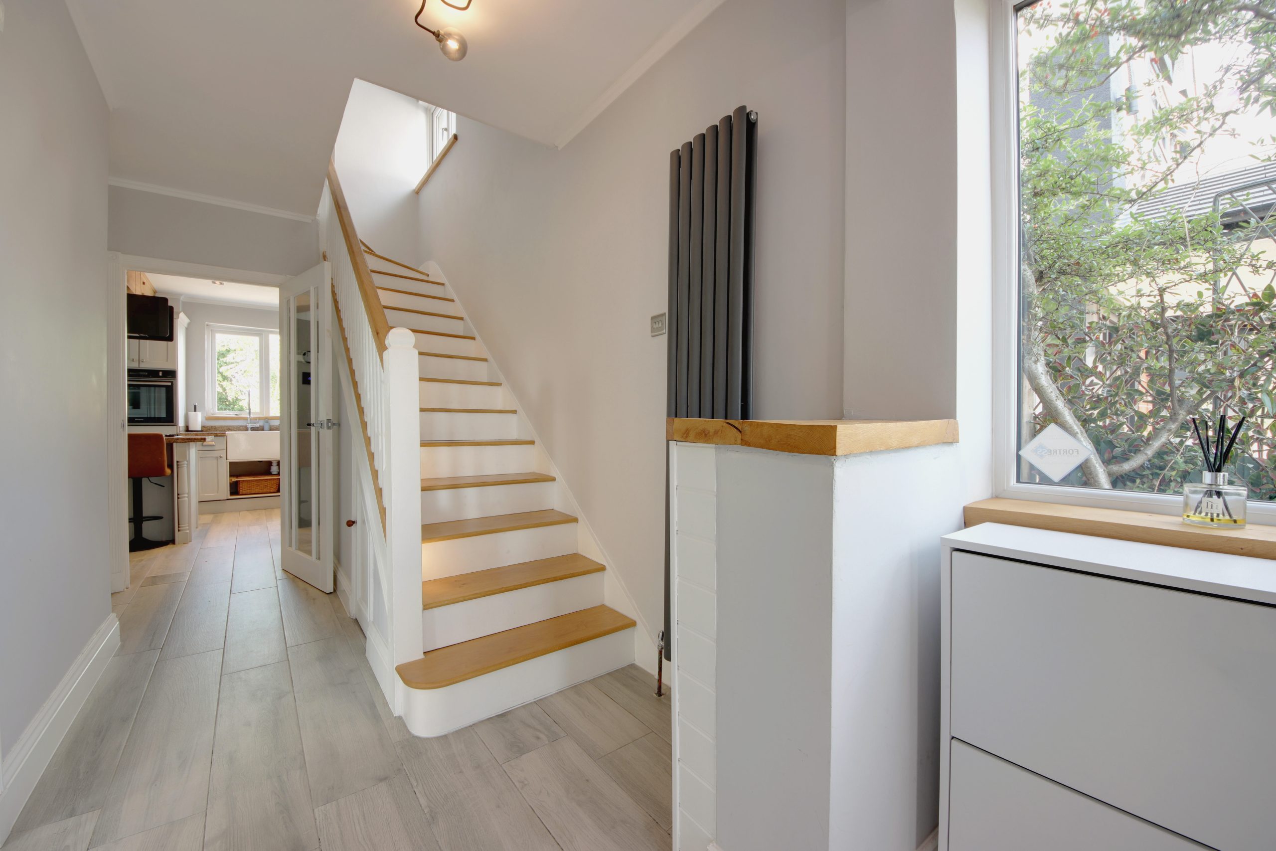 Upon entering, you're greeted by a bright and spacious hallway that flows effortlessly into the ground-floor living areas. To the left, a tranquil 15ft living room enjoys abundant natural light through a large bay window, complete with white wooden blinds. This serene space is further enhanced by beautifully restored cornicing and an exposed-brick fireplace.