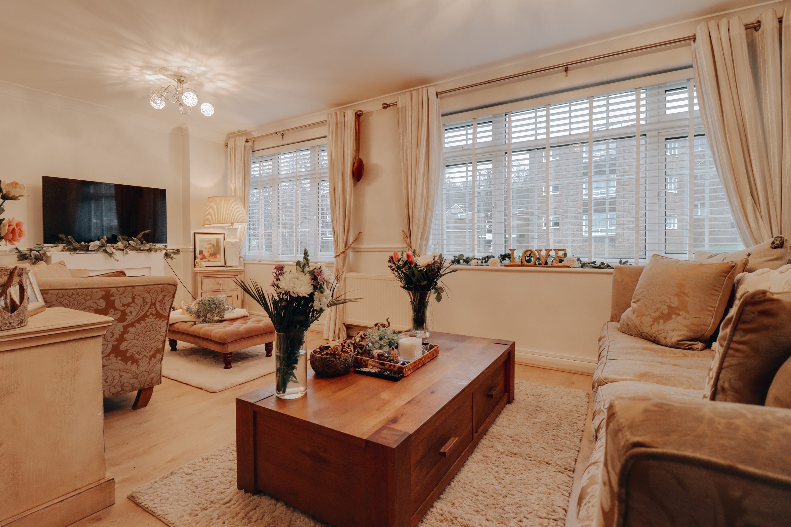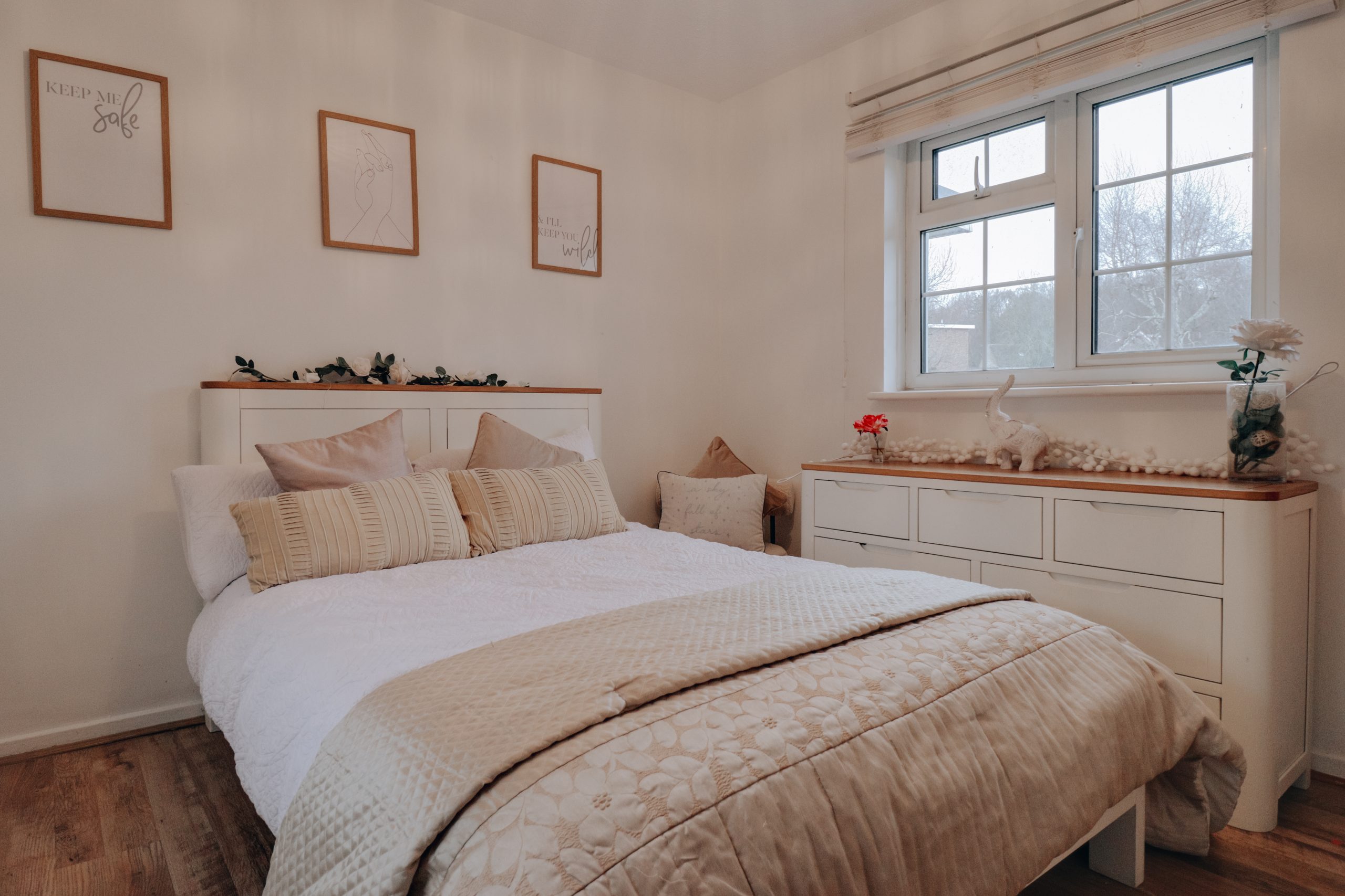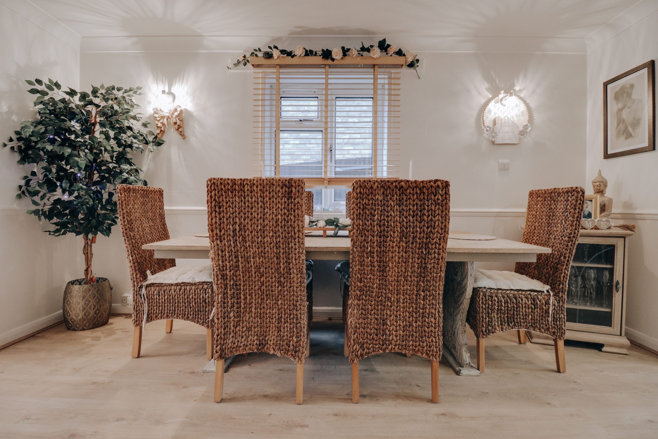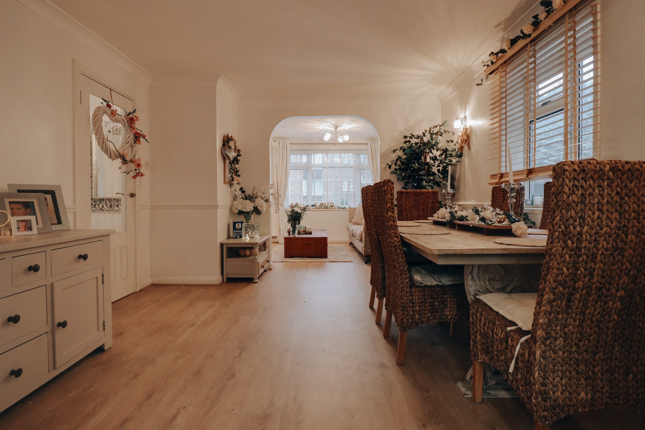 Upon entering, you’re greeted by a spacious hallway that sets the tone for the home, providing easy access to the key living areas and a conveniently located downstairs W.C. To the left, the generously proportioned through-lounge (23'10" x 17'9") offers a light-filled space, with a neutral colour palette and wooden flooring underfoot. An archway has been thoughtfully created by removing a wall, adding warmth and increasing the sense of openness, making it the perfect setting for entertaining. Double doors from the dining area open into the contemporary fitted kitchen, where a full suite of cabinetry and modern appliances have been arranged to maximise both functionality and style. The kitchen’s neutral tones, accented by brushed chrome fixtures and an elegant arched tap, create a sophisticated, harmonious space with direct access to the garden.