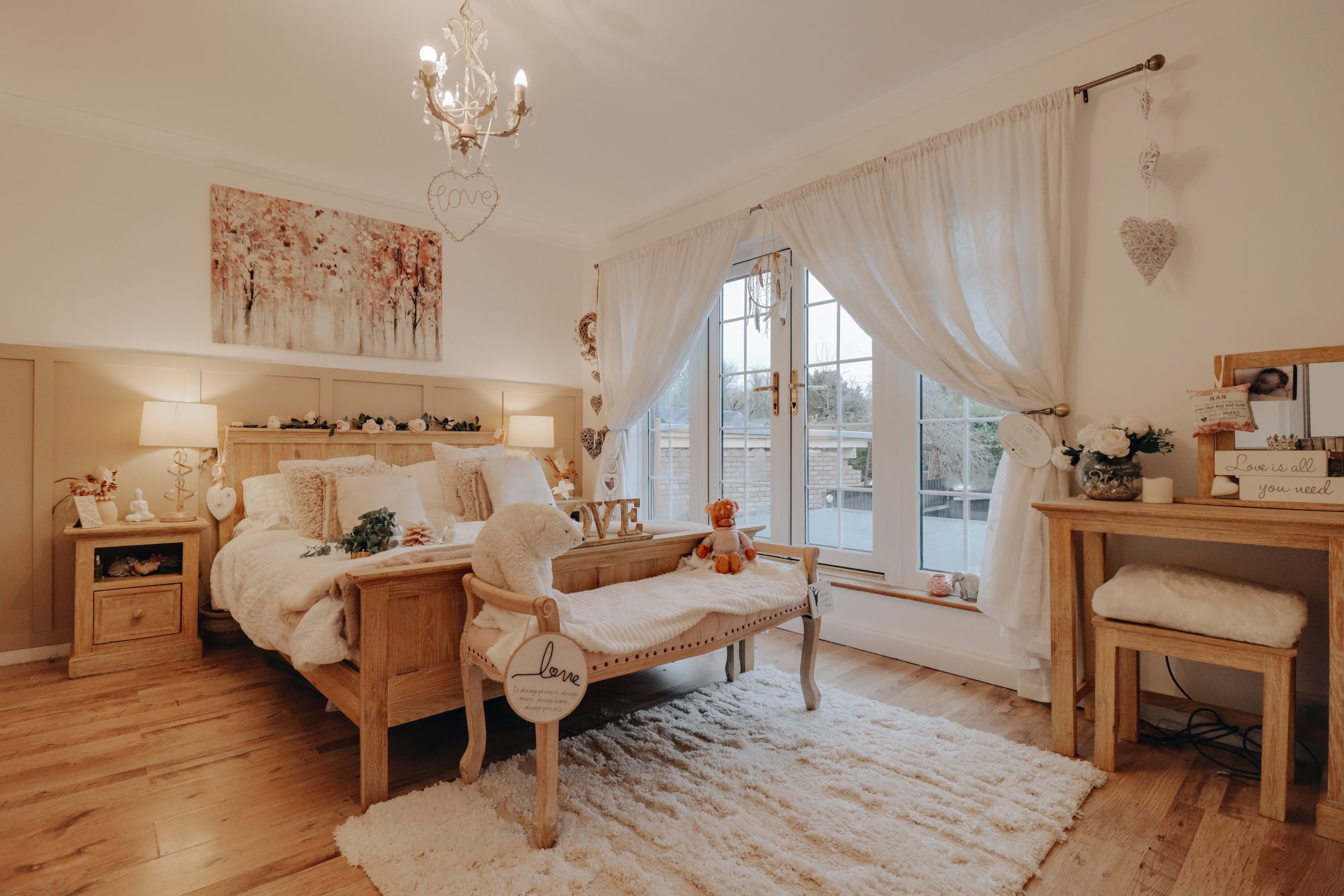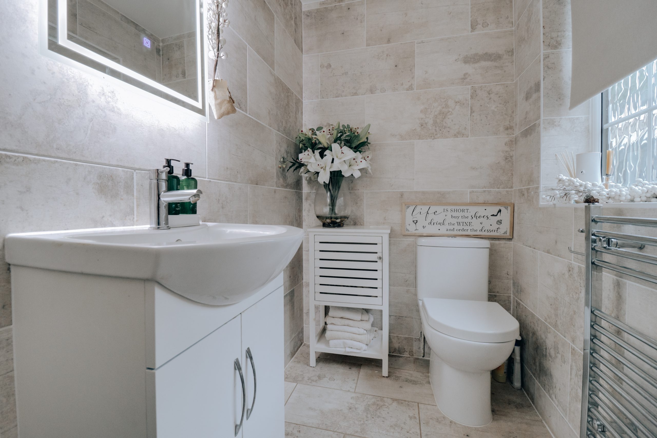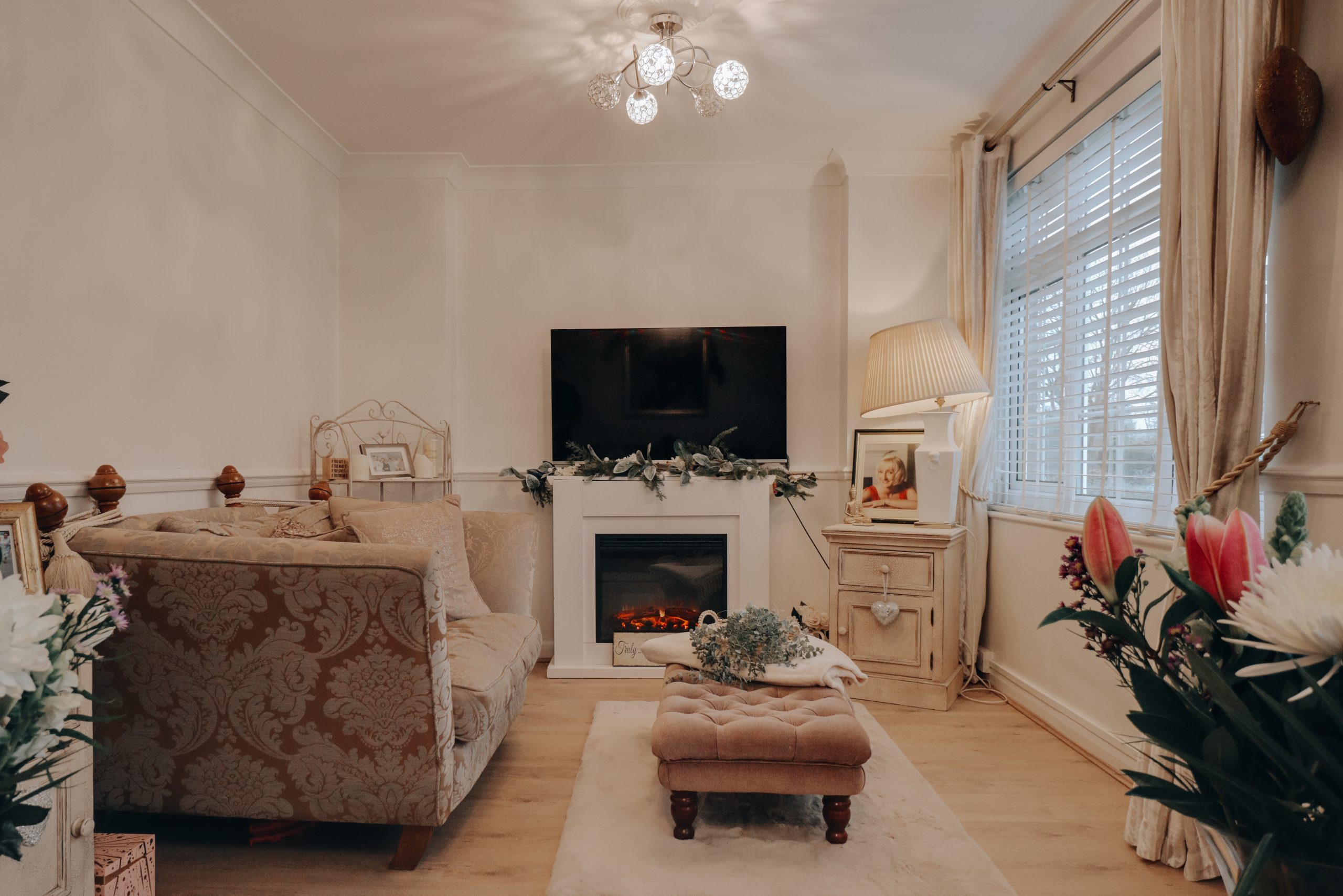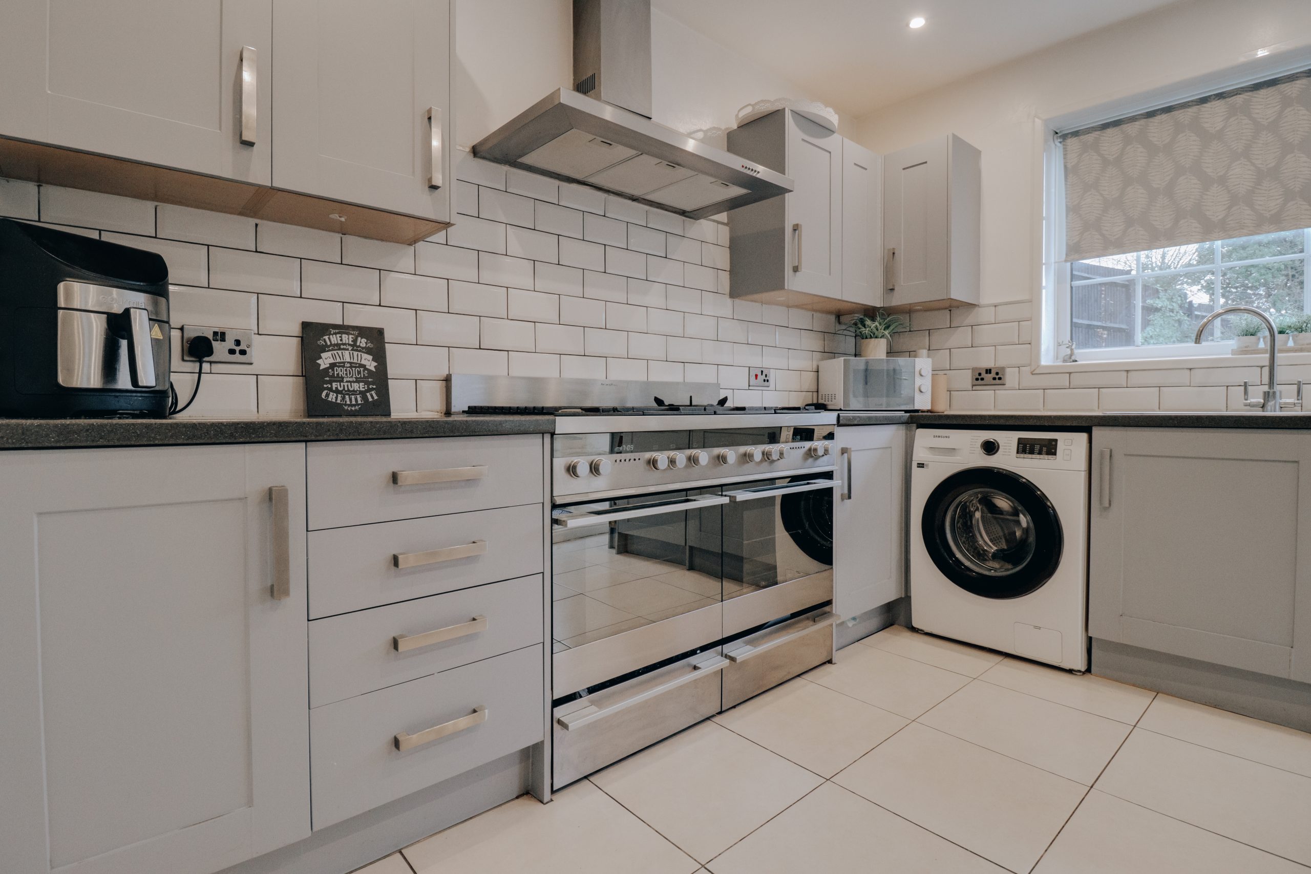 Upon entering, you’re greeted by a spacious hallway that sets the tone for the home, providing easy access to the key living areas and a conveniently located downstairs W.C. To the left, the generously proportioned through-lounge (23'10" x 17'9") offers a light-filled space, with a neutral colour palette and wooden flooring underfoot. An archway has been thoughtfully created by removing a wall, adding warmth and increasing the sense of openness, making it the perfect setting for entertaining. Double doors from the dining area open into the contemporary fitted kitchen, where a full suite of cabinetry and modern appliances have been arranged to maximise both functionality and style. The kitchen’s neutral tones, accented by brushed chrome fixtures and an elegant arched tap, create a sophisticated, harmonious space with direct access to the garden.