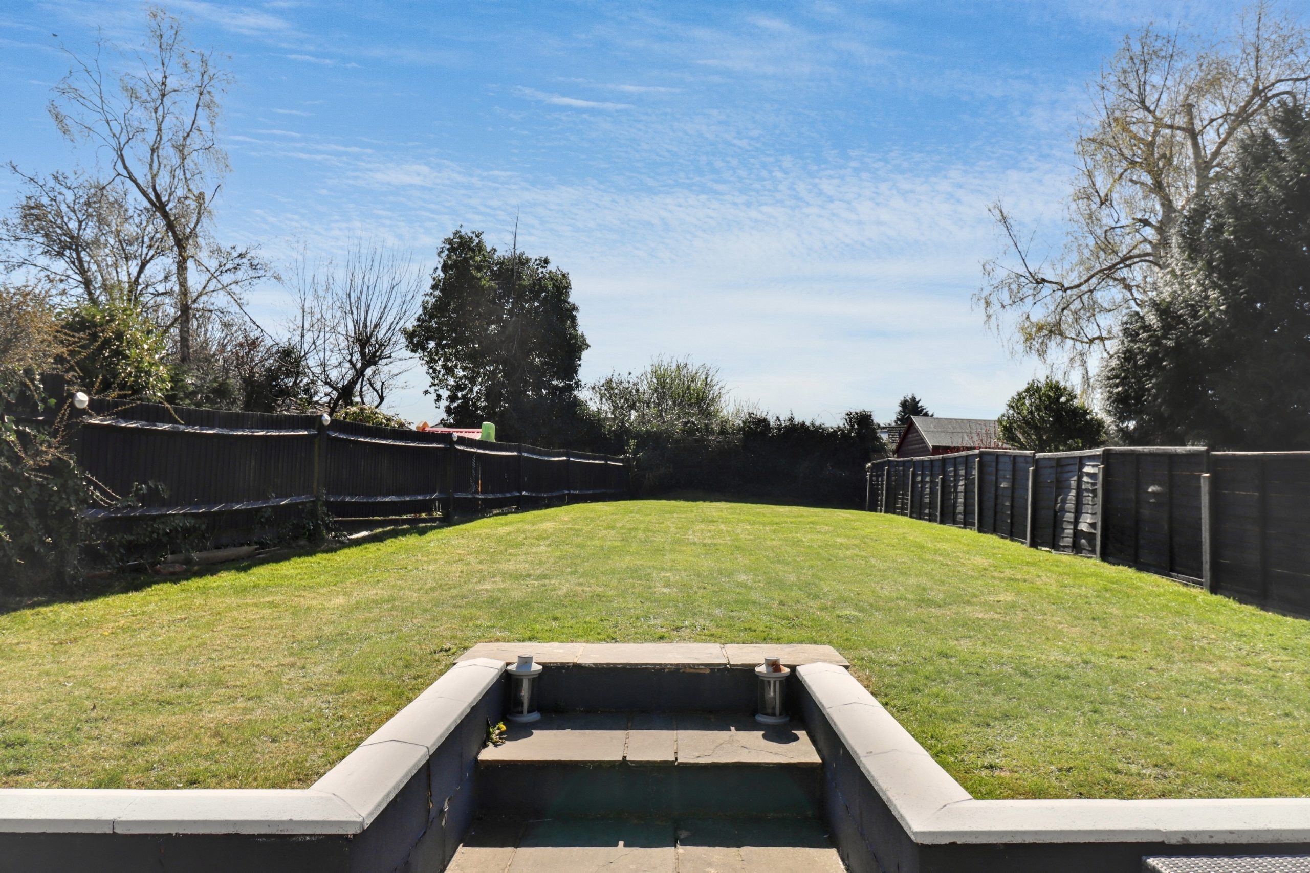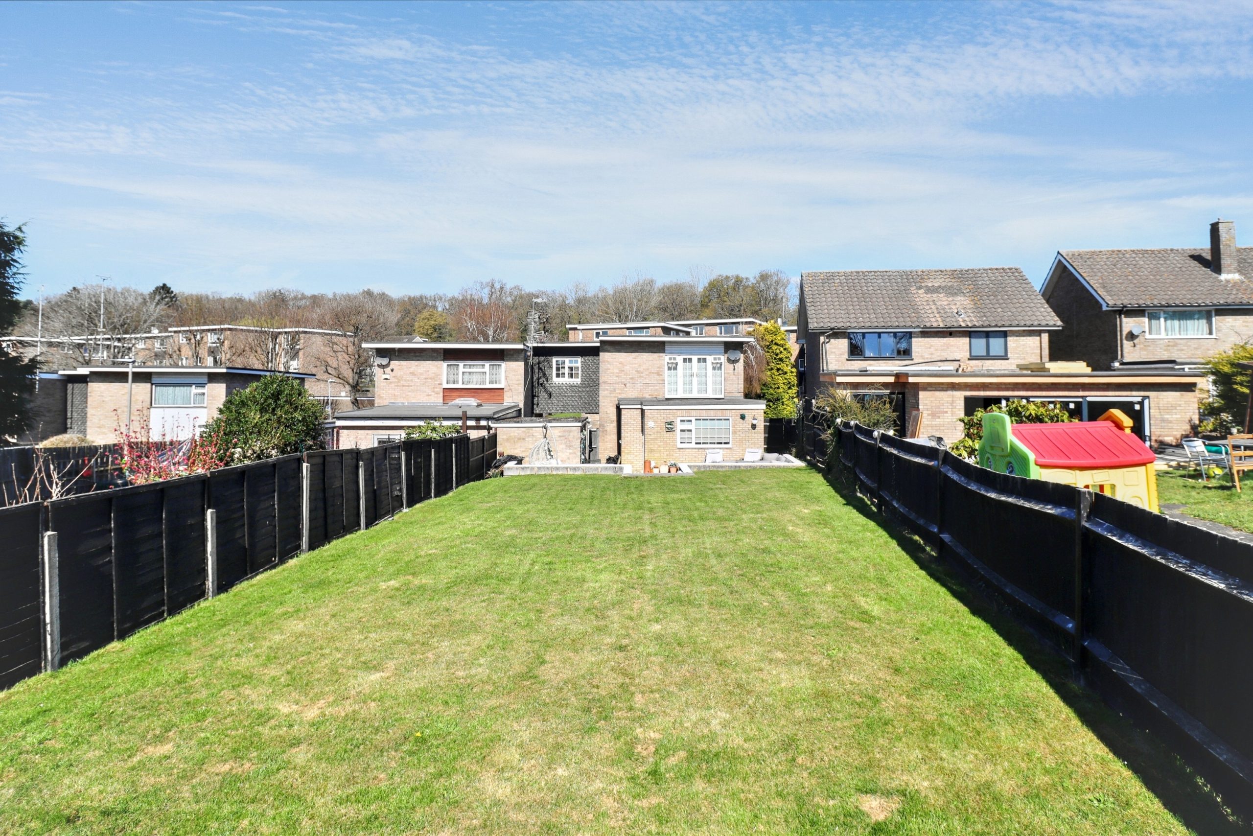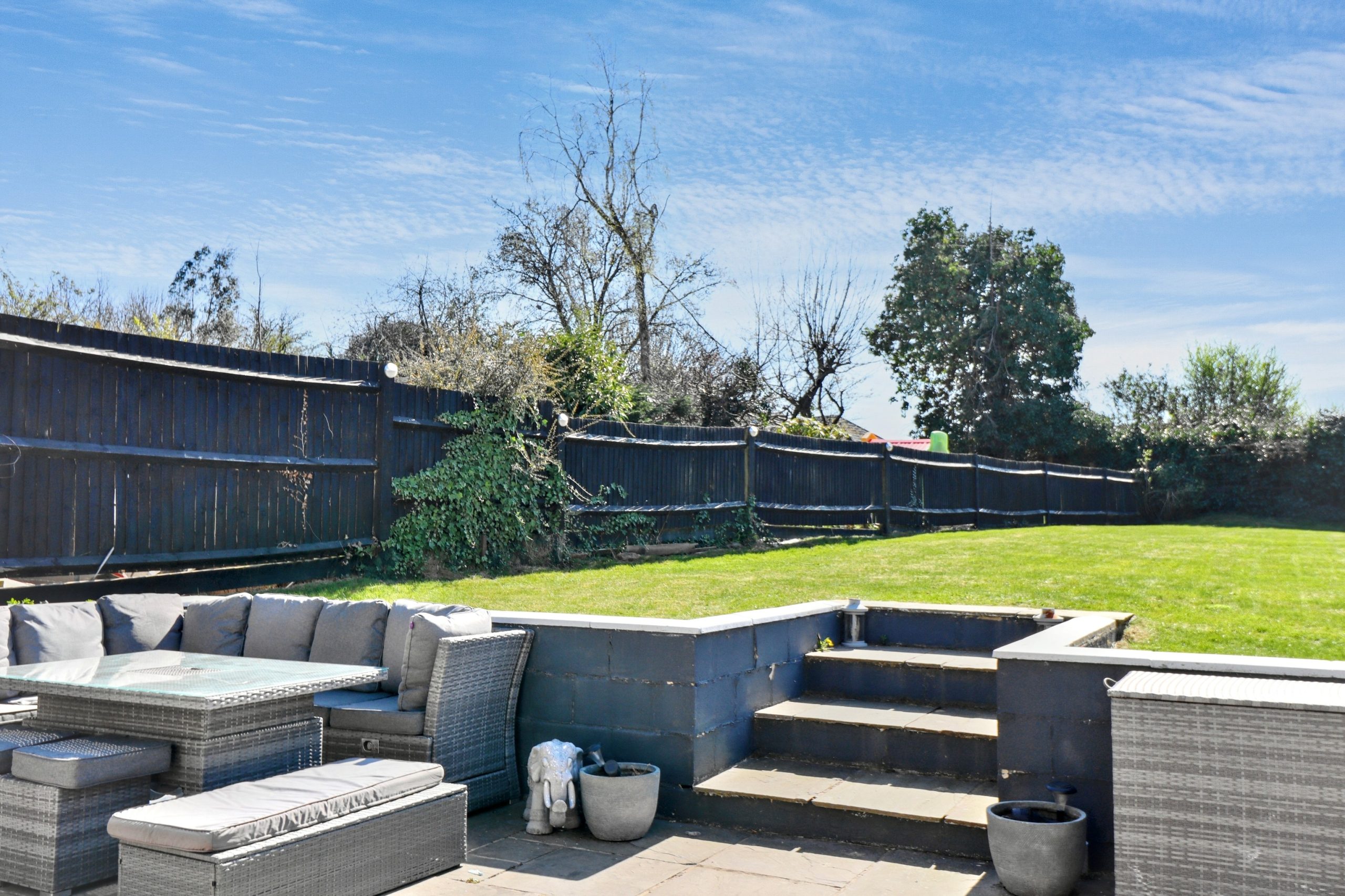 The rear garden is a true standout, with its south-easterly aspect ensuring sunlight throughout the day. A large, well-designed patio area at the front of the garden flows seamlessly from the kitchen, offering plenty of room for outdoor furniture and dining. From here, steps lead down to a lush, well-maintained lawn - ideal space for relaxing, entertaining, or engaging in outdoor activities. Access to the garage and driveway is also available through a side gate.