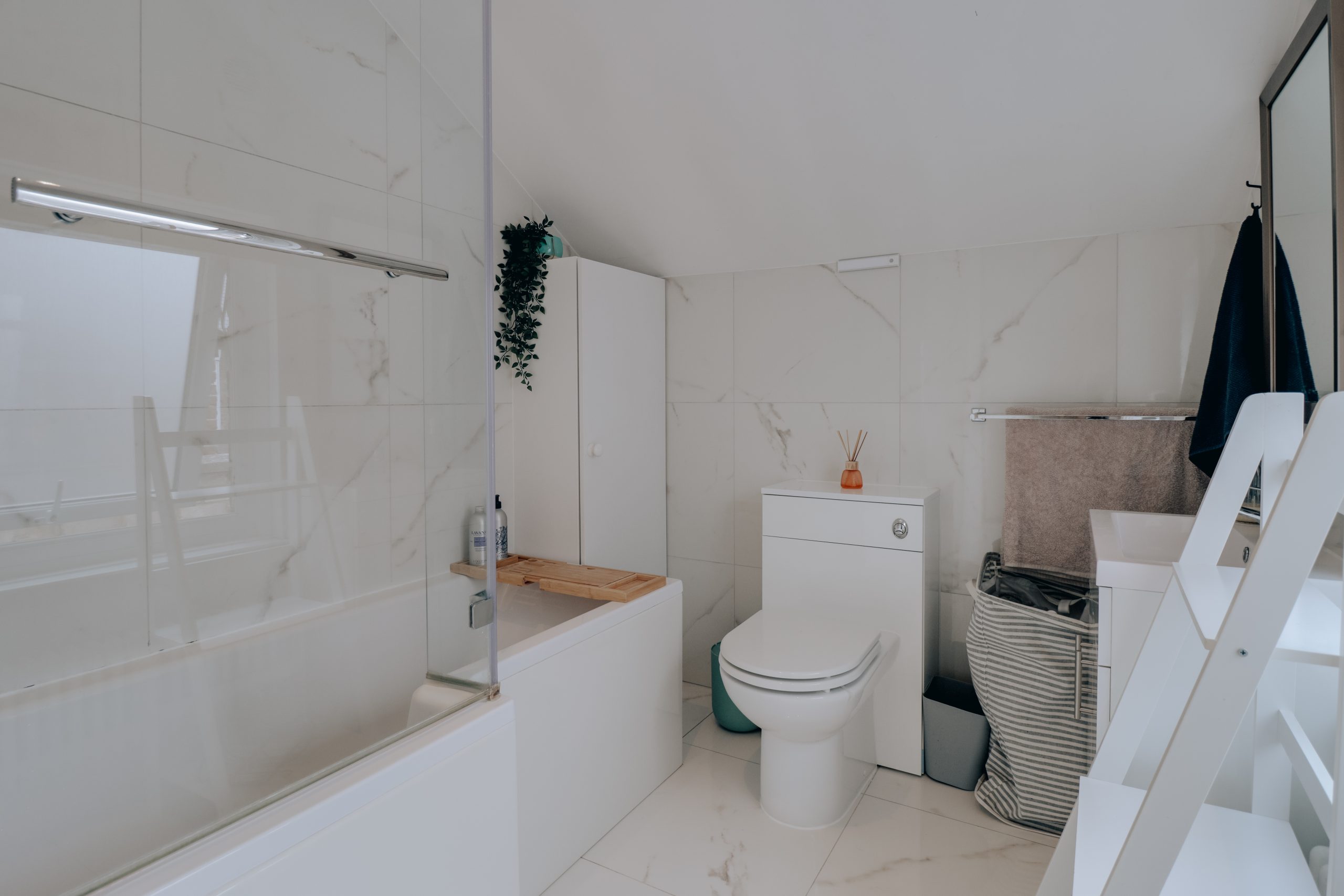 A staircase leads you to the first floor, where two generously sized bedrooms await. The principal bedroom, measuring 12'5" x 12'5", serves as a serene retreat. With its built-in cabinetry and large, stunning bay window, it allows natural light to pour in despite the north-facing elevation. The second bedroom extends into a private 10'8" dressing room. Adjacent to this, you'll find a sleek, contemporary en-suite bathroom, adding to the sense of modern elegance. For added flexibility, a simple addition of studwork could effortlessly transform the dressing room into an additional bedroom, offering endless possibilities to suit your lifestyle needs. The third bedroom, situated on the second floor, continues the home's refined design, with a striking original feature brick wall adding unmatched character. Clever use of the eaves provides ample storage. This space could make for an ideal guest bedroom or home office.