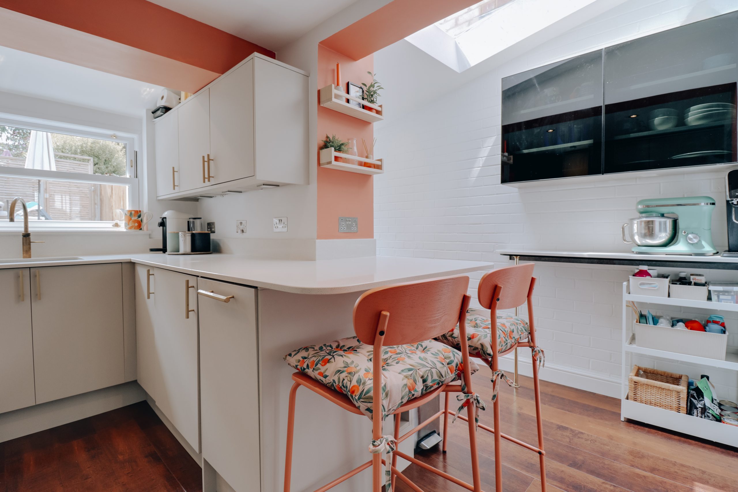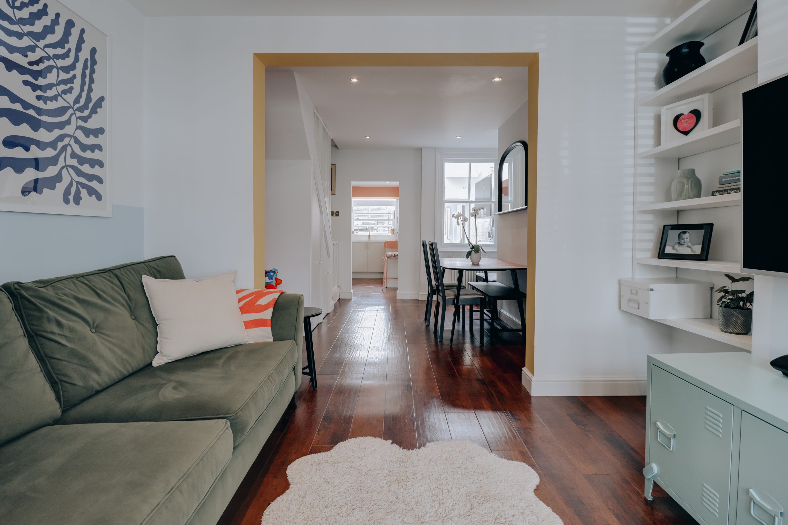 Step inside via a practical porch, perfect for coats and boots, and you’re greeted by a bright, airy 24ft open-plan living and dining space. Formerly two rooms, now cleverly combined by the removal of a dividing wall, the layout has been elevated by a bold yellow accent detail, adding a playful sense of personality. This subtle flair continues throughout the home, elevating an otherwise calming neutral palette. Further standout features include column radiators, built-in alcove storage, and a stunning easterly-facing bay window that bathes the space in morning light. To the rear, the home opens into a thoughtfully reconfigured kitchen, measuring a generous 11'3" x 11'4". Designed with both form and function in mind, it’s almost perfectly square, allowing for distinct zones to cook, dine, and flows seamlessly into the garden. Sleek, muted cabinetry, integrated appliances (including built-in microwave and oven-grill), and generous worktops cater to keen cooks and busy families alike. Luxury vinyl tile (LVT) flooring adds a practical touch of style, while a soft blush-pink structural support post provides a charming nod to the home’s eclectic personality. A handy adjacent, almost-utility area offers additional storage and garden access.