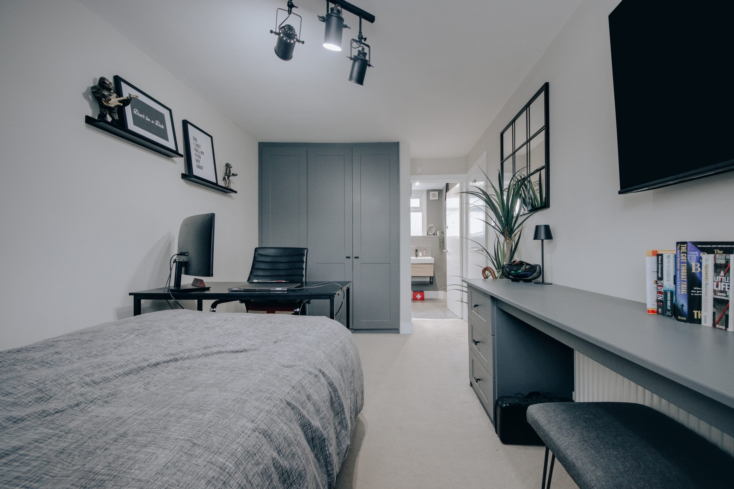 Upstairs, the same sense of cohesion and considered design continues. Four beautifully appointed bedrooms unfold from a bright central landing, each finished with a consistent palette and understated detailing that ties the floor together effortlessly. Three of the bedrooms enjoy their own sleek en-suite shower rooms, thoughtfully specified and impeccably presented, while a separate family bathroom serves the remaining bedroom with equal attention to finish. The principal suite is particularly impressive: complete with a dedicated dressing area. For those seeking additional flexibility, a simple reconfiguration (repositioning the entrance) could easily see this space adapted to create a fifth bedroom, nursery or private study, without compromise. It is a first floor that feels balanced, versatile and quietly indulgent in equal measure.