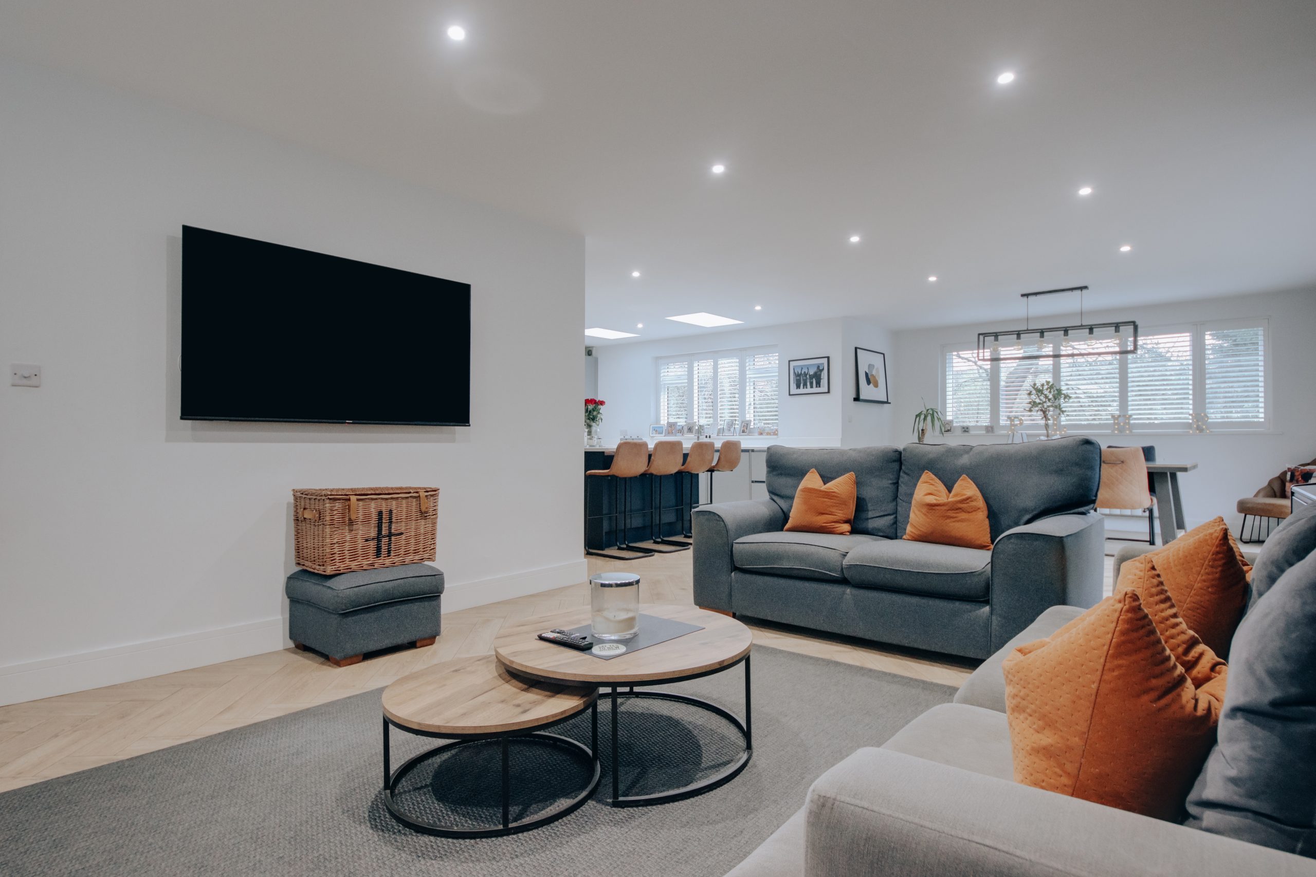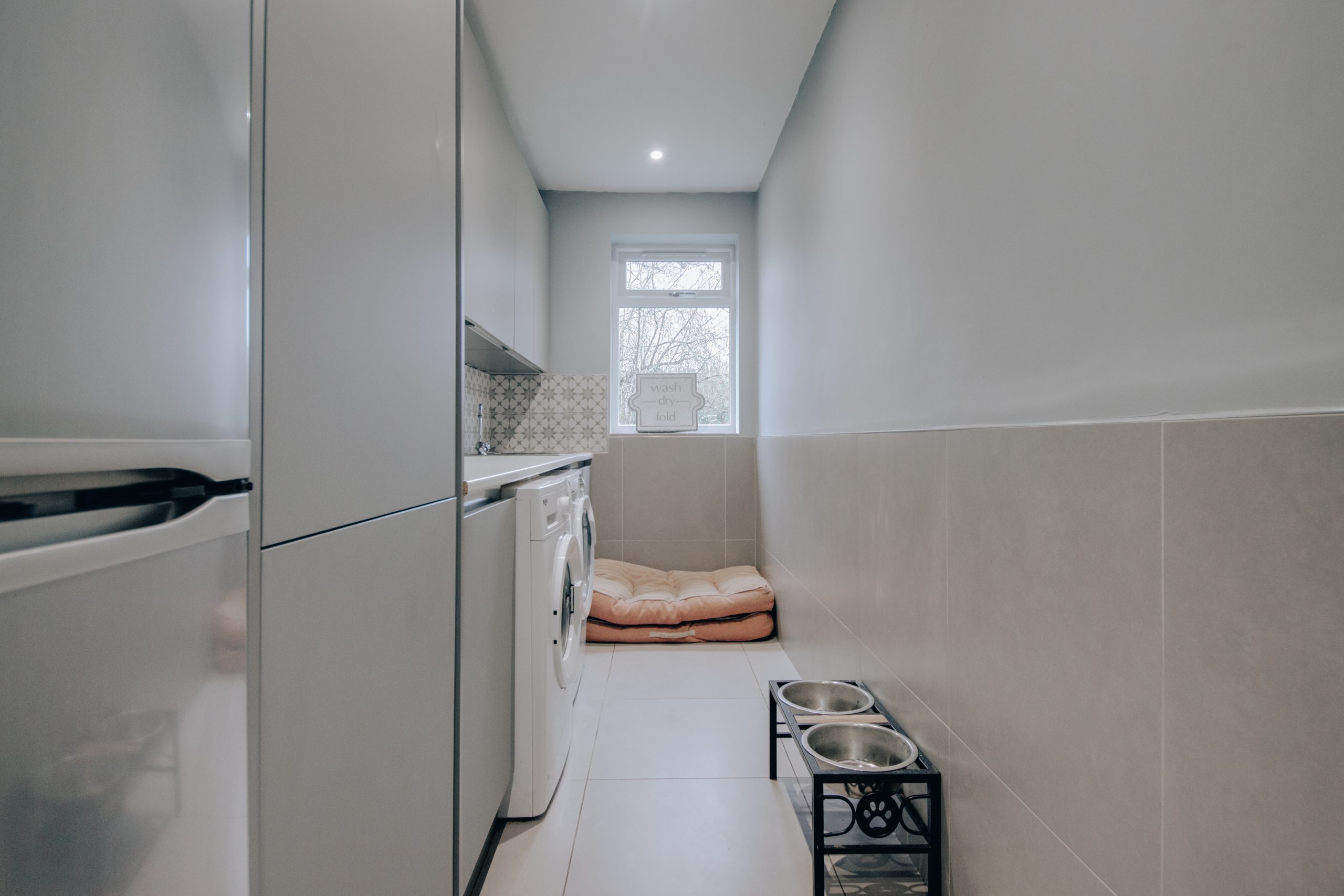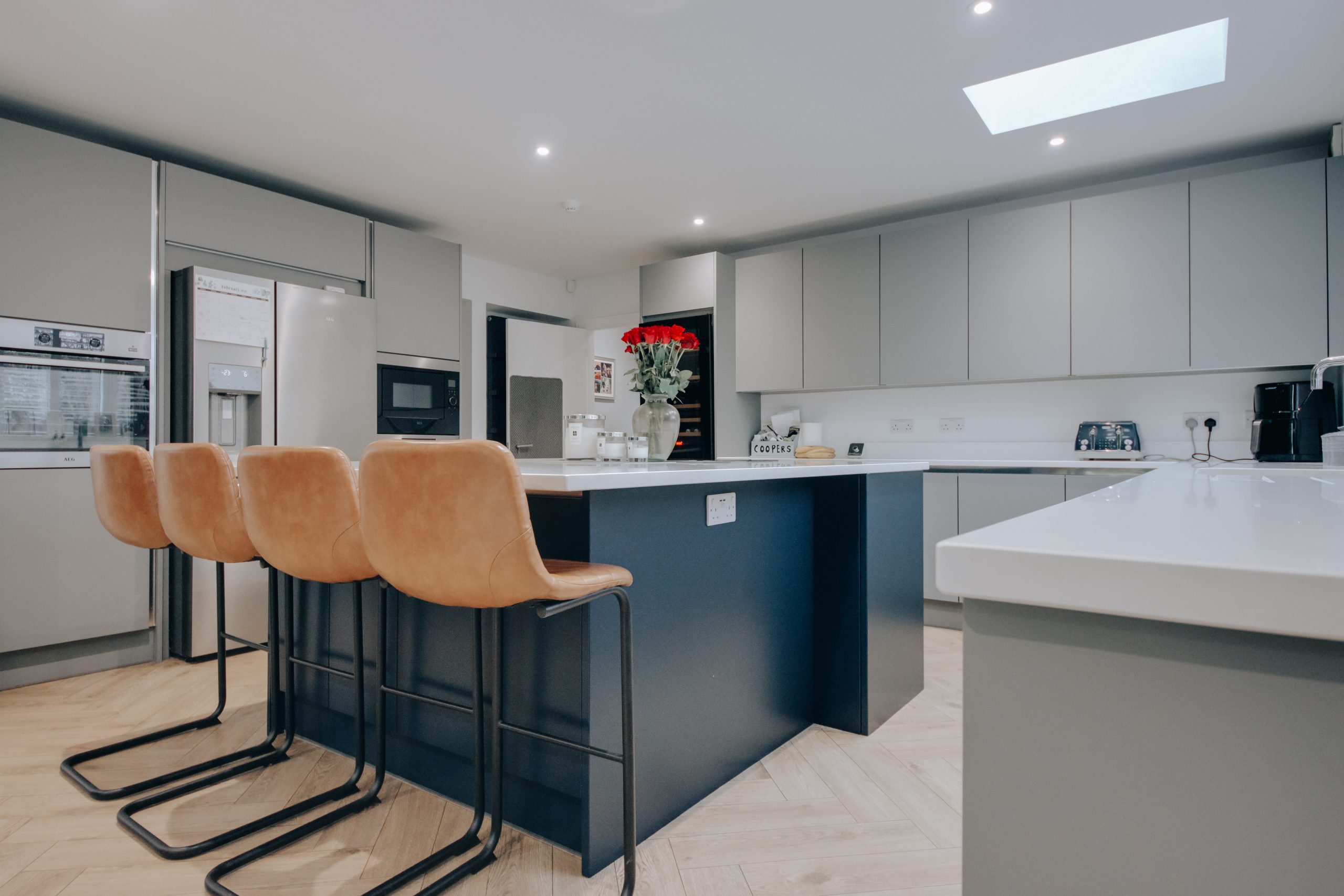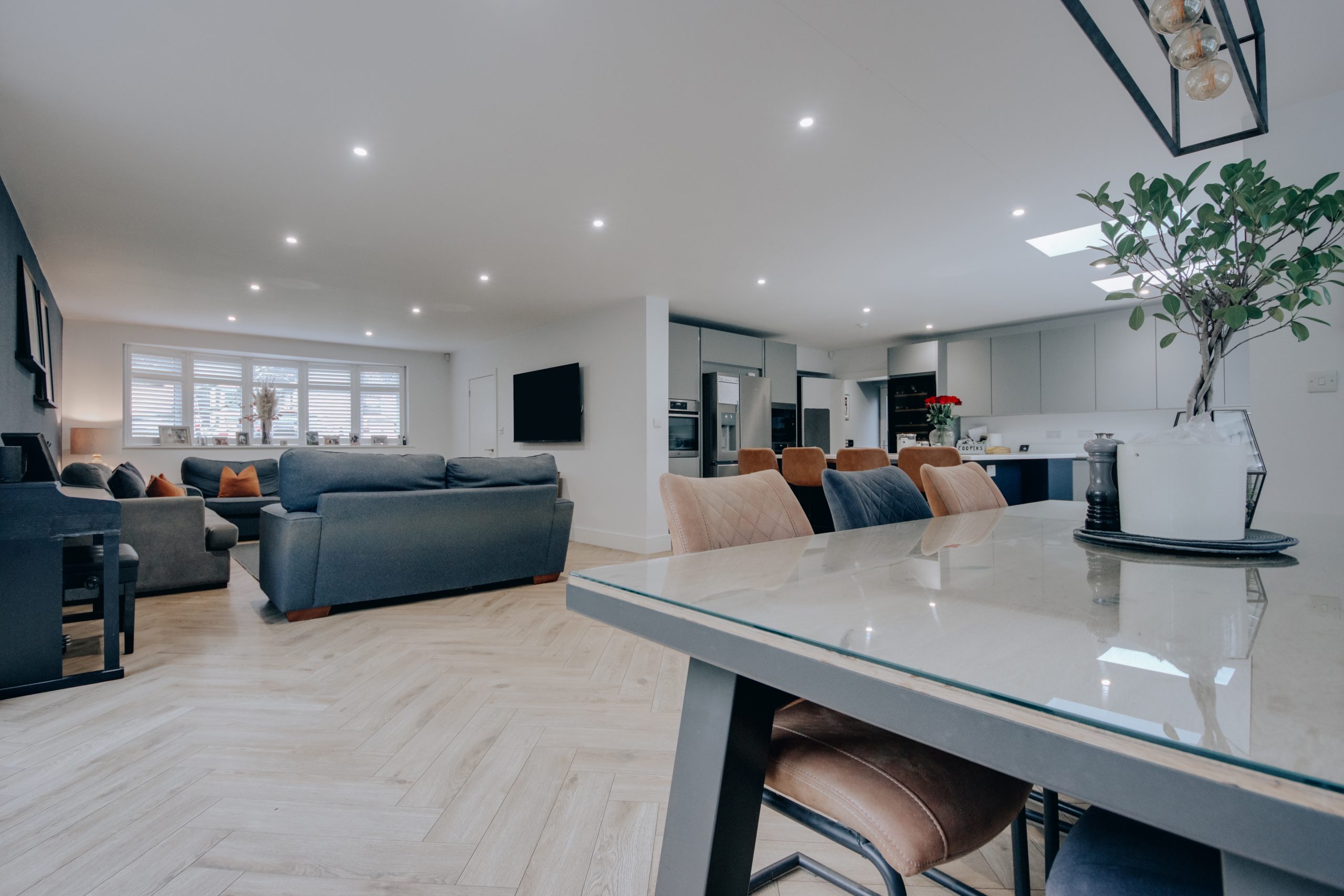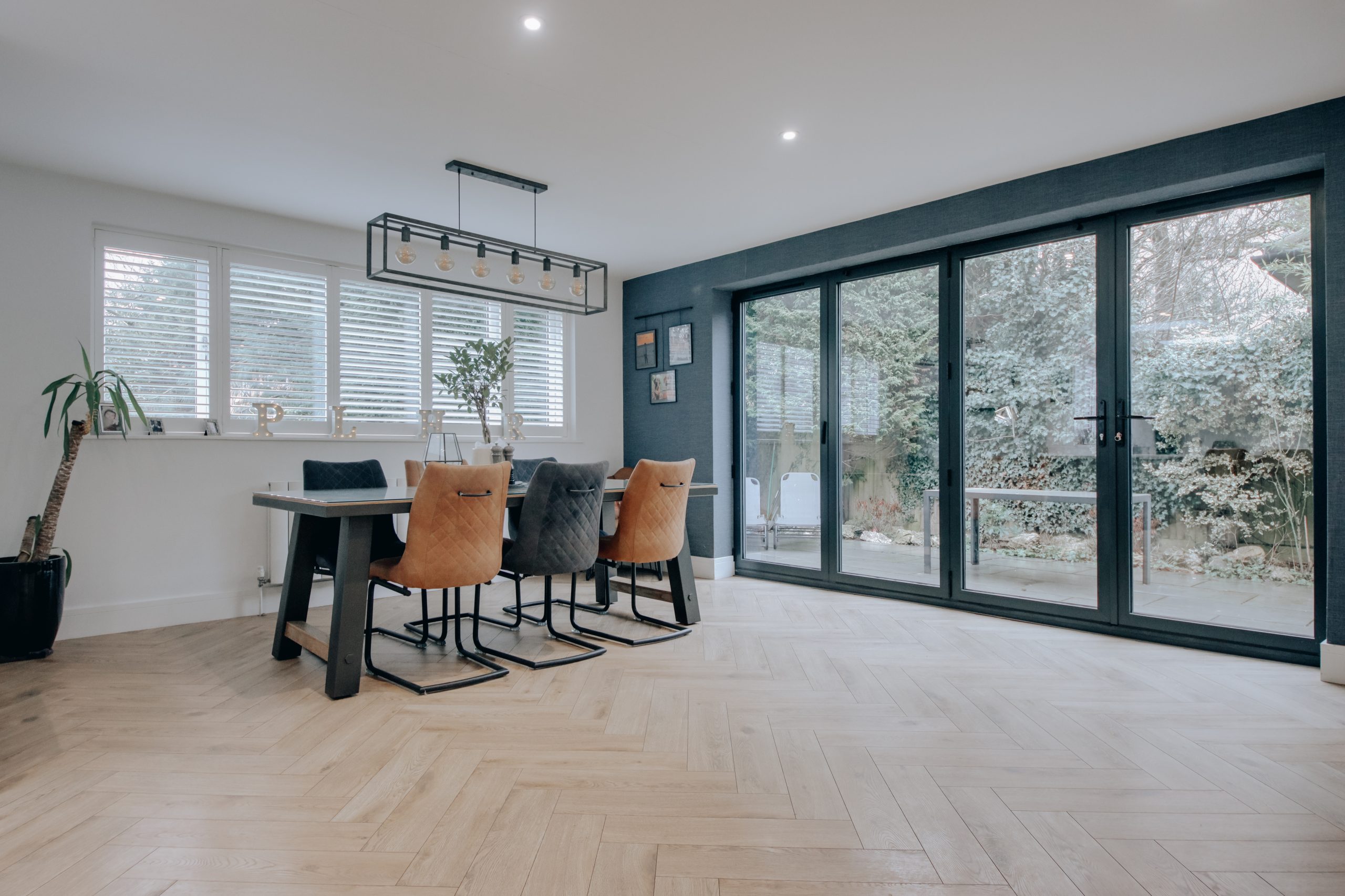 Step inside and the tone is set immediately: a wide, light-filled hallway. From here, the beautifully curated interior unfolds with intention - a ground-floor W.C and generous understairs storage positioned with practicality in mind - before the house truly reveals itself to the right. The open-plan living space (an extraordinary 35’2” x 27’4”) is nothing short of breathtaking. Laid in oversized herringbone parquet LVT, grounded by a bold navy feature wall and framed by anthracite bi-folding doors, it strikes that rare balance between architectural impact and everyday comfort. Designed across a subtle right-angle, the space flows organically, culminating in a spectacular, light-drenched kitchen that commands attention. Created for hosting on any scale, its centrepiece is a perfectly square, seamless white island (insistently specified without a single join) incorporating an induction hob and sleek contemporary extractor, forming both sculptural statement and social hub. Surrounding cabinetry integrates a suite of high-spec appliances chosen as carefully for performance as for aesthetics, blending form and function with quiet confidence. Completing the ground floor is a well-appointed utility room with secondary sink, ensuring the practicalities of daily life remain discreetly separate from the showpiece setting.