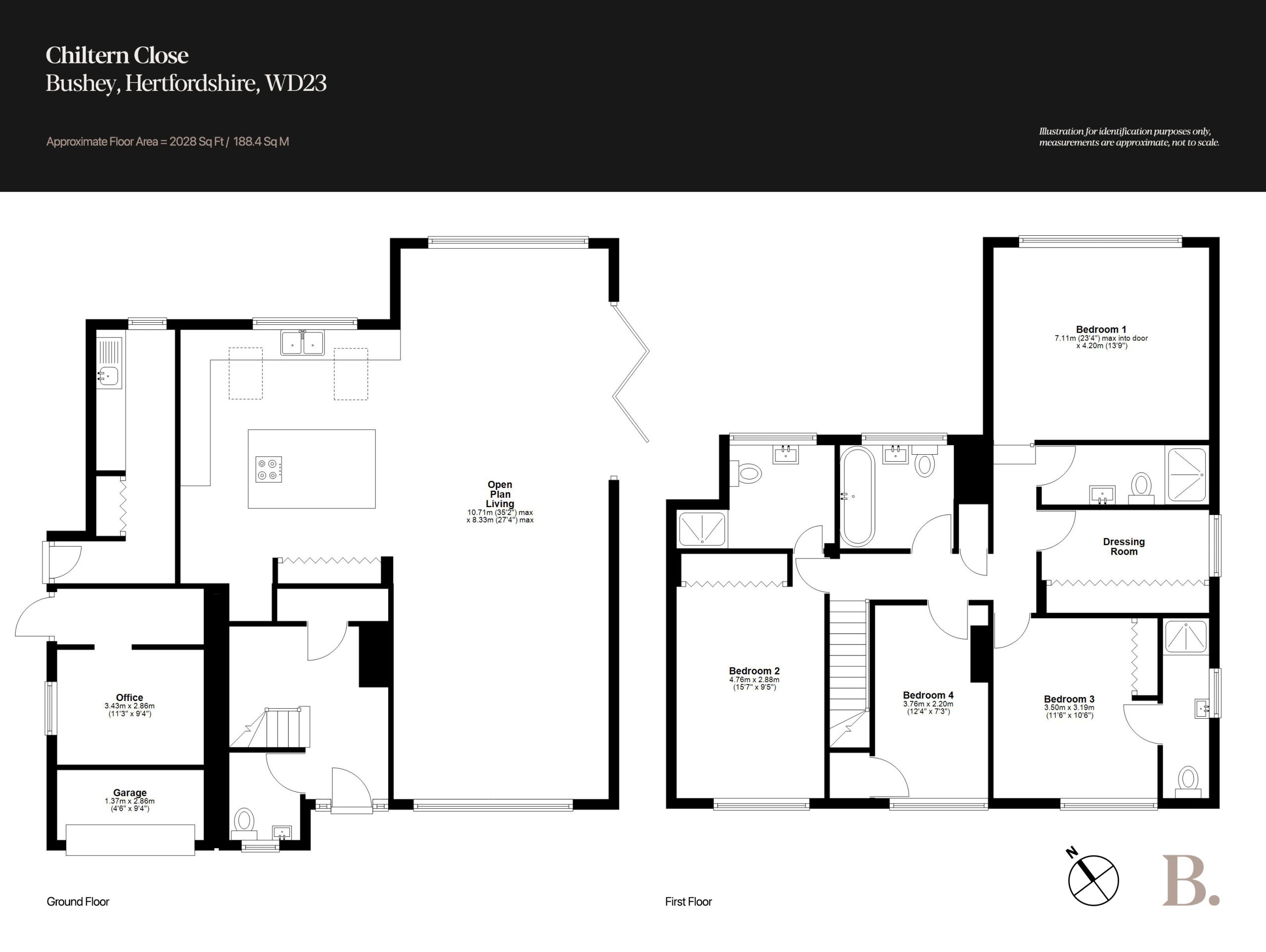 Tucked towards the end of the highly regarded Chiltern Close cul-de-sac, this substantial four-bedroom, four-bathroom home enjoys a quietly impressive position between Bushey Heath and the village itself. Thoughtfully extended during the current owners’ tenure, the house now spans an impressive 2,028 sq.ft across two beautifully arranged floors, offering generous, well-balanced accommodation throughout and is presented to the market with a complete chain. Its late-20th-century façade pairs crisp white render with warm buff brick beneath a tiled gable roof, while a distinctive crazy-paved driveway provides off-street parking ahead of the integral garage (partially converted to create a private office with its own external entrance, yet retaining useful storage to the front). A side gate opens to the north-easterly facing rear garden which, owing to the home’s corner-plot position, wraps elegantly at a right angle, welcoming natural light throughout the day and offering a wonderfully private setting complete with lawn, bar area and a charming stream - a space designed as much for long summer afternoons as it is for lively evenings with friends and family.