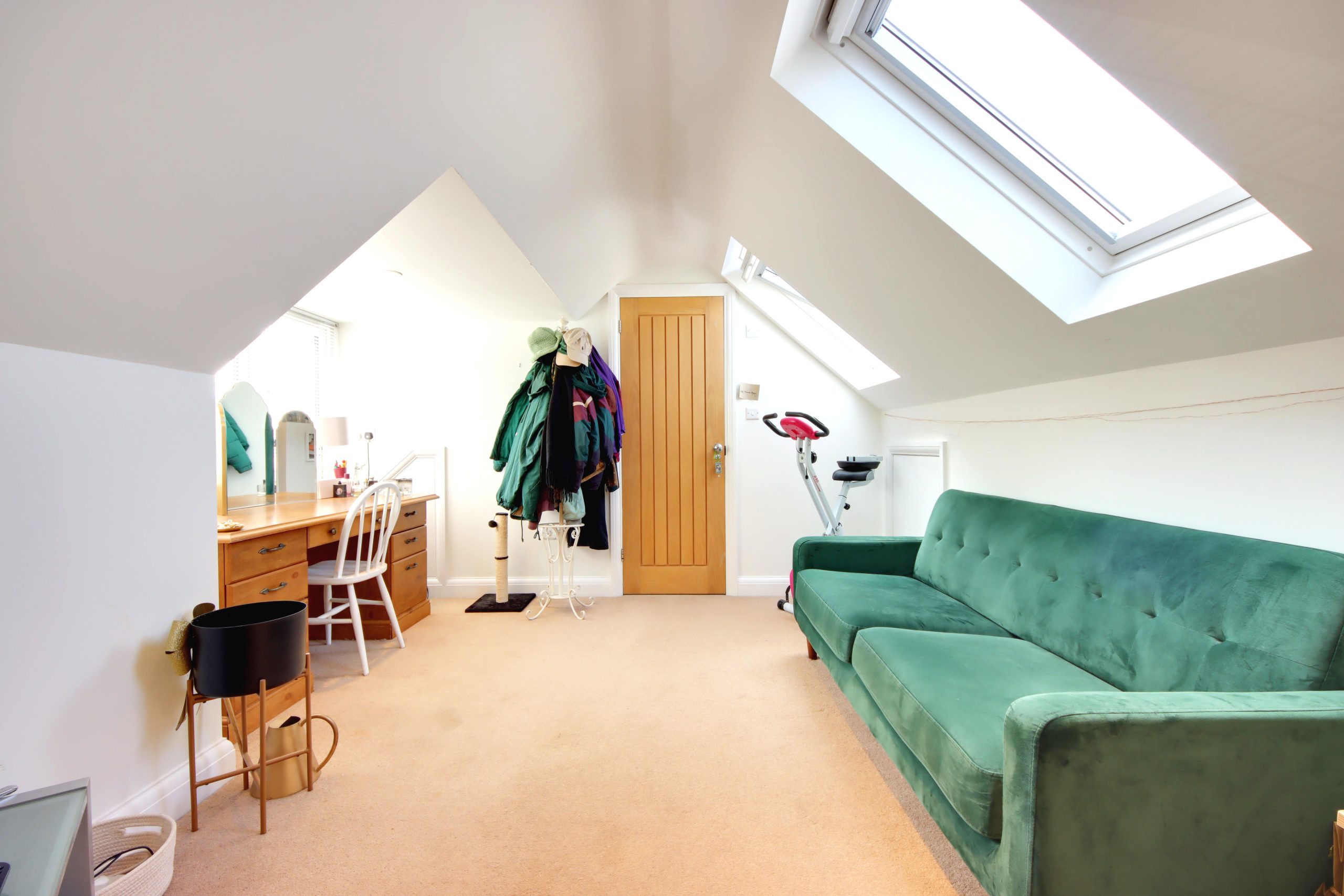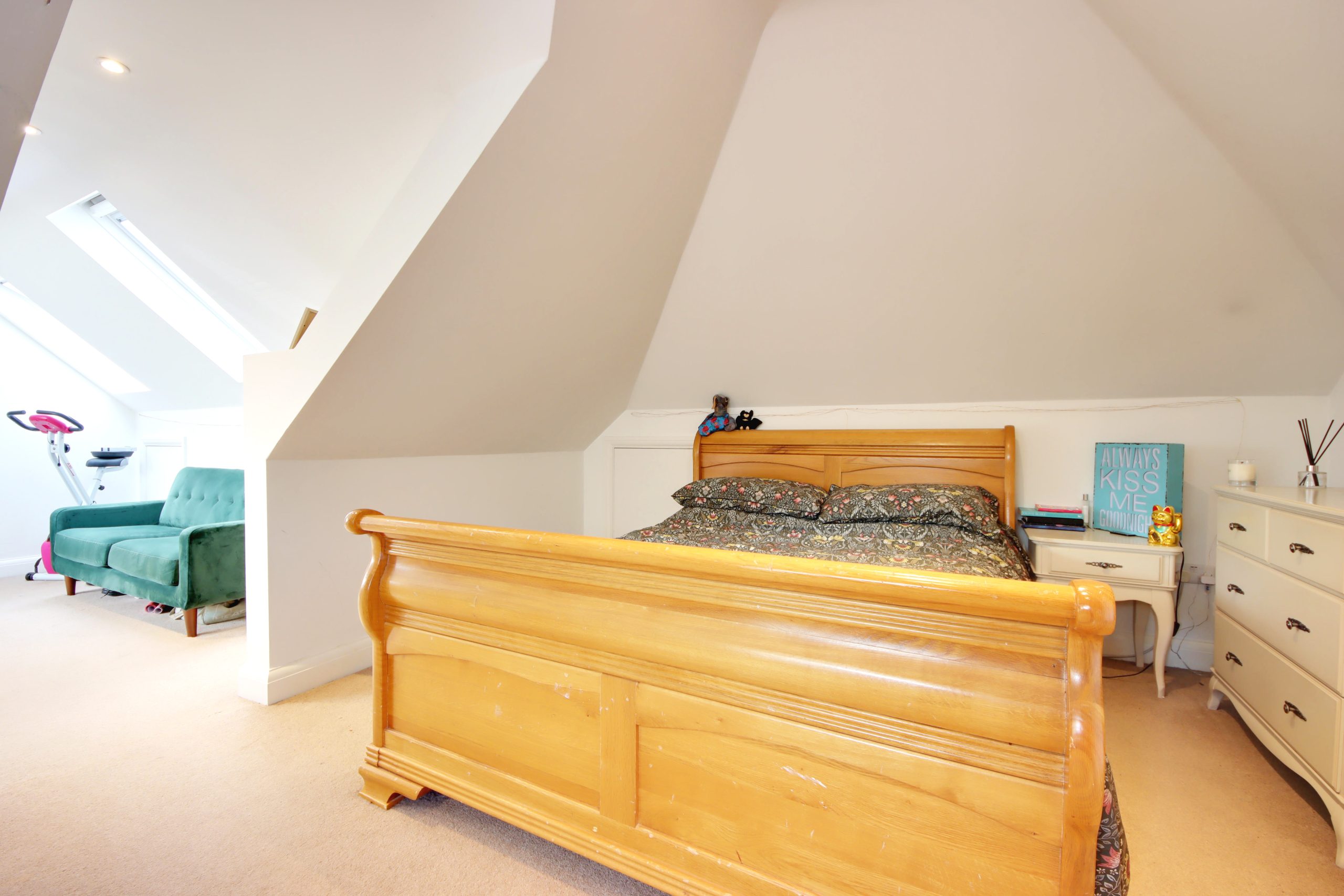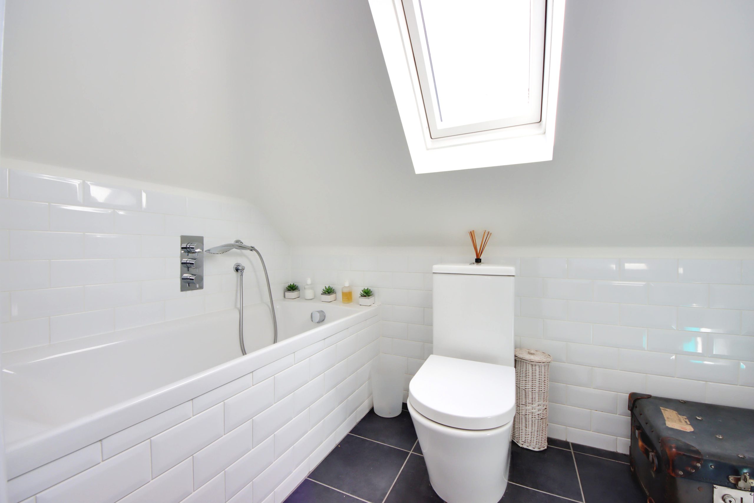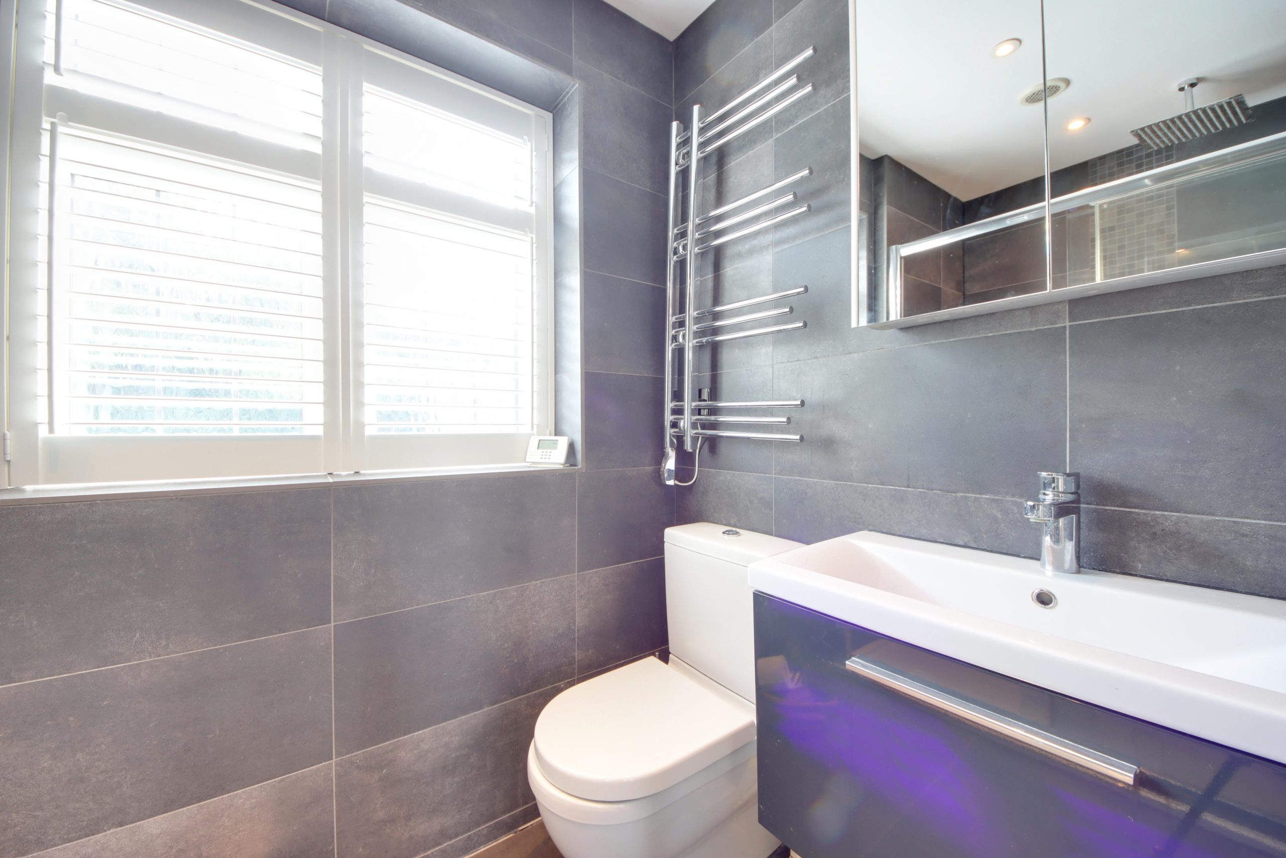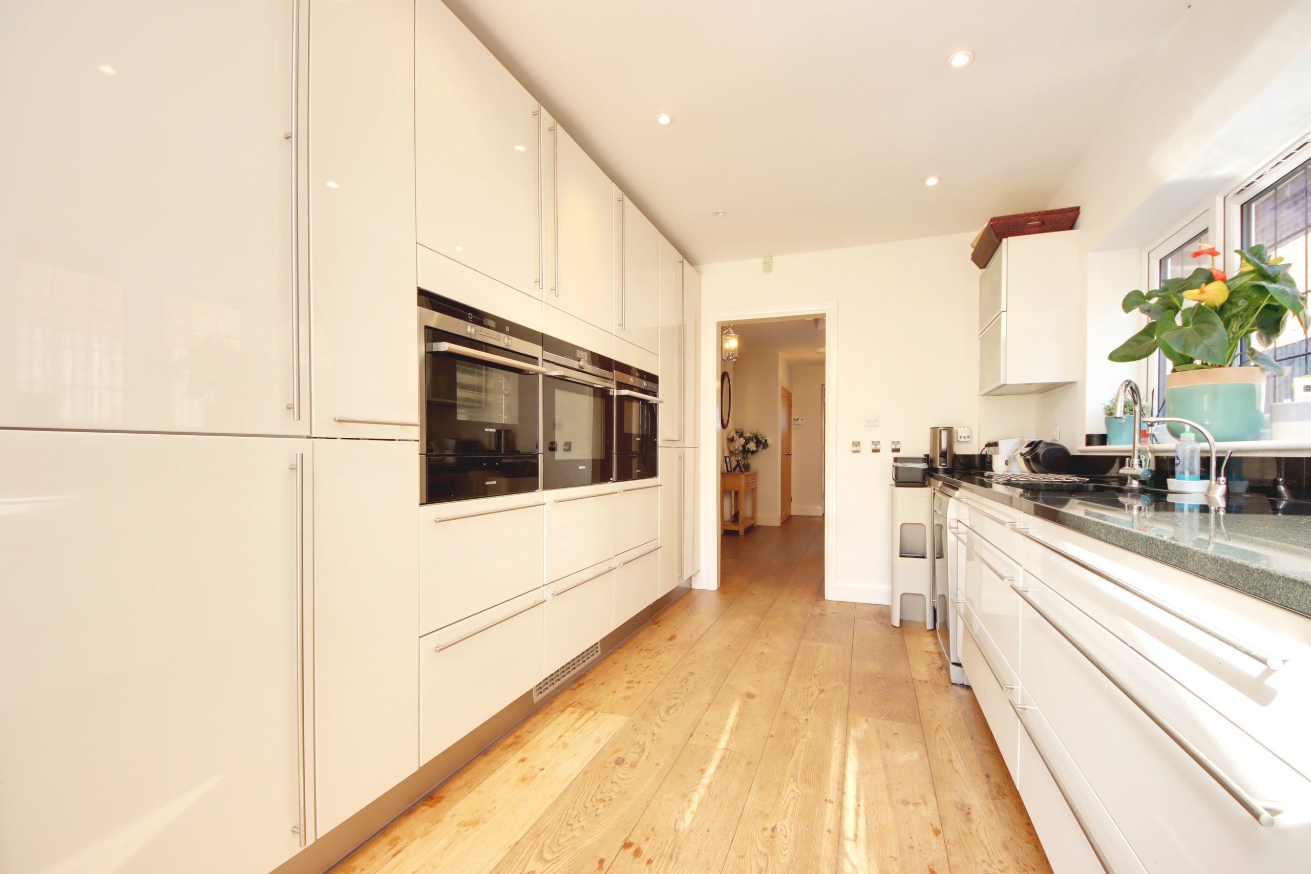 A staircase ascends to the first floor, home to four generous bedrooms, one of which is currently being utilised as a home office. The principal bedroom (13’1 x 16’8) comes equipped with a walk-in wardrobe and a contemporary en-suite bathroom. The final bedroom occupies the second floor and remains stylistically cohesive with the rest of the house. Ample in-built cabinetry helps visually enlarge the space which is completed by a contemporary en-suite bathroom finished perfectly in a neutral, white tile.