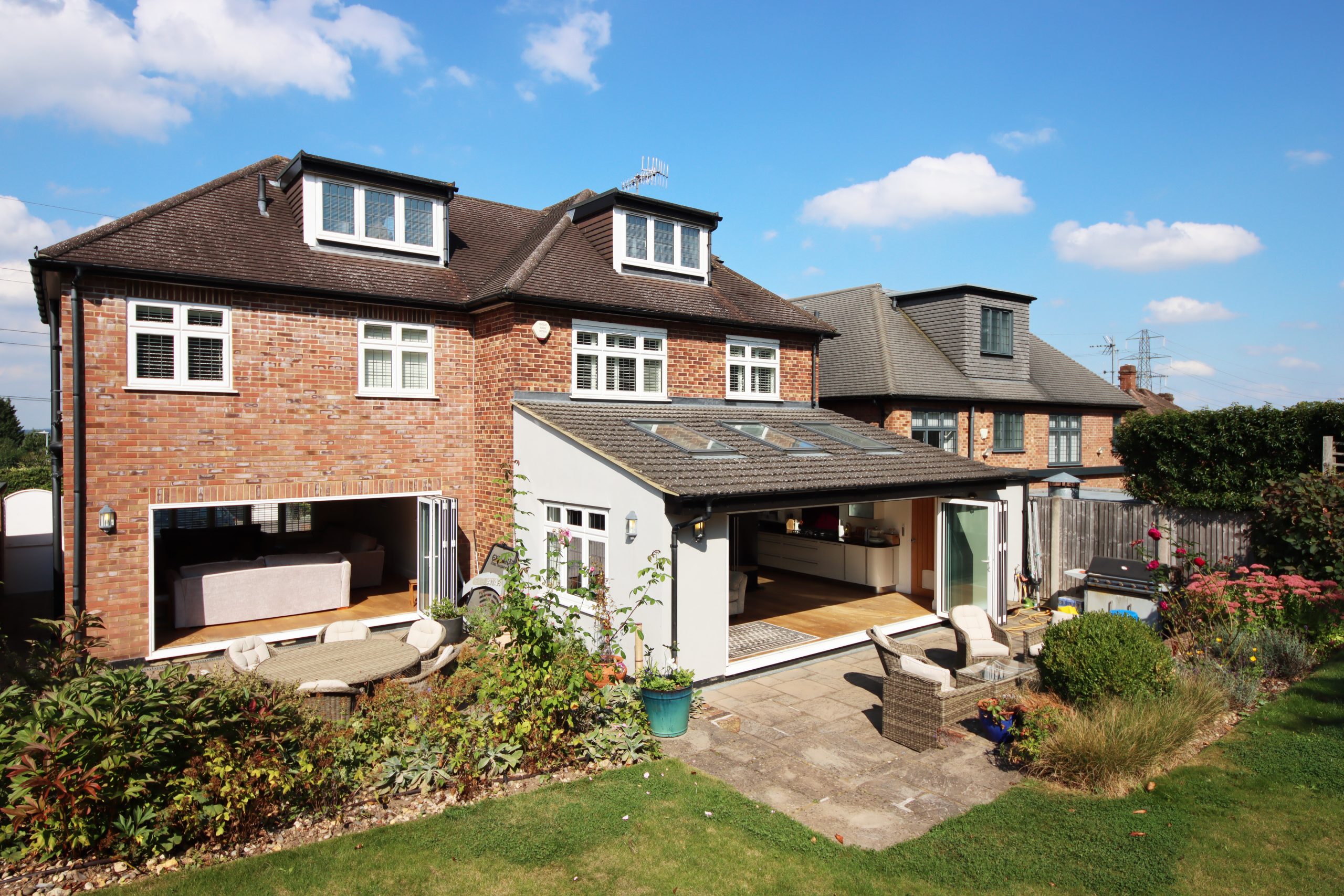 This wonderful five-bedroom, detached house is positioned on Clarks Mead, a quiet, sought-after residential street located in the heart of Bushey. Inside, the neutral palette and expansive glazing (in the form of bi-folding doors) work harmoniously to create a warm and wonderfully bright interior. An open-plan kitchen and dining room on the ground floor flows out onto a south-easterly facing landscaped garden, ideal for entertaining and al fresco dining. The house is within easy walking distance of the Bushey Heath’s popular high street and sits just moments from the Bushey United Synagogue.
