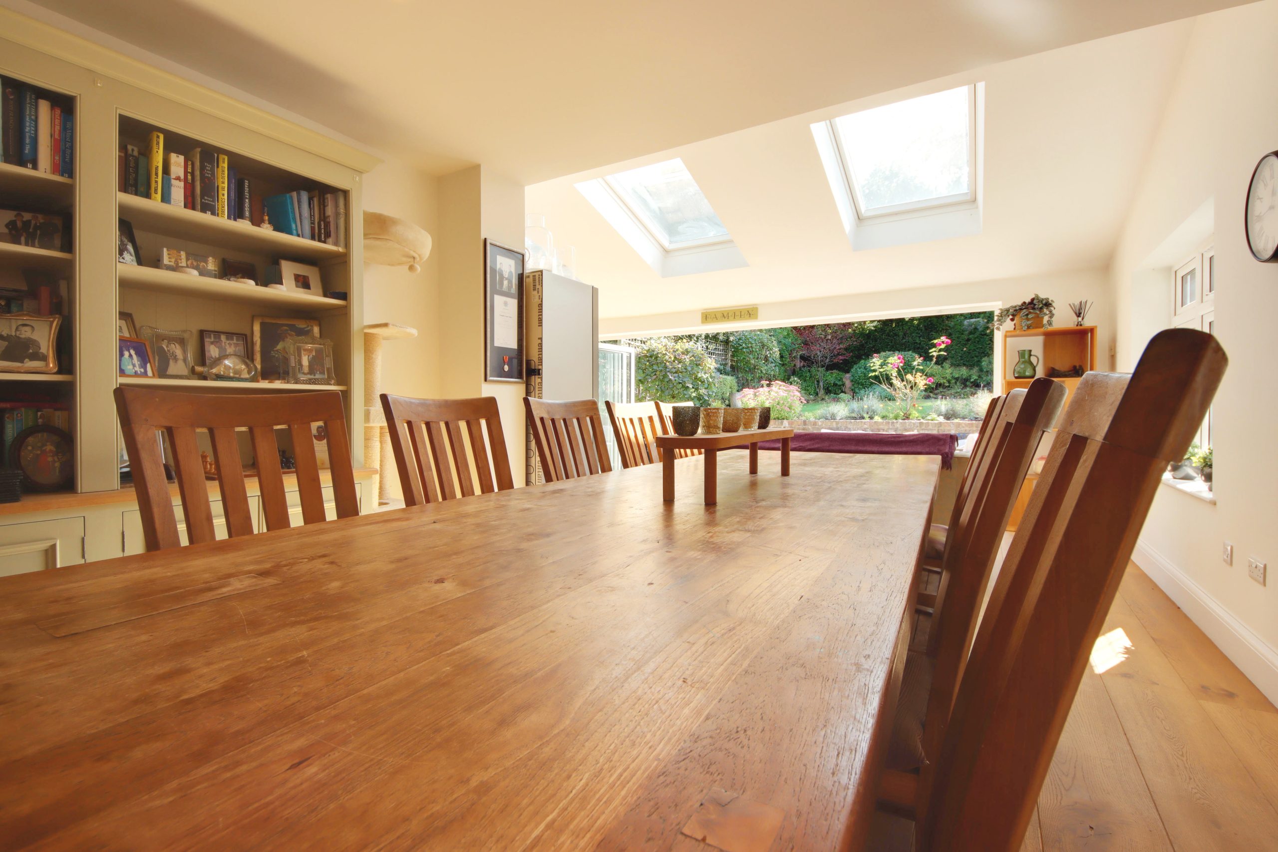 Access to the property is gained beyond a large, carriage driveway fit for four vehicles. Upon entering the residence, your are immediately greeted by a wide, light-filled hallway, home to a useful W.C, feature arch-top window and with heated, engineered oak flooring underfoot. To the right, a 14ft, tranquil living room is situated at the front of the plan. An-open plan kitchen and dining space occupies the back of the residence. The design includes pitched and flat ceilings which together accentuate the sense of volume in this part of the house. Natural light pours through skylights and expansive glazing at the rear, allowing the sun-drenched garden to act as the perfect backdrop. The kitchen itself is unmistakably modern; topped with black granite worktops, it’s comprehensive range of cabinetry and appliances are laid out so everything is within easy reach. The ground floor is completed by a second reception room, benefitting from a dual-aspect and measuring at impressive 21ft, this makes for the perfect space to entertain.