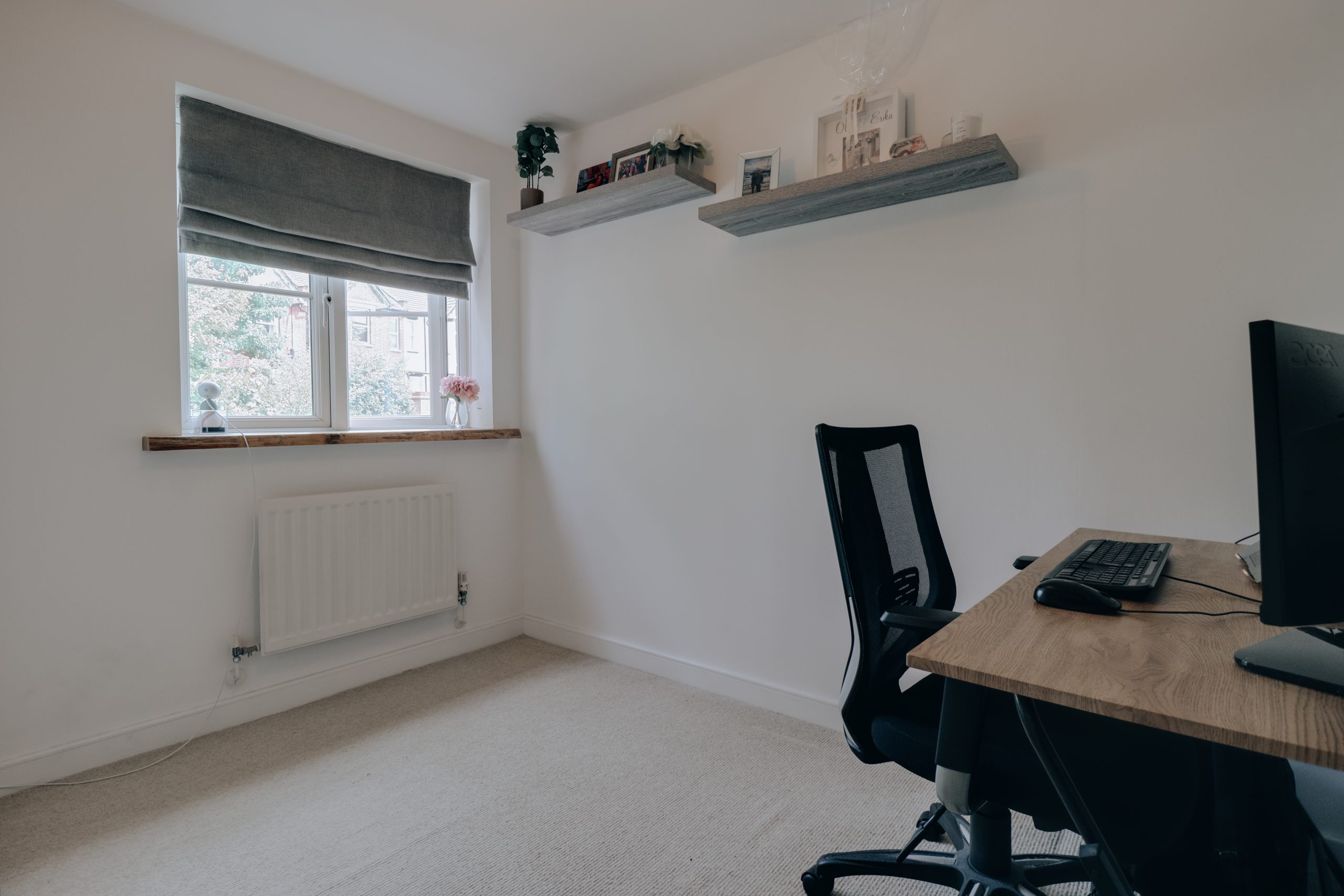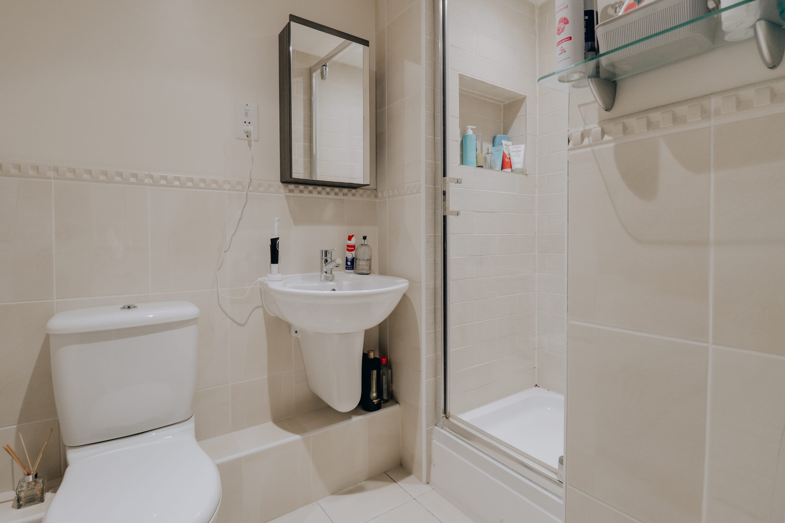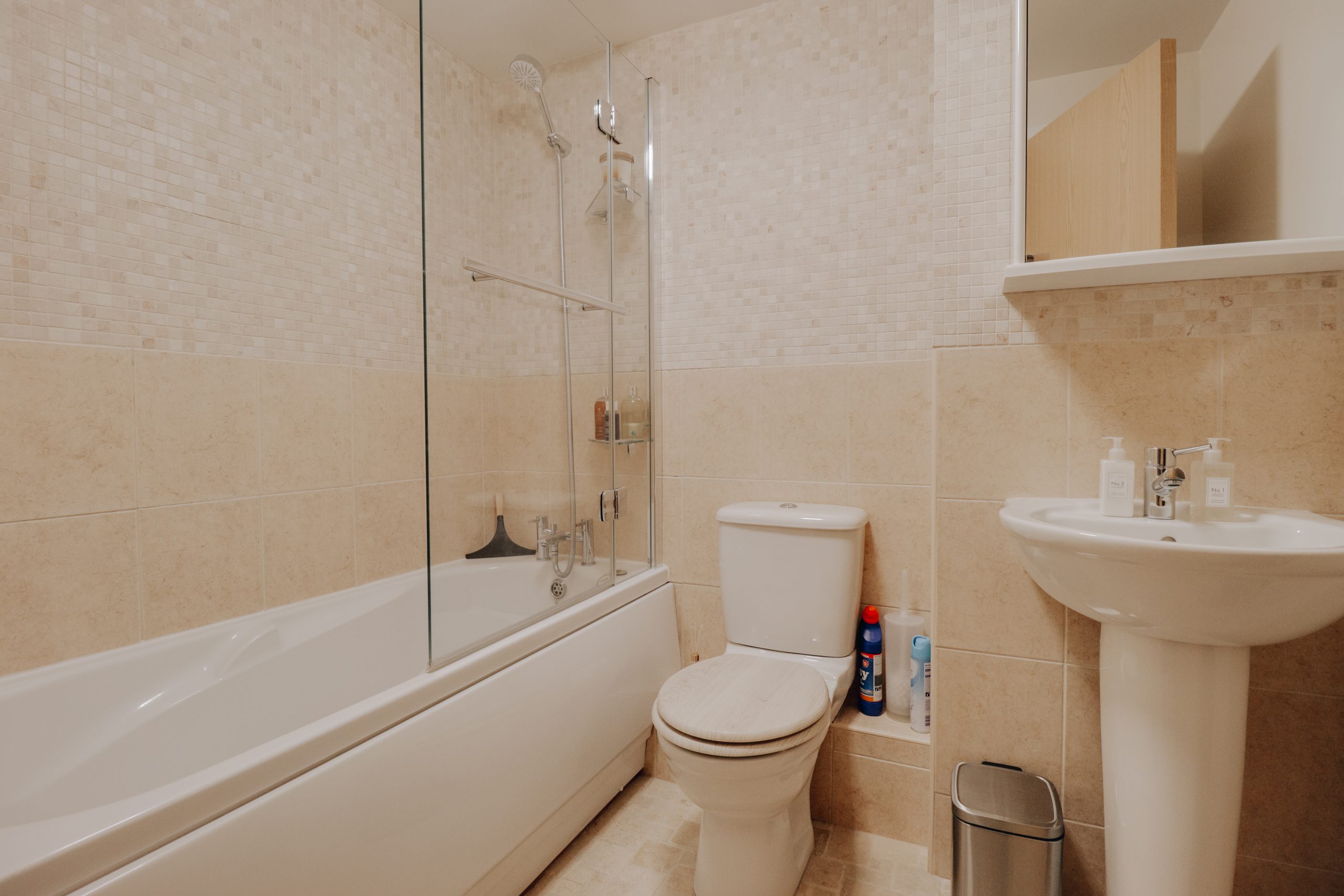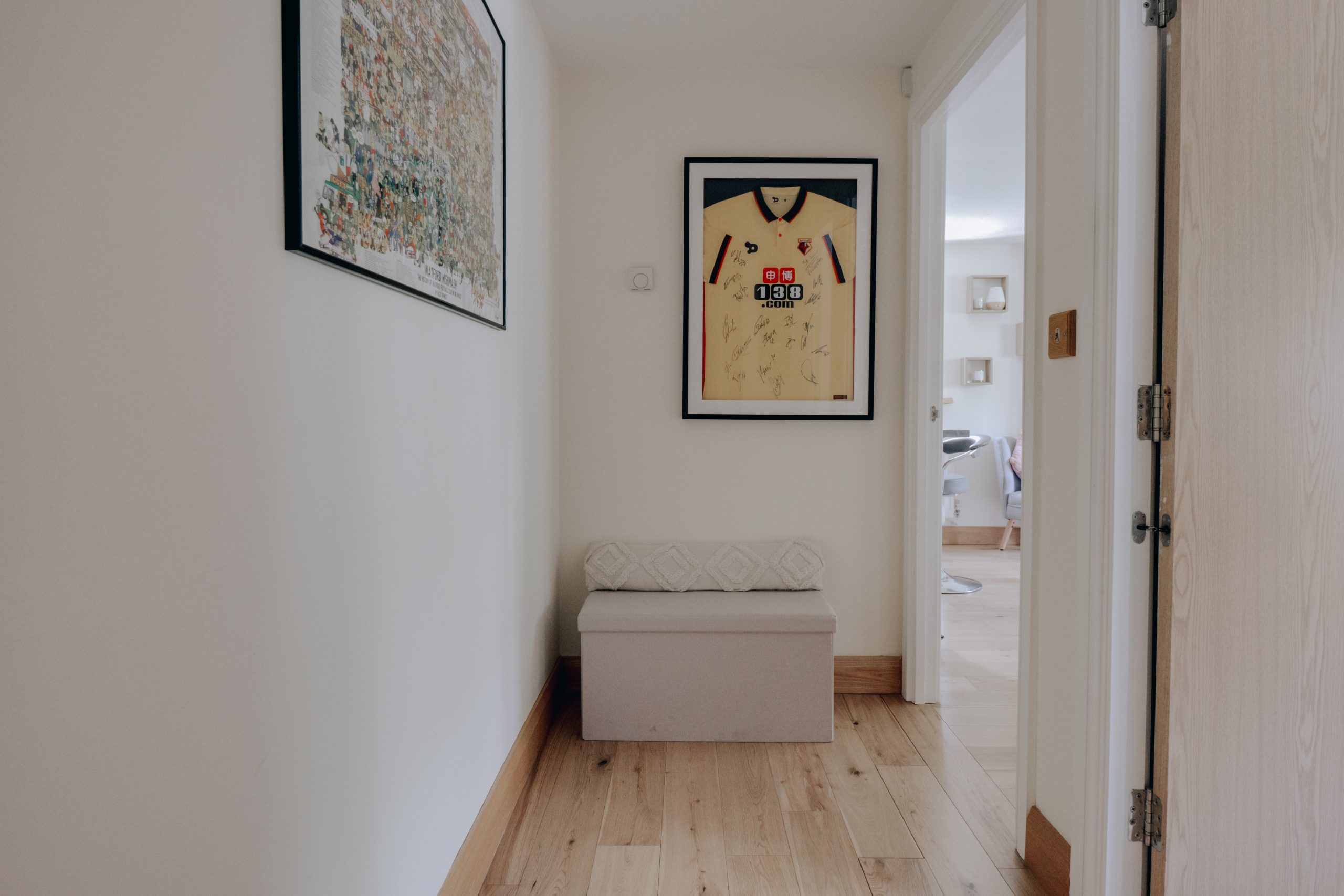 Both bedrooms are generous doubles, with the principal suite extending to an impressive 12ft and featuring a private en-suite bathroom. A beautifully finished family bathroom, tiled floor-to-ceiling in a calming neutral palette, completes the accommodation. A large storage cupboard in the hallway adds further practicality.