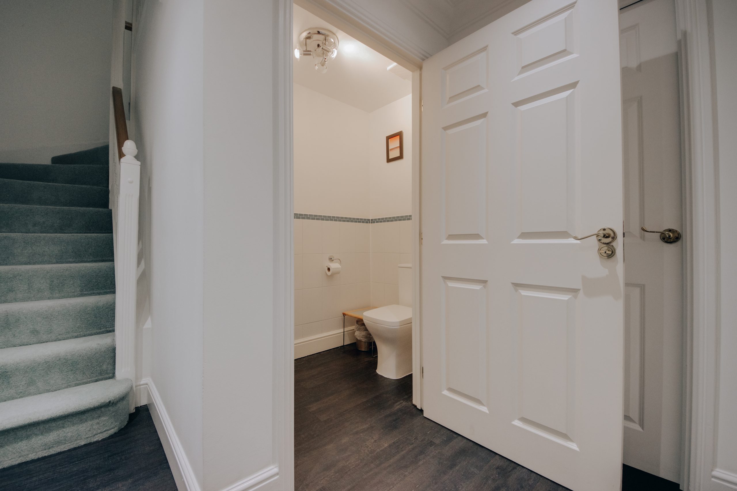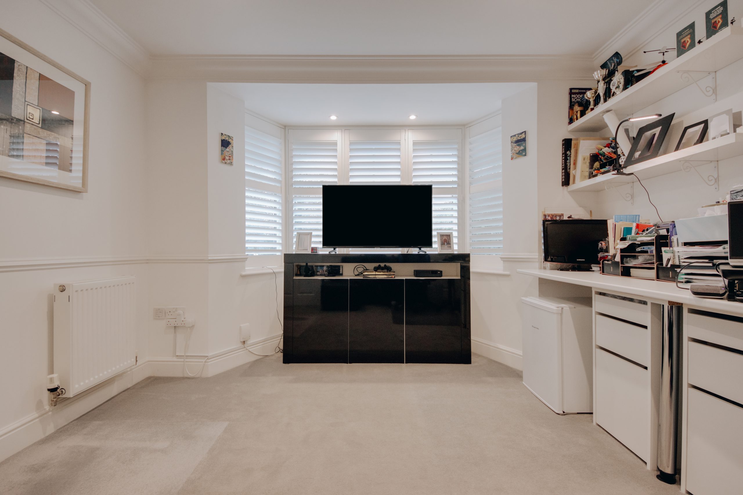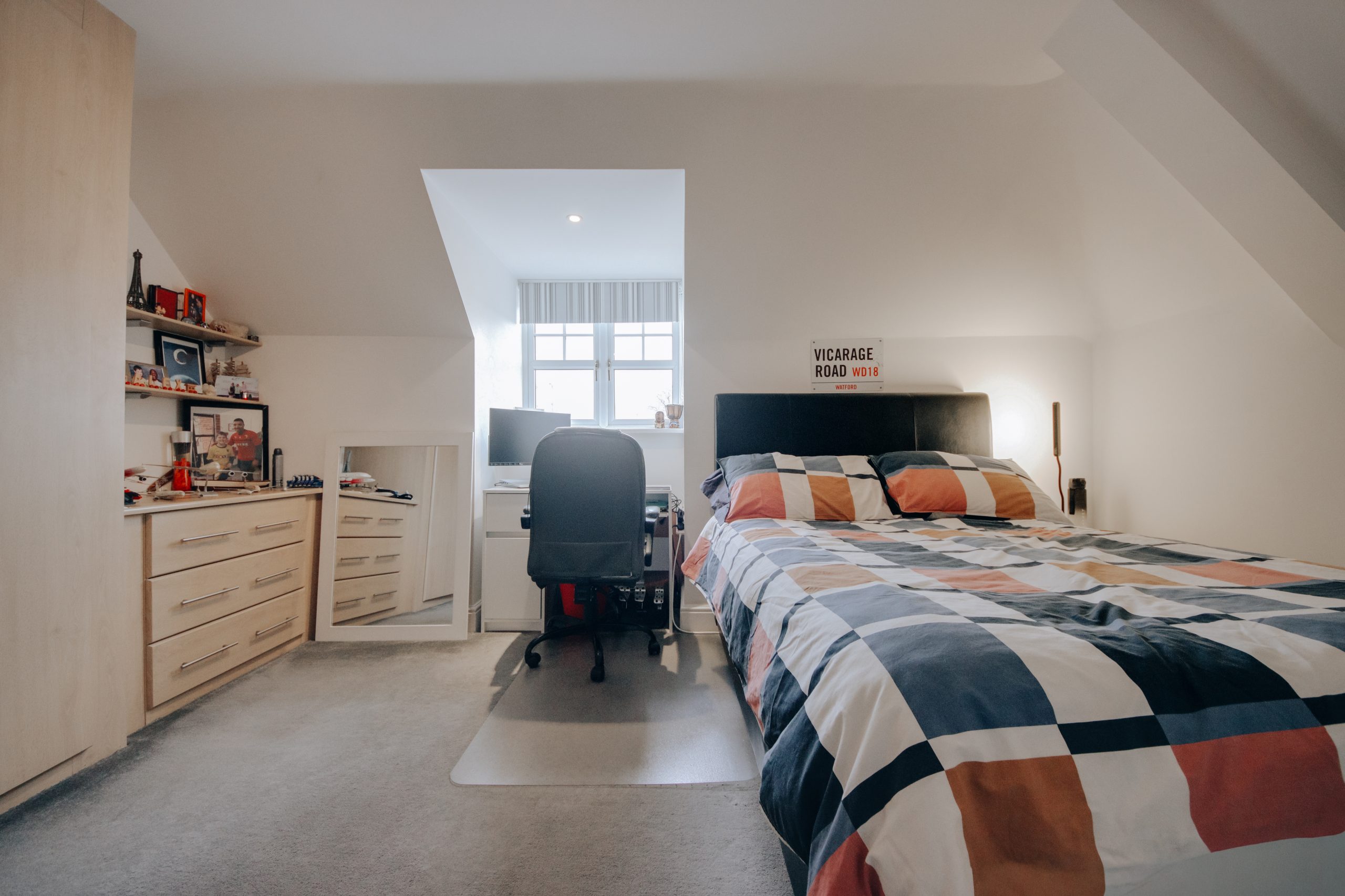 The first floor continues the theme of light, luxury and adaptability. The principal bedroom is immaculately presented, complete with bespoke fitted cabinetry, a dedicated dressing area and a sleek en-suite shower room, creating a private sanctuary above it all. Also on this level is the main living room, an impressive and airy space with double doors opening onto a full width balcony overlooking Oxhey Park. Much like the ground floor reception, this room offers flexibility. Neighbouring homes have successfully converted this into an additional bedroom, adopting a more conventional layout with living space below and bedrooms above. A further staircase rises to the second floor, where two generous double bedrooms and a stylish family bathroom complete the accommodation. Cohesive in design and turnkey in finish, every room feels aligned with the home’s contemporary character.