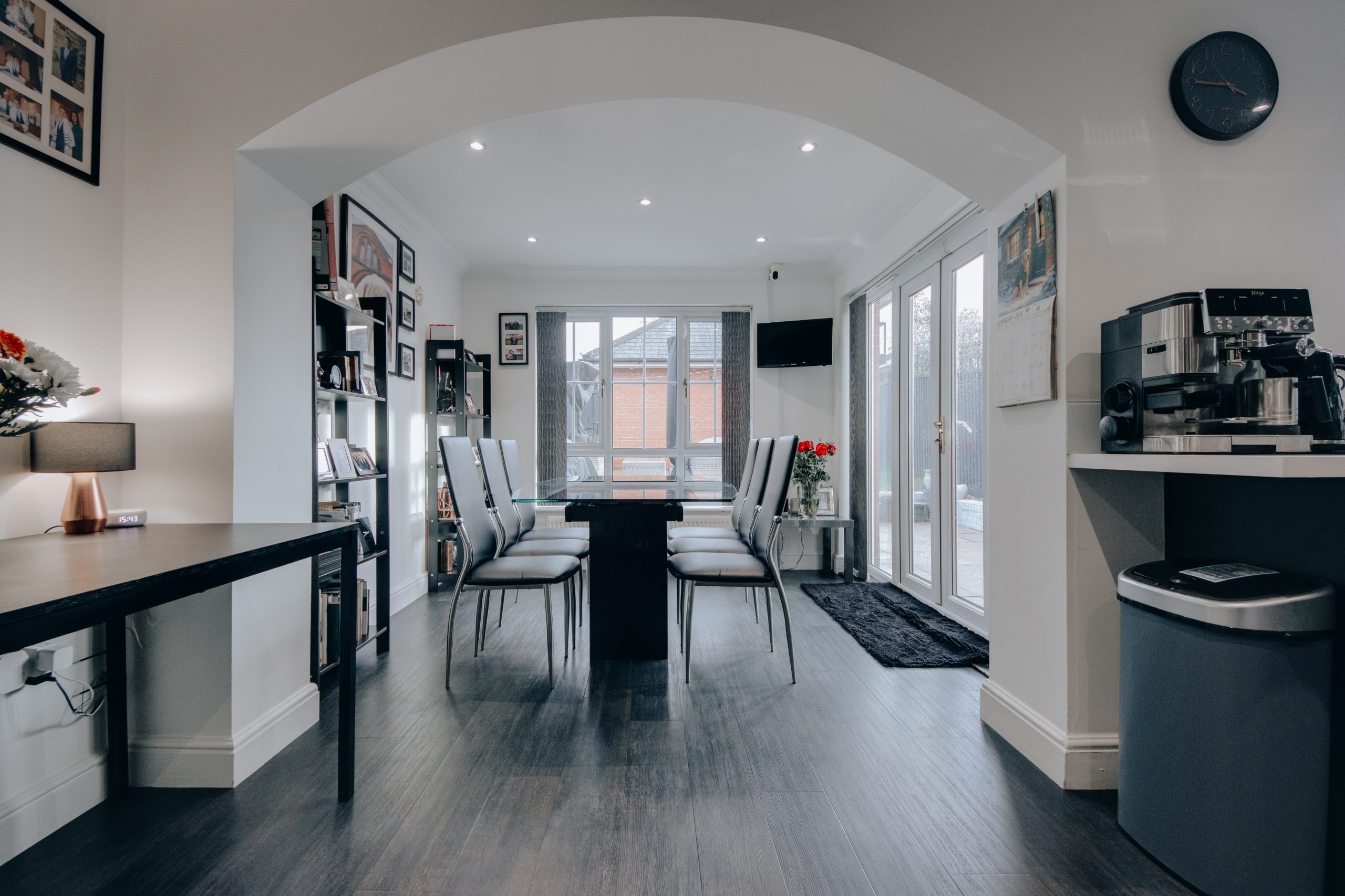 Step inside and the tone is set immediately. A wide, welcoming entrance hall offers breathing space, complemented by a practical ground floor W.C. The layout has been intelligently reimagined to create a fluid yet flexible living environment. To the front, a cosy sitting room with a north westerly aspect captures the golden evening light. Currently arranged as a TV room and study, it is equally suited to use as a ground floor bedroom for those seeking multi-generational living. To the rear, the home opens into an impressive 21’7” x 16’8” kitchen, dining and living space that forms the true heart of the house. Bathed in natural light from its south easterly orientation, this expansive room blends everyday functionality with entertaining flair. The bespoke kitchen is a true culinary centrepiece, featuring a five burner gas hob, two single ovens, two combination ovens, premium integrated appliances and beautifully crafted cabinetry, offering exceptional capacity for both family life and hosting on a larger scale. A separate utility room sits discreetly, keeping practicalities neatly tucked away without disrupting the flow.
