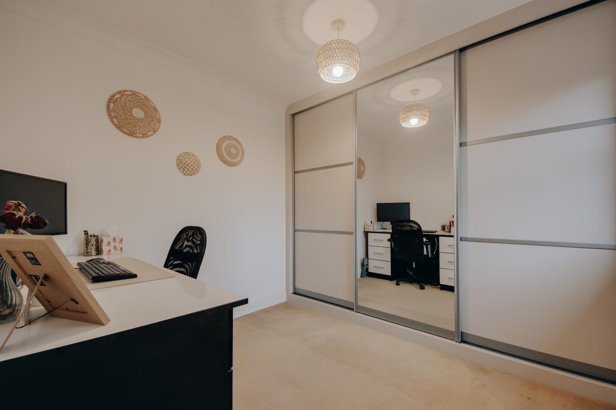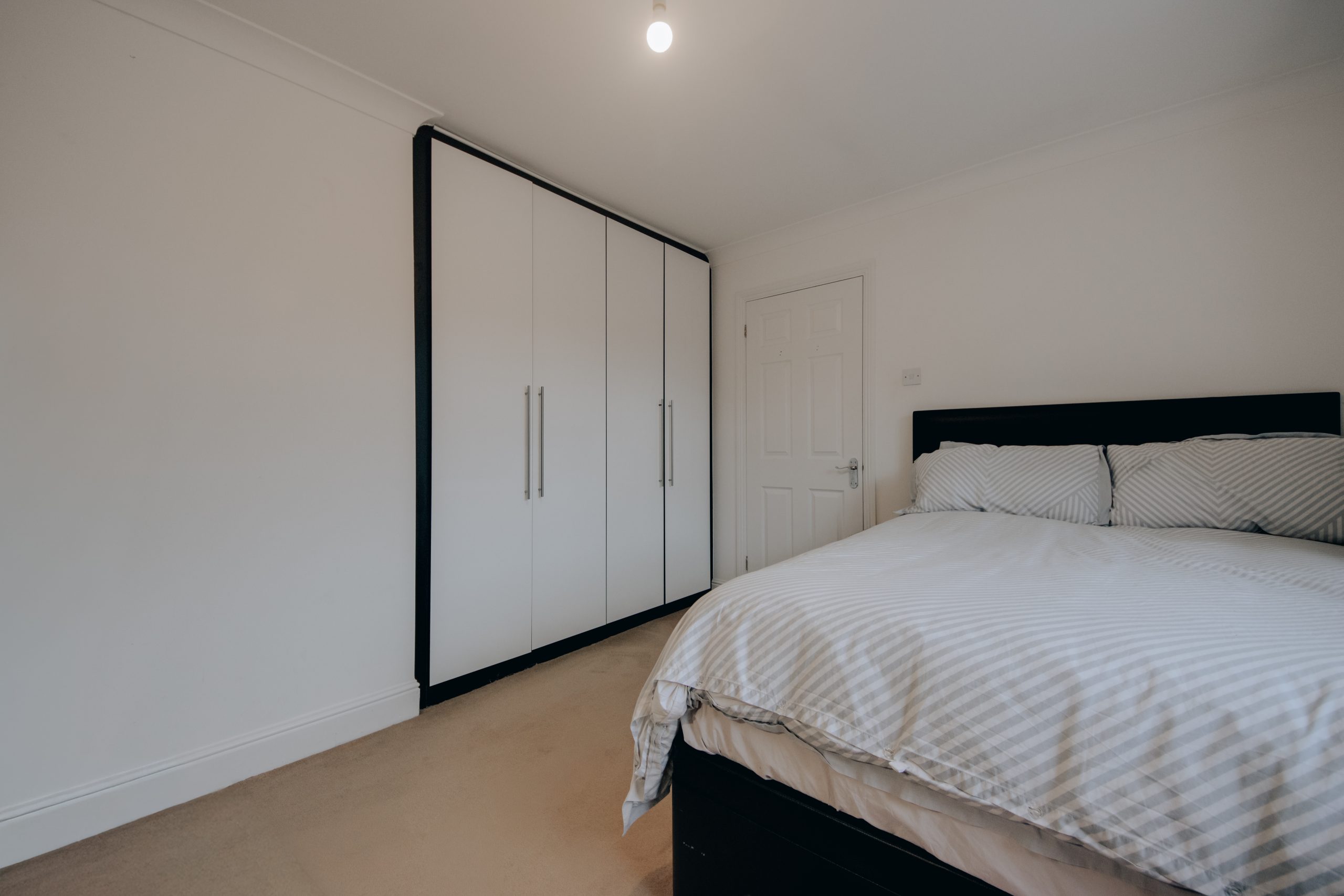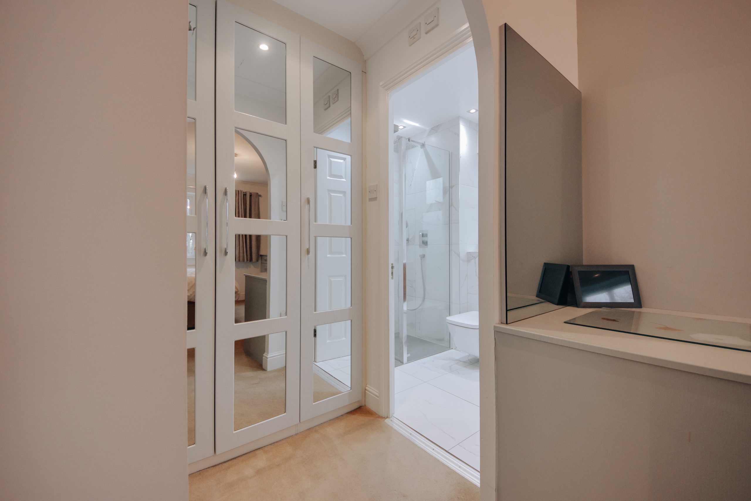 Upstairs, four generously sized bedrooms are arranged off a central landing. The principal bedroom is particularly impressive, measuring over 21ft in length and incorporating a dressing area and contemporary en-suite shower room. The remaining bedrooms are all well balanced, with space for built-in storage, and are served by a modern family bathroom finished with full-height tiling and a walk-in shower enclosure.