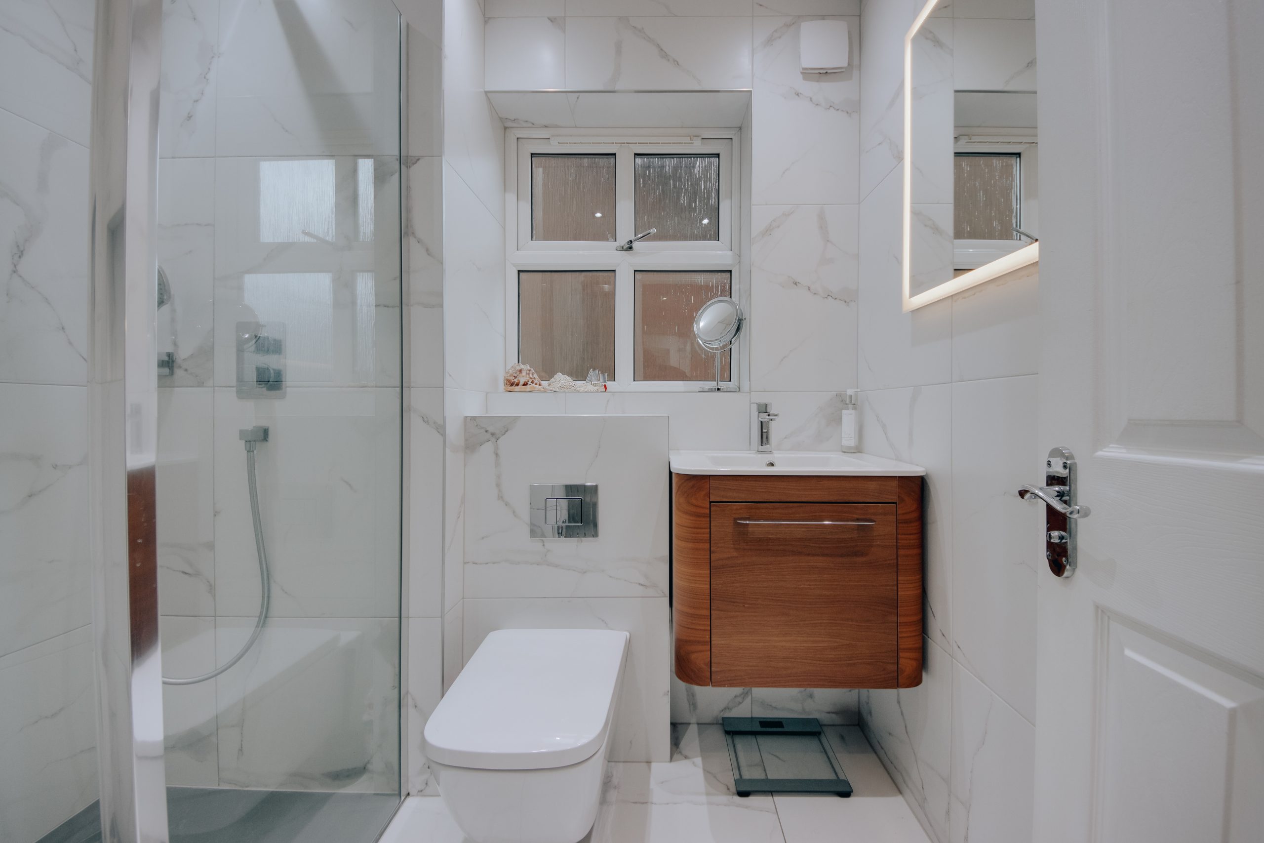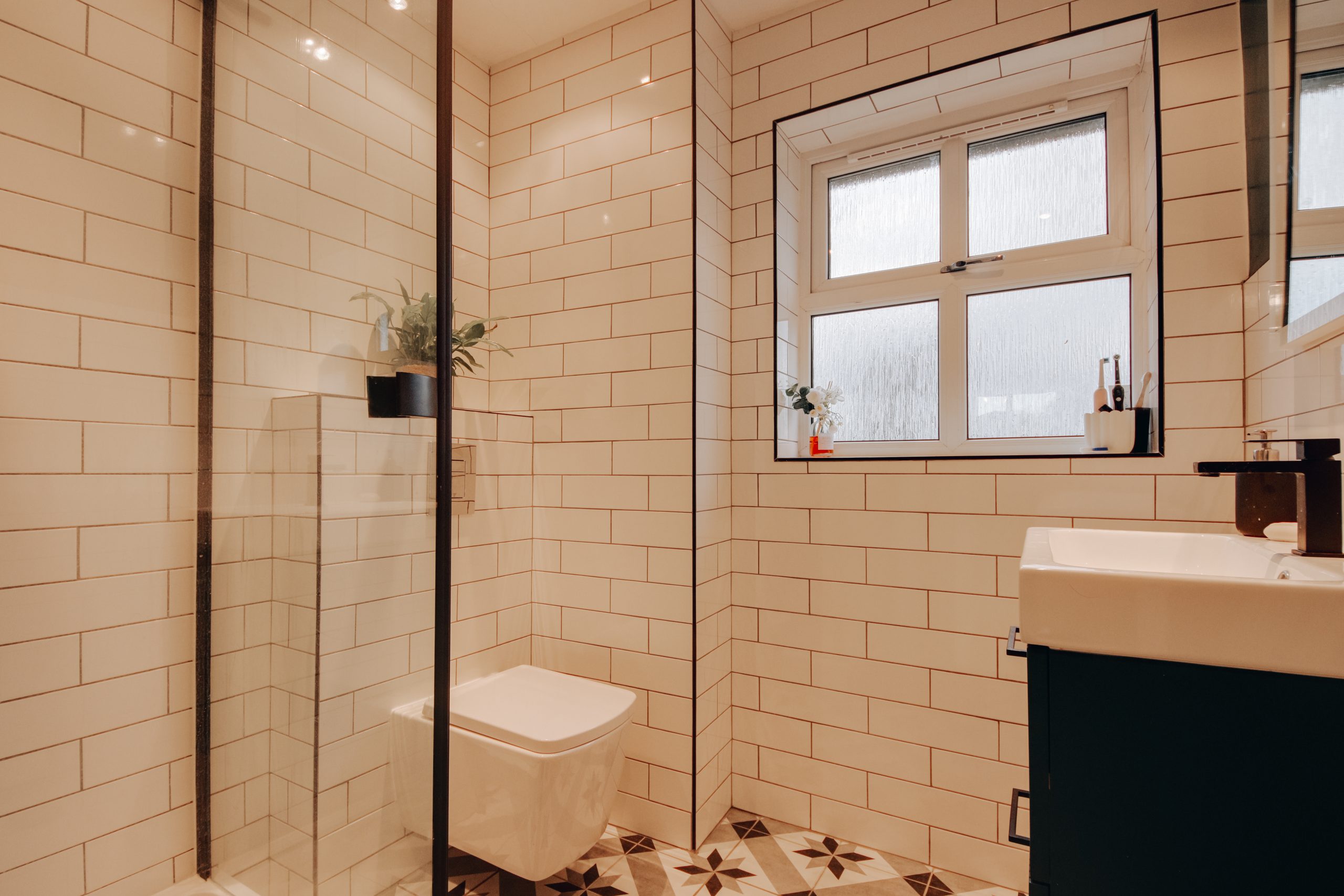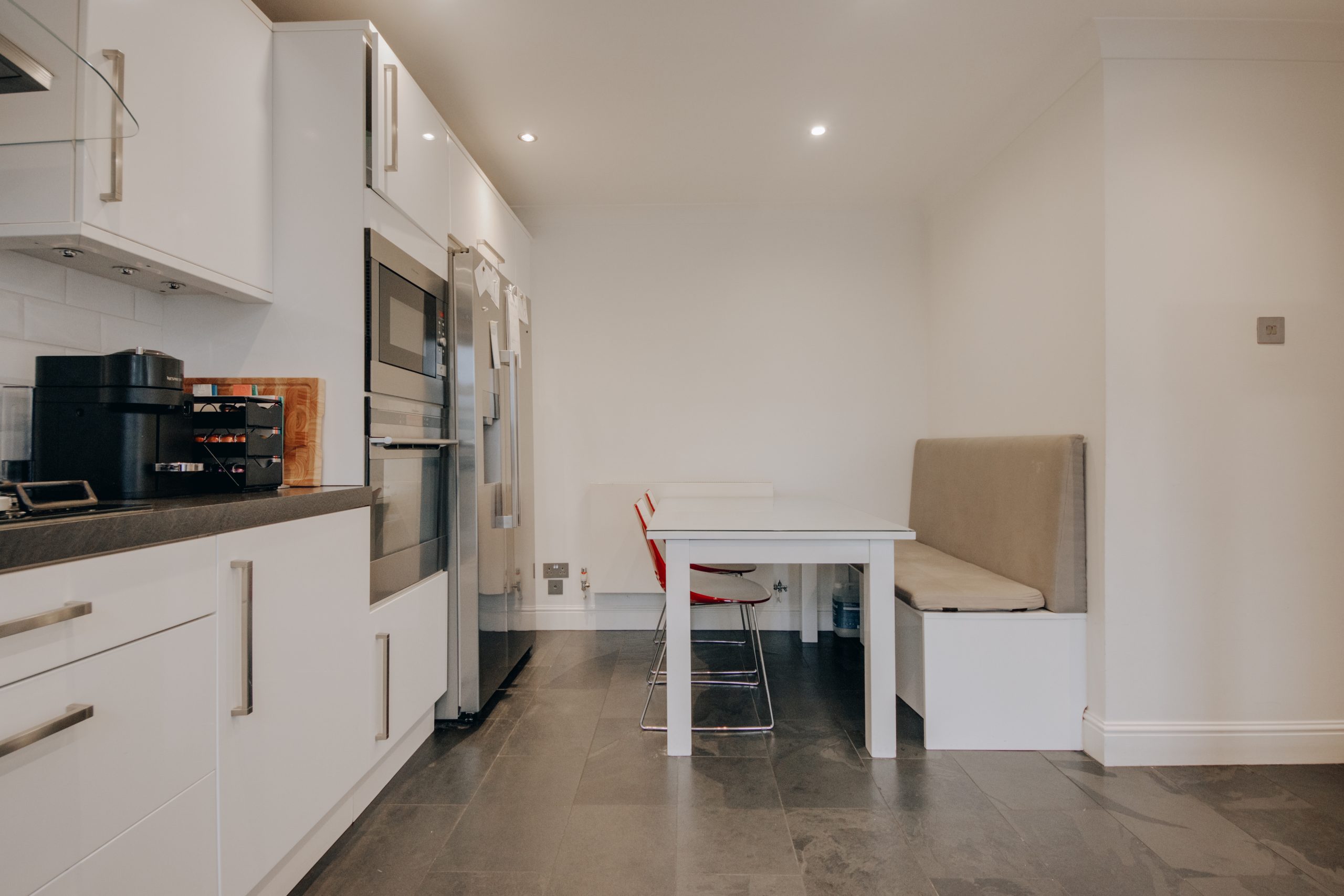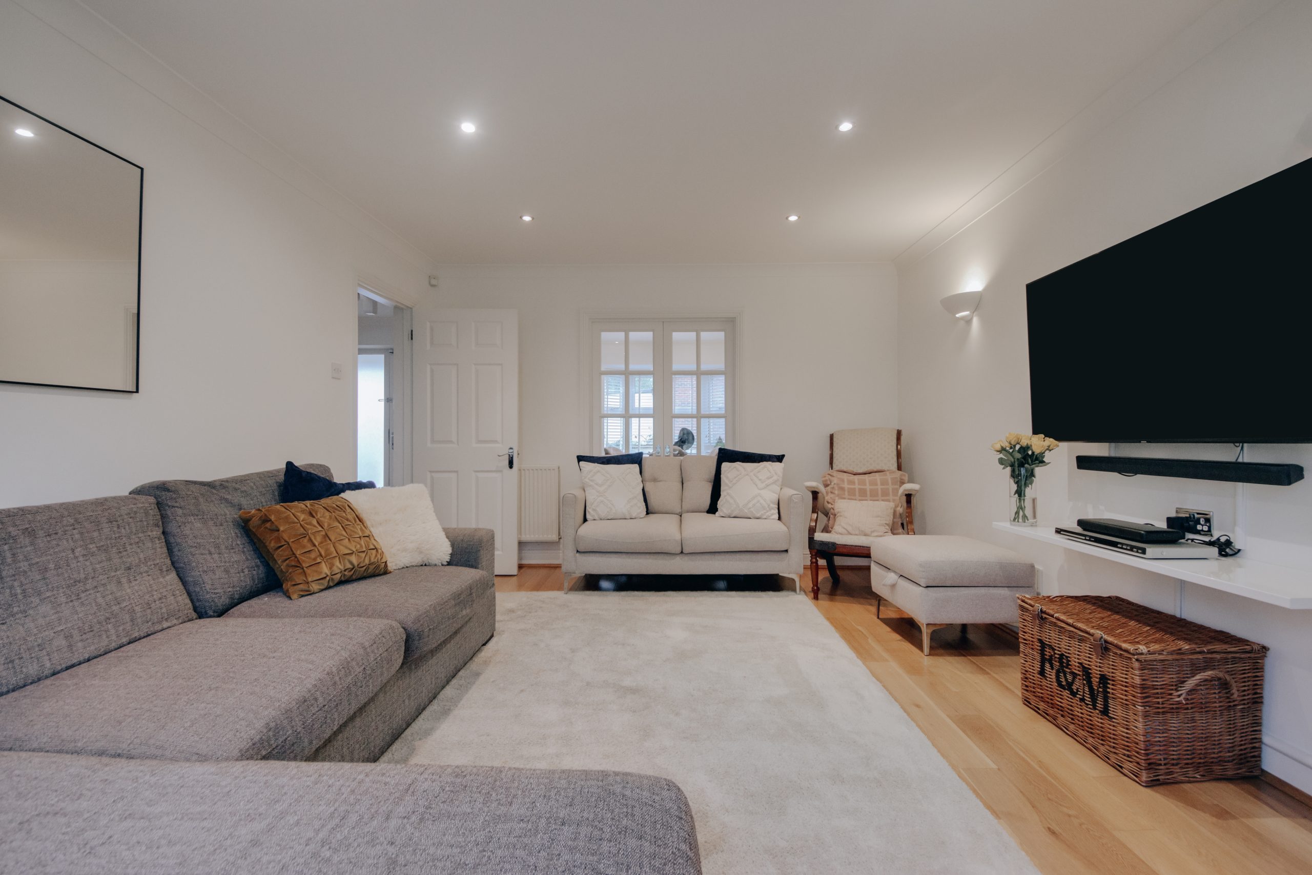 Inside, the tone is light and neutral, with generous glazing used to great effect. A welcoming entrance hall sets the scene, offering a bright first impression and a convenient ground-floor cloakroom. The principal living and dining space forms the heart of the home: divided by a partition wall and double doors, which when opened create an impressive through-lounge extending to over 30ft and anchored by a beautifully proportioned, east-facing bay window that draws in soft morning light. Positioned to the rear, the kitchen is both practical and well considered, fitted with white gloss cabinetry, grey worktops and integrated appliances. A thoughtfully utilised nook provides space for a breakfast table and built-in seating, giving the room a relaxed, everyday feel, while large areas of glazing ensure the space remains bright and connected to the garden beyond. A separate study sits to the front of the house and could comfortably serve as a fifth bedroom if required.