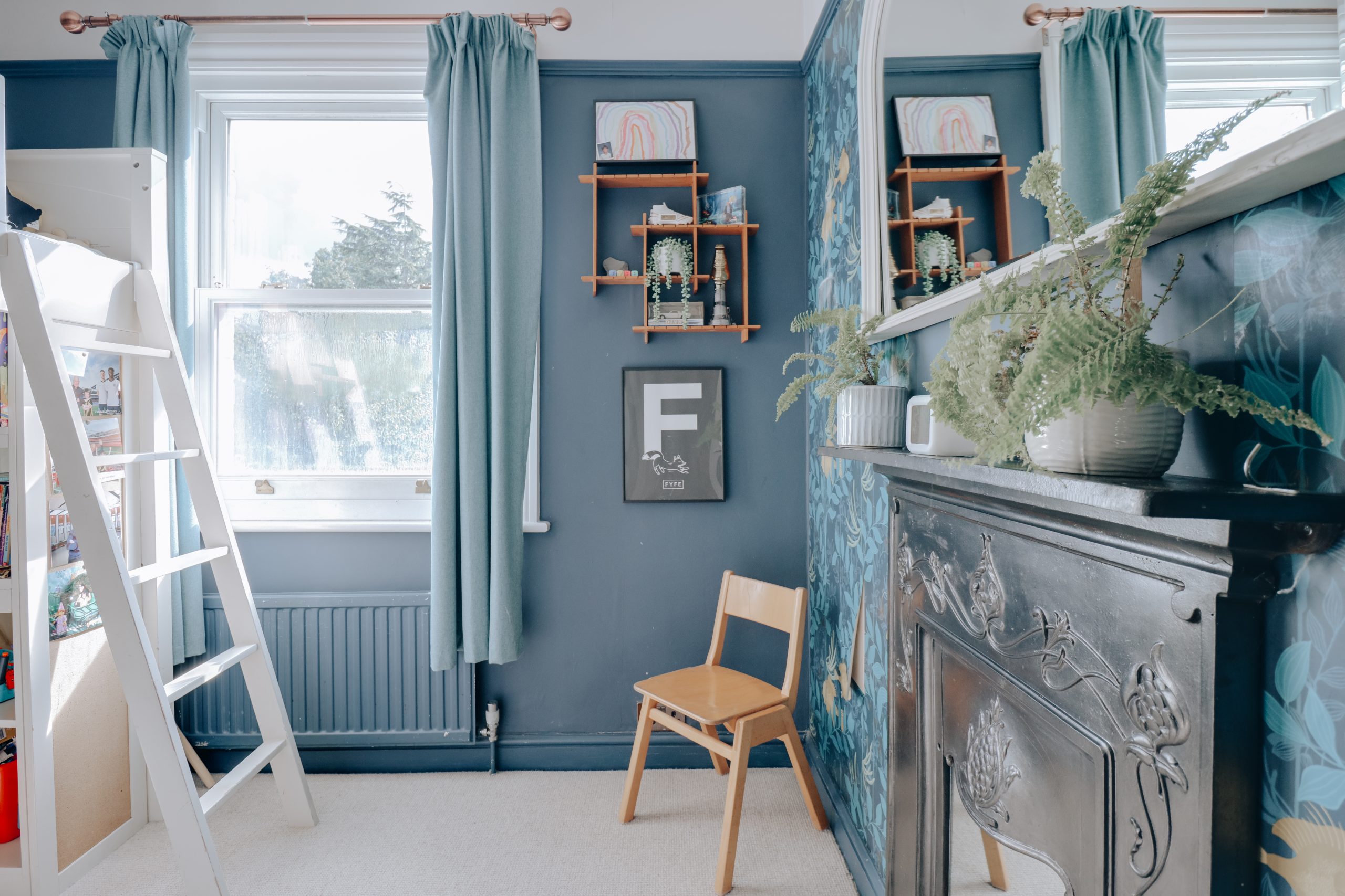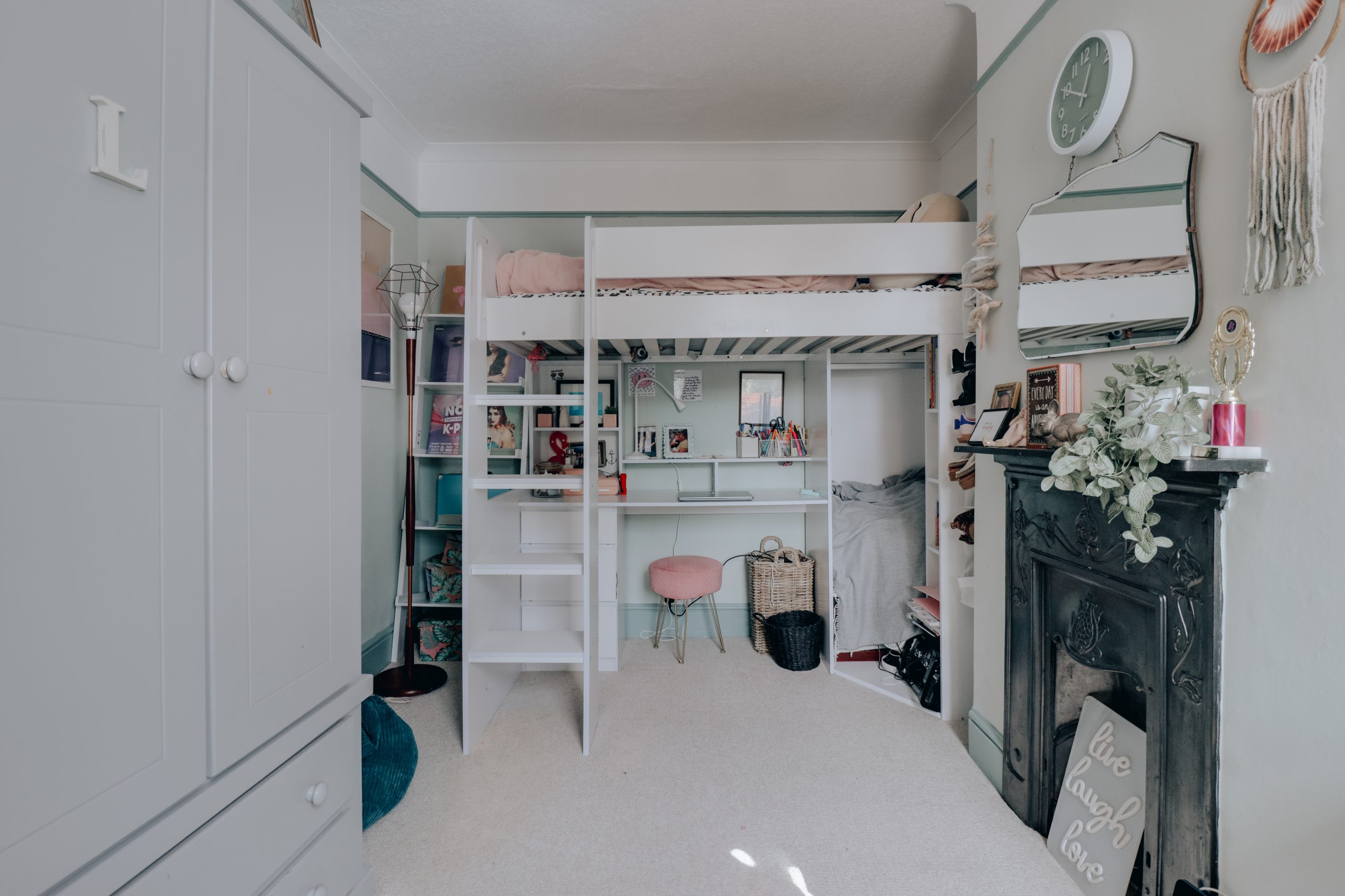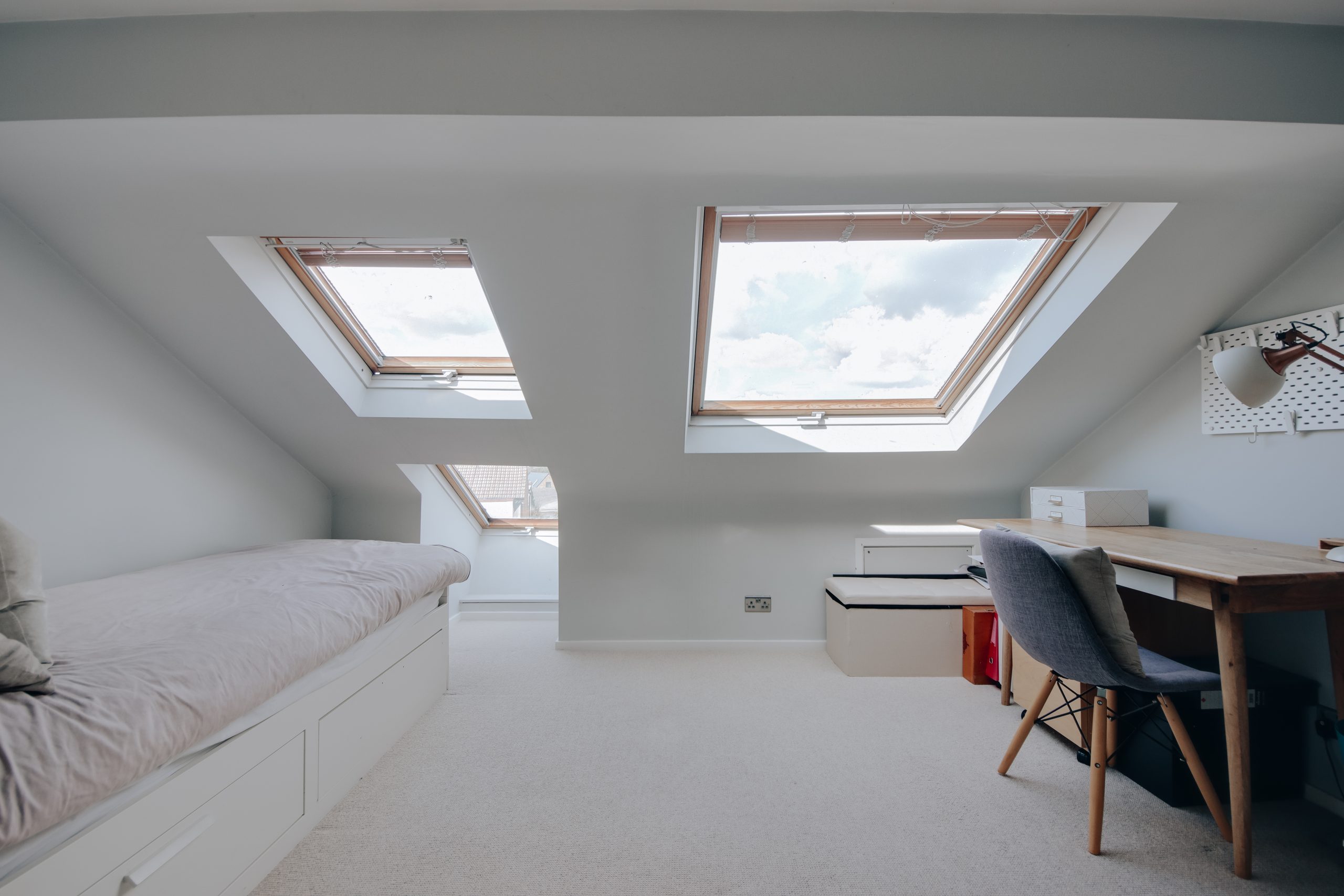 A staircase leads to the first floor, where three generously sized bedrooms await. The principal bedroom, measuring 12’6” x 13’11”, serves as a tranquil retreat, complete with its own en-suite shower room. Styled in a deep navy palette, the room is beautifully complemented by warm wall lighting, period ceiling roses, and decorative pendants, creating an atmosphere that is both serene and sophisticated. The two further bedrooms continue the home’s elegant design language, each finished to a high standard and maintaining a cohesive aesthetic throughout. A beautifully appointed family bathroom completes this level, while a further staircase rises to the third floor, home to the fourth bedroom. Currently set up as a home office, this versatile space is enhanced by clever storage tucked neatly into the eaves with the advantage of a quasi-ensuite; accessible from the landing, it serves both as a private ensuite and as an additional bathroom for the rest of the household.