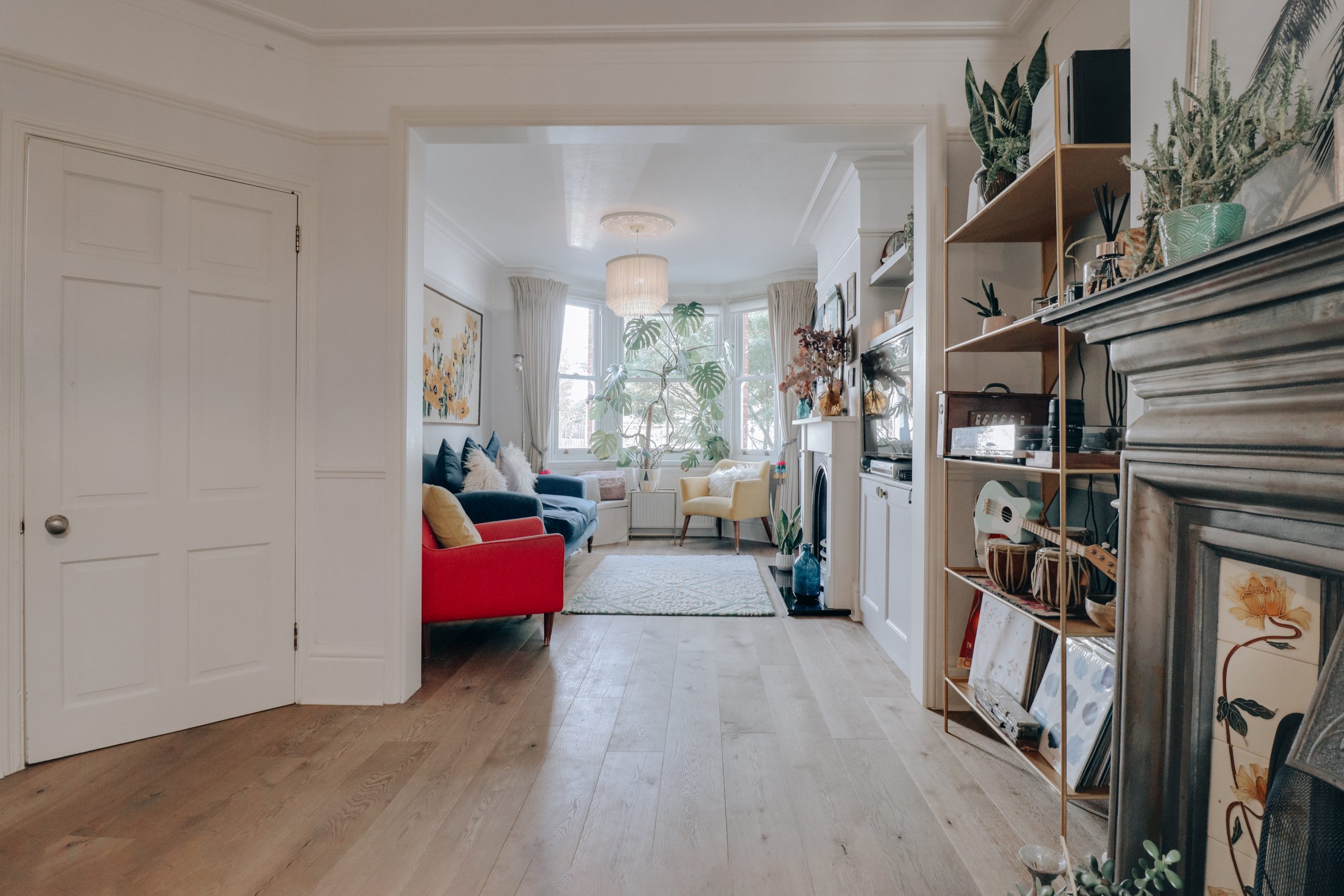 As you step inside, a spacious hallway sets the tone, flowing naturally towards the heart of the home. To your left, the impressive through-lounge (27’11” x 9’9”) unfolds; once two separate rooms, now combined to create a single, elegant space perfectly suited to entertaining yet equally ideal for quiet evenings. Bathed in natural light from the bay window, the room showcases original cornicing and a photo rail, with two striking fireplaces (both recently swept) adding warmth and character. The kitchen is, without question, the showpiece of the house. Thoughtfully extended and cleverly arranged into distinct zones, it delivers both form and function with ease. Set at a 90-degree angle, the cabinetry wraps around two walls, incorporating a five-point gas hob, vibrant orange splashback, central island, and a full suite of integrated appliances. The island doubles as a serving station while the generous proportions of the room easily accommodate a large dining table. The sense of light here is remarkable, with full-depth skylights stretching above and double doors opening directly onto the south-easterly facing garden. It’s a design feature that makes artificial lighting almost redundant and creates a unique sense of openness.
