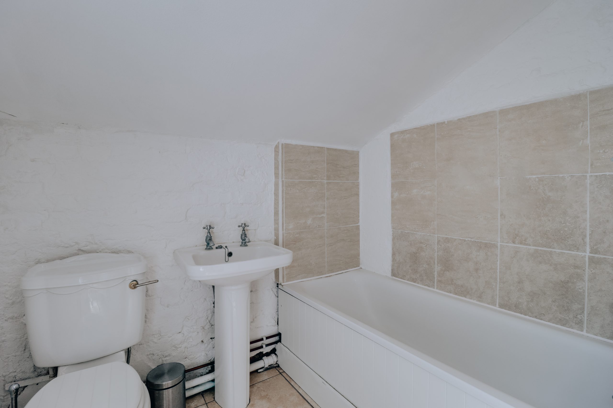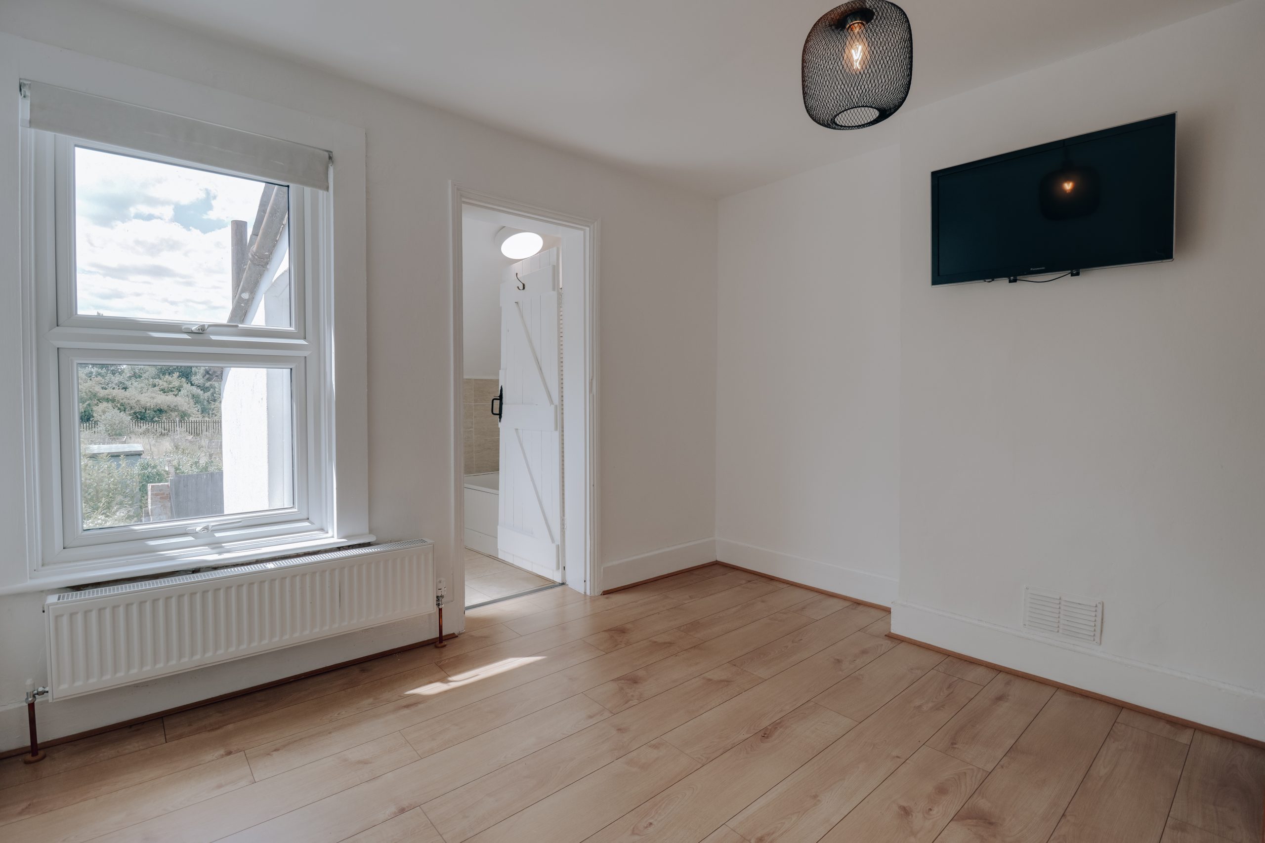 Step through the front door into a wonderfully light and airy open-plan living/dining area, stretching an impressive 25' x 10'11". High ceilings, statement lighting, and neutral flooring set the tone for a flexible, easy-going space that works just as well for dinner parties as it does for cosy evenings in. To the rear, the galley-style kitchen is smart and efficient, fitted with sleek white cabinetry, polished chrome finishes, and freestanding appliances - offering both style and practicality. Upstairs, the first floor hosts two bedrooms and two bathrooms. The principal bedroom is bathed in morning light thanks to an east-facing sash window and benefits from its own en-suite, formerly the main family bathroom. Across the landing, a compact second bedroom (10'11" x 5'8") lends itself perfectly to use as a home office, nursery, or dressing room. A second set of stairs leads up to the converted loft room, which enjoys generous head height to the rear and a skylight overhead for added natural light.