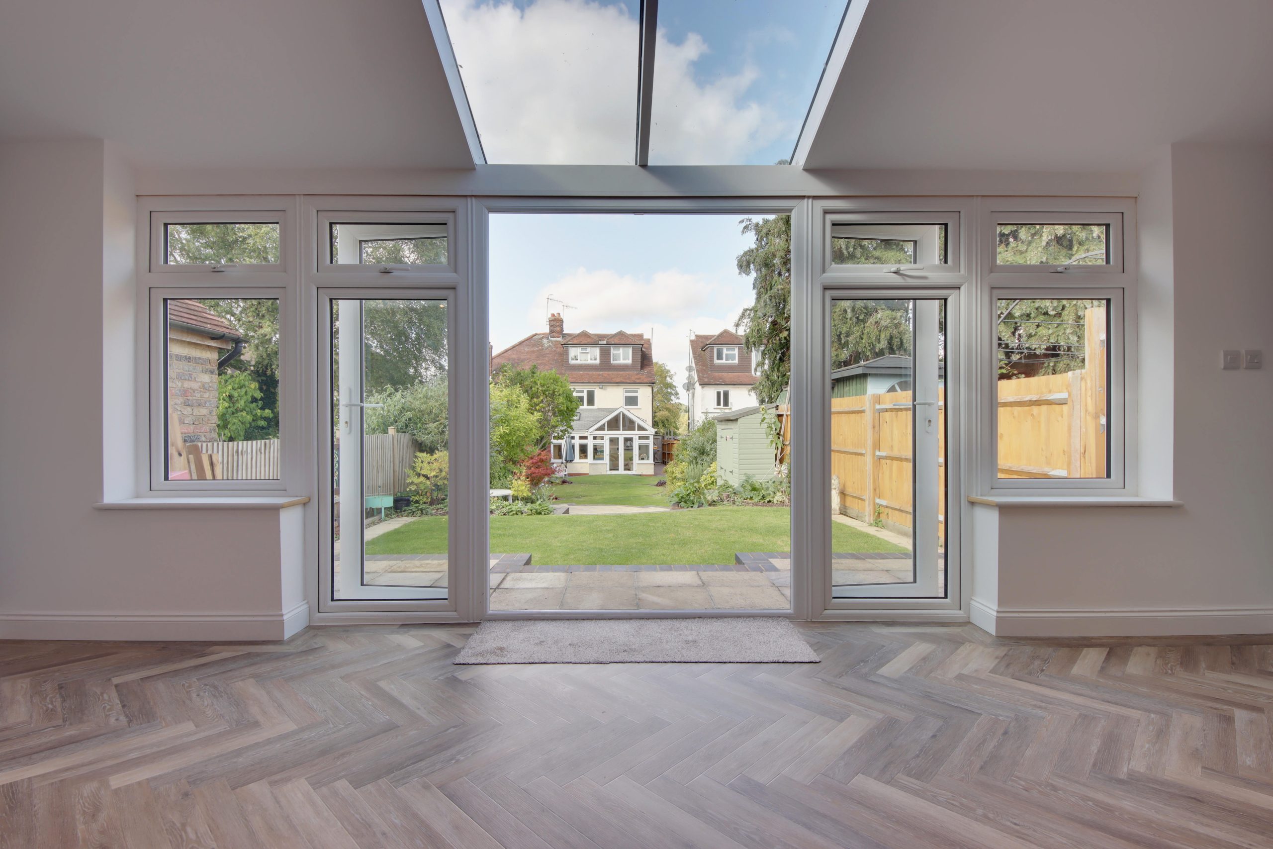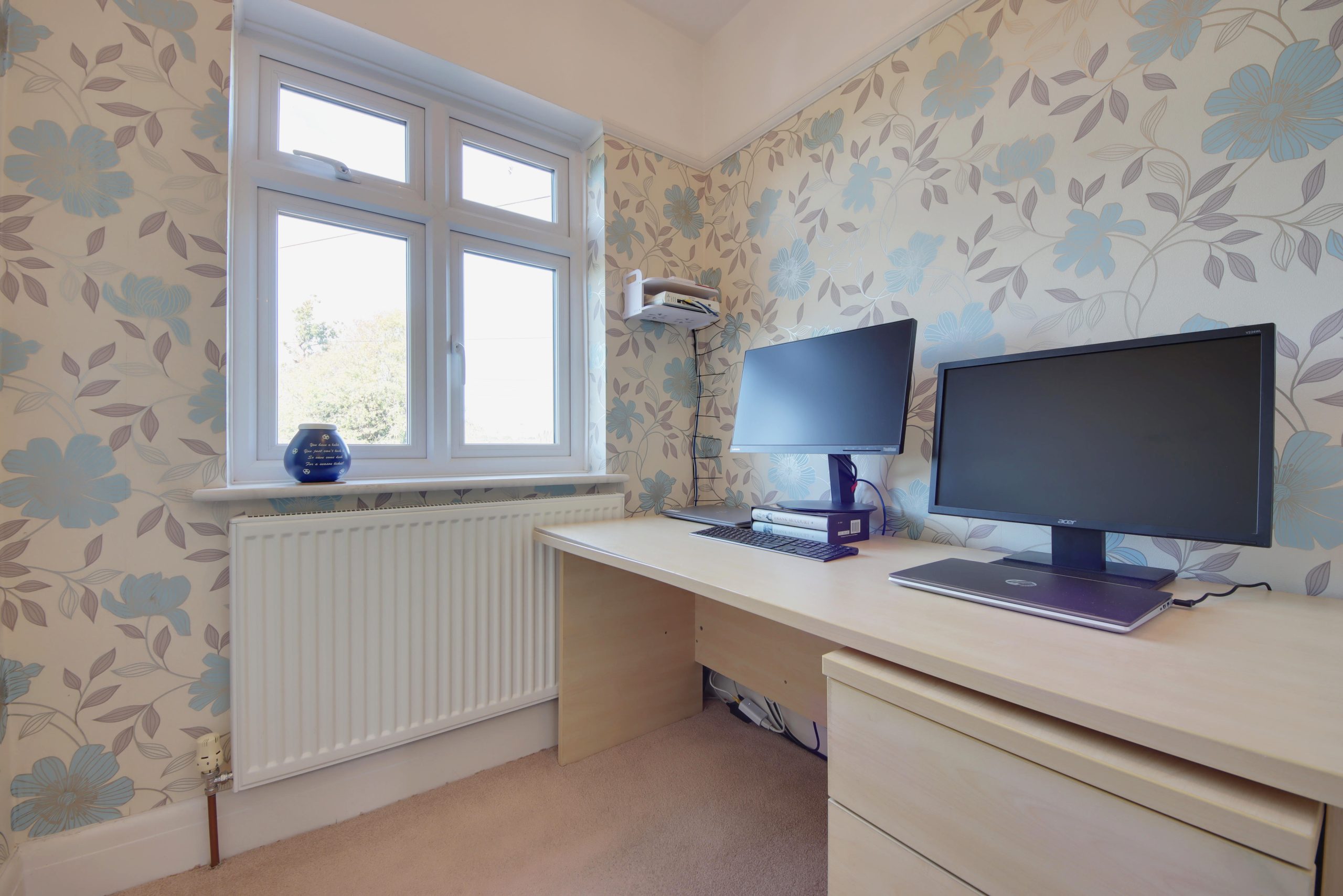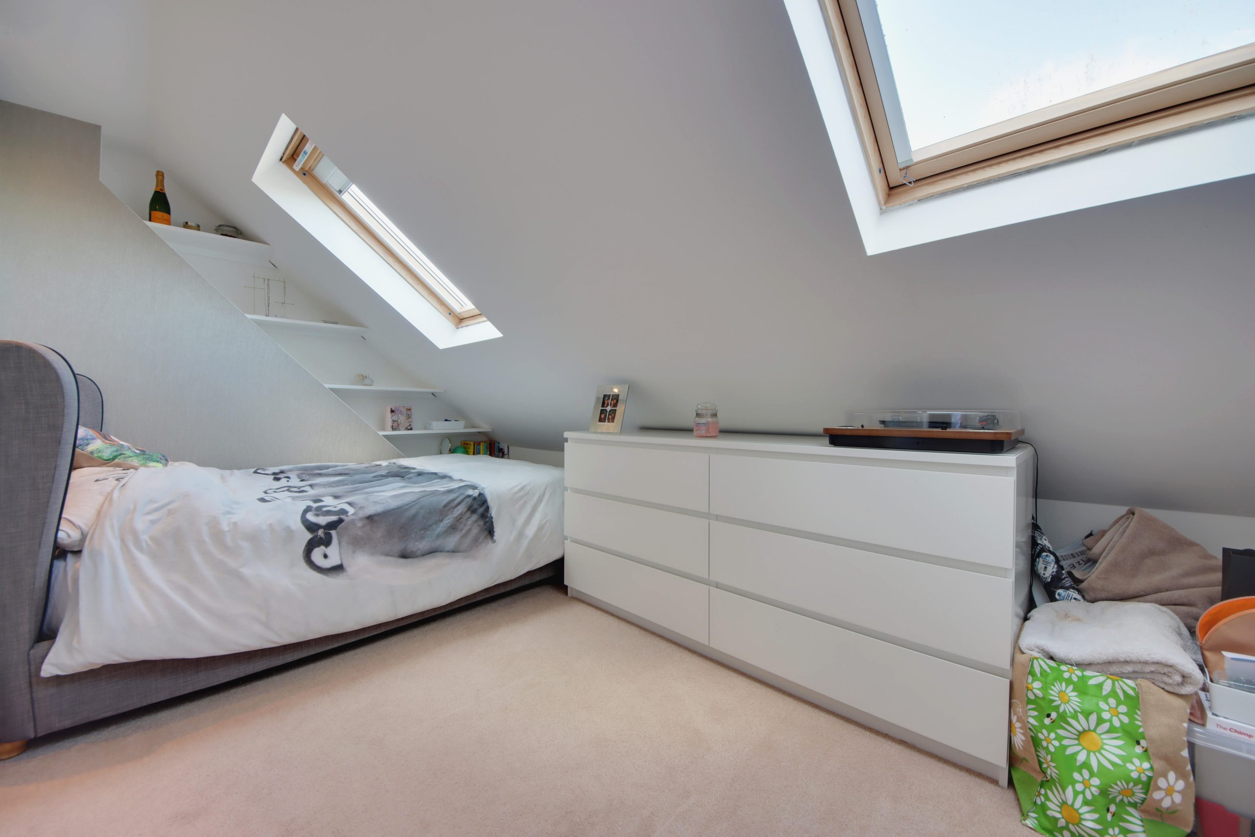 A staircase ascends to the first floor where a spacious landing (currently home to a study) leads to the two double bedrooms. The main bedroom measures at an impressive 14ft and comes equipped with a large bay window inviting an excellent quality of natural light. The first floor is completed by a contemporary family bathroom. Two additional bedrooms and a second bathroom occupy the second floor which remains stylistically cohesive with the rest of the house.