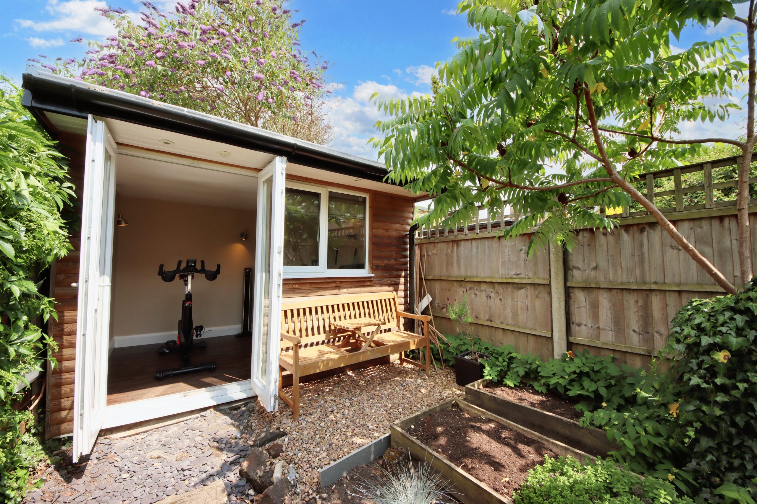 The north-easterly facing garden flows seamlessly from the rear of the house, centred around a well-maintained lawn. This serene outdoor space includes a practical 10ft outbuilding and a single gate providing convenient access to a service pathway.