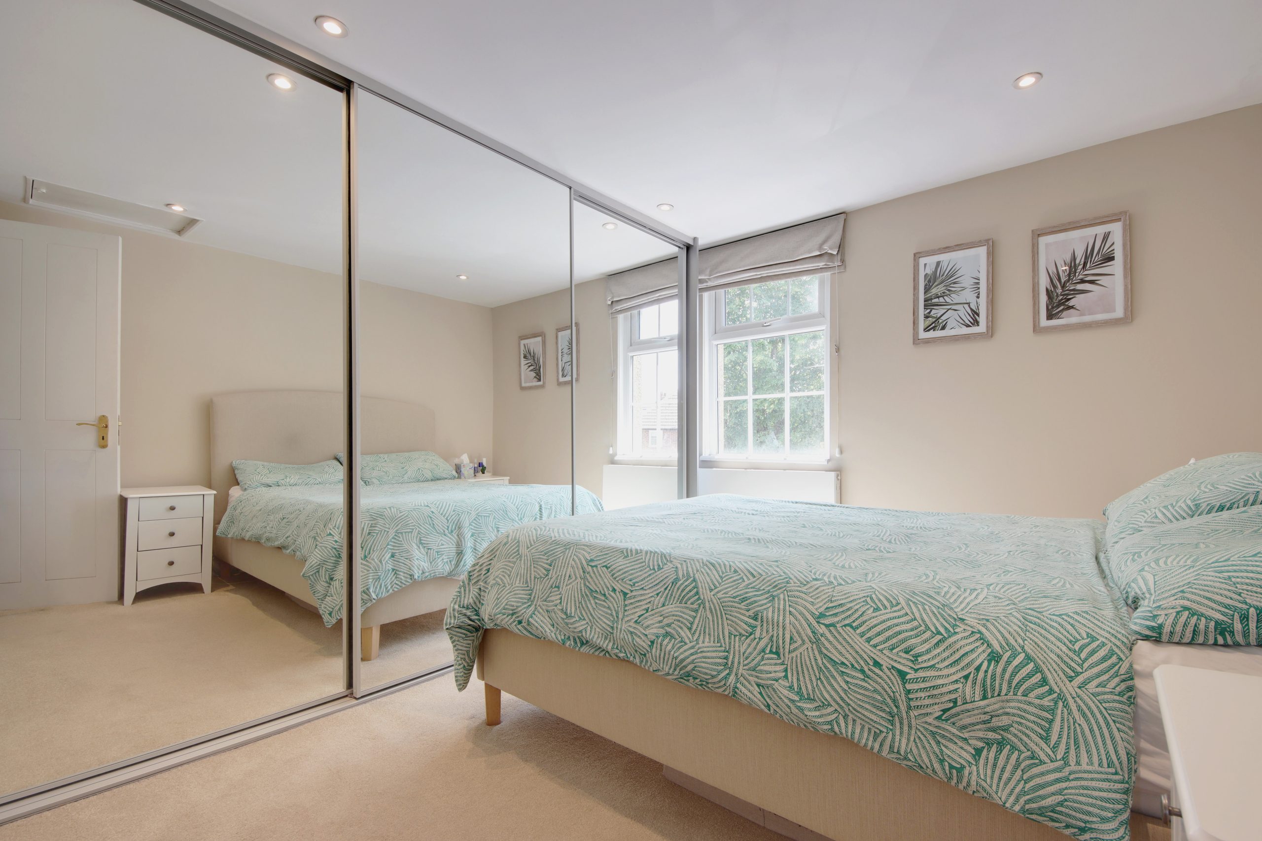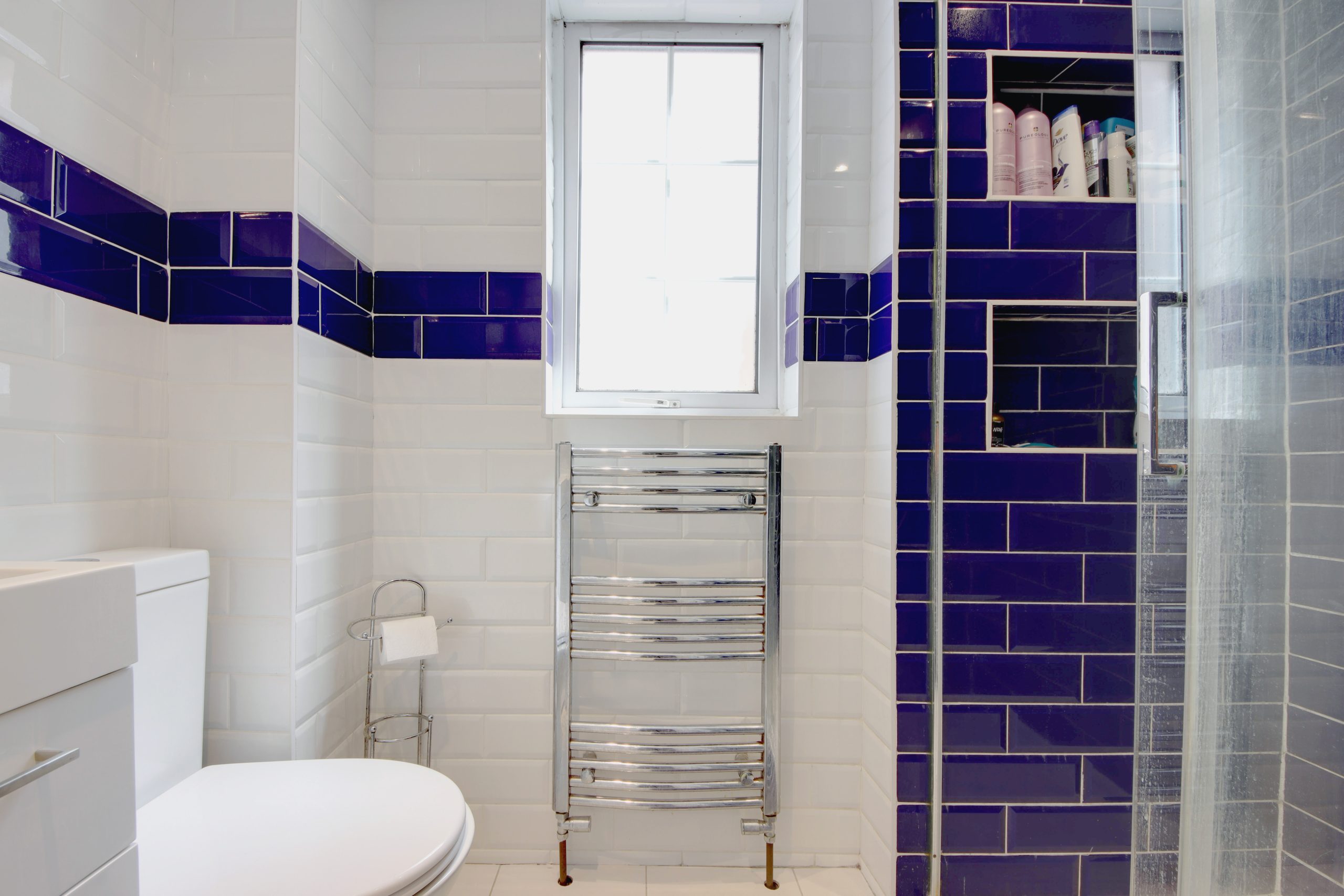 Ascending to the first floor, you’ll discover two generously sized double bedrooms. The second bedroom benefits from a south-facing window that bathes the room in natural light, along with built-in cabinetry for ample storage. The principal bedroom maintains stylistic harmony with the rest of the house and offers built-in cabinetry with picturesque views of the rear garden. The first floor is completed by a stylish family bathroom adorned with a combination of white and navy ceramic tiles, featuring a luxurious glass walk-in shower enclosure.