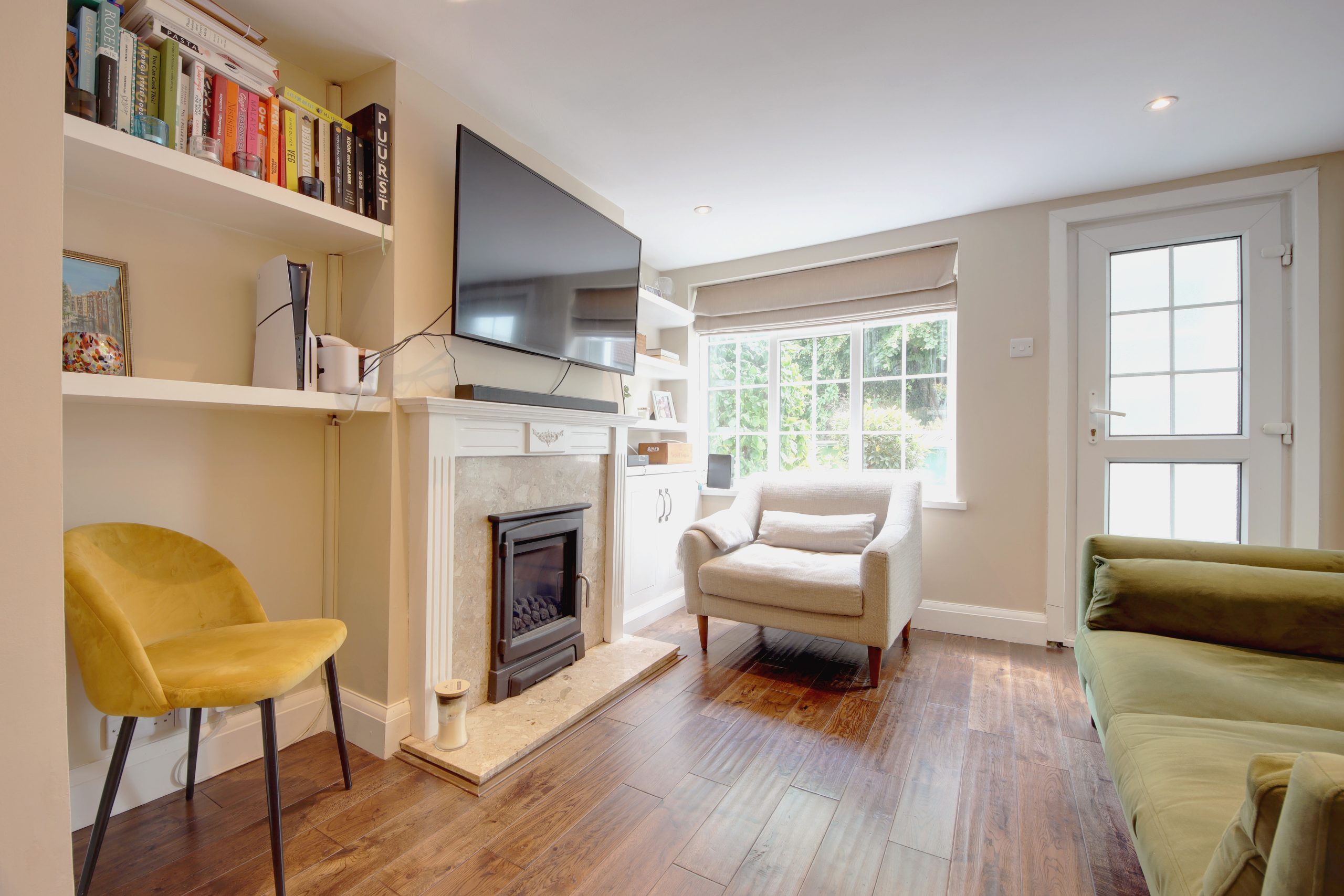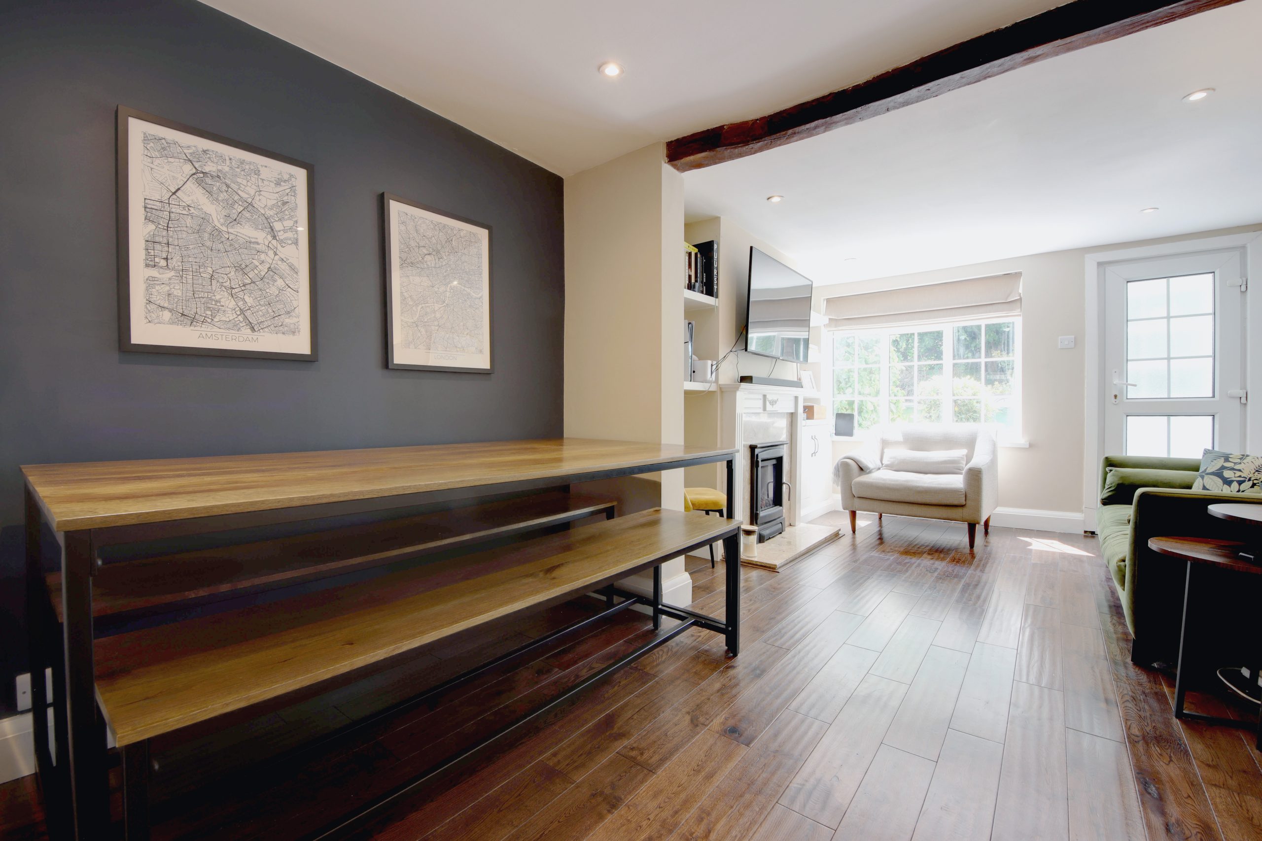 Upon entering through the inviting pastel-blue front door, you are greeted by a cozy porch, perfect for placing shoes and hanging coats. This area leads to the expansive ground floor living spaces. The open-plan kitchen, living, and dining area stretches an impressive 35’2”, created by the thoughtful removal of partition walls. Each space within this open layout has a distinct theme, providing a sense of segmentation, exuding warmth and coziness whilst also permitting modern living. Notable features include a striking fireplace with built-in storage in the alcoves, decorative exposed timber beams overhead and elegant wooden flooring. Toward the rear, the spacious kitchen unfolds, showcasing sleek neutral surfaces and a comprehensive range of cabinetry designed for utmost convenience.