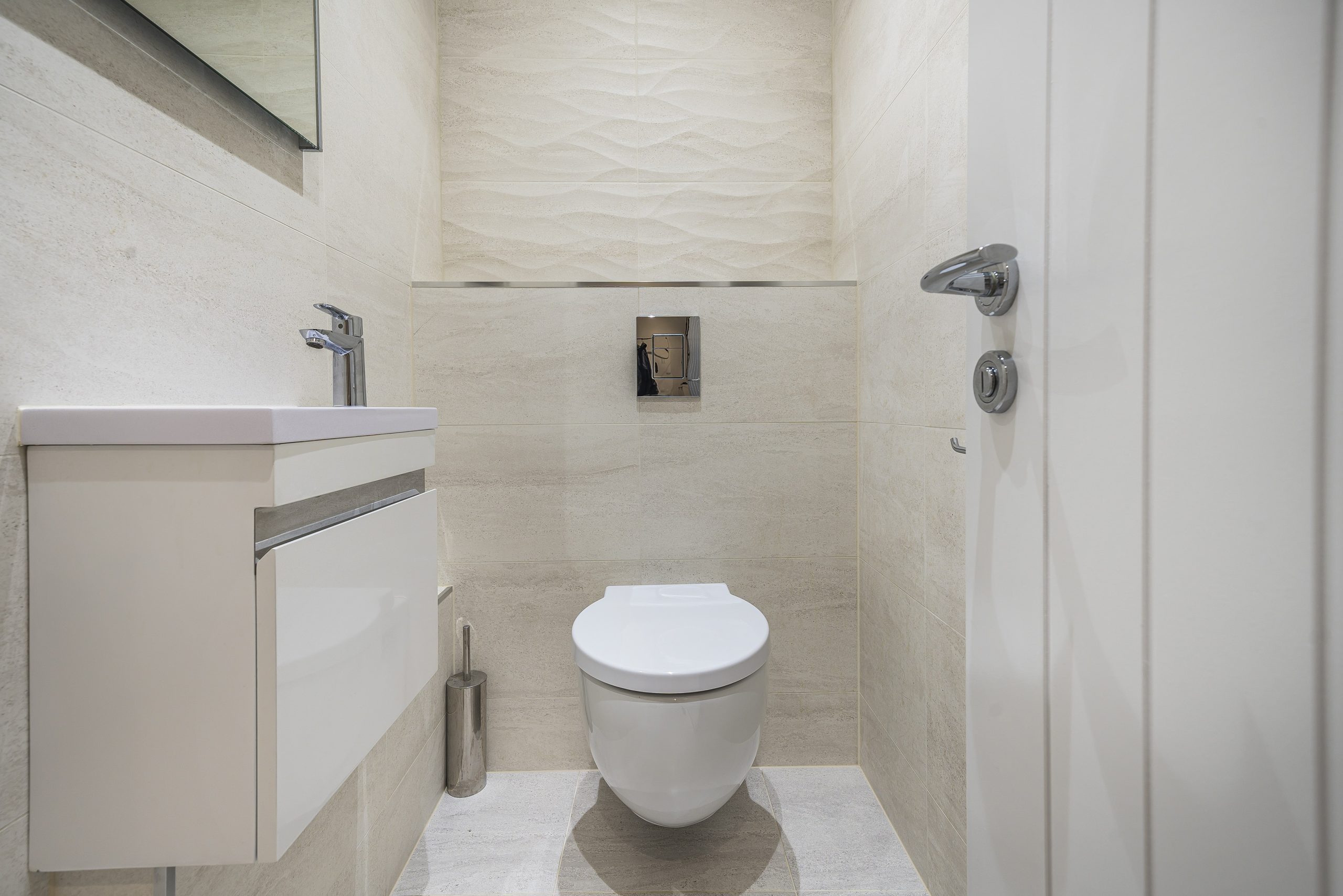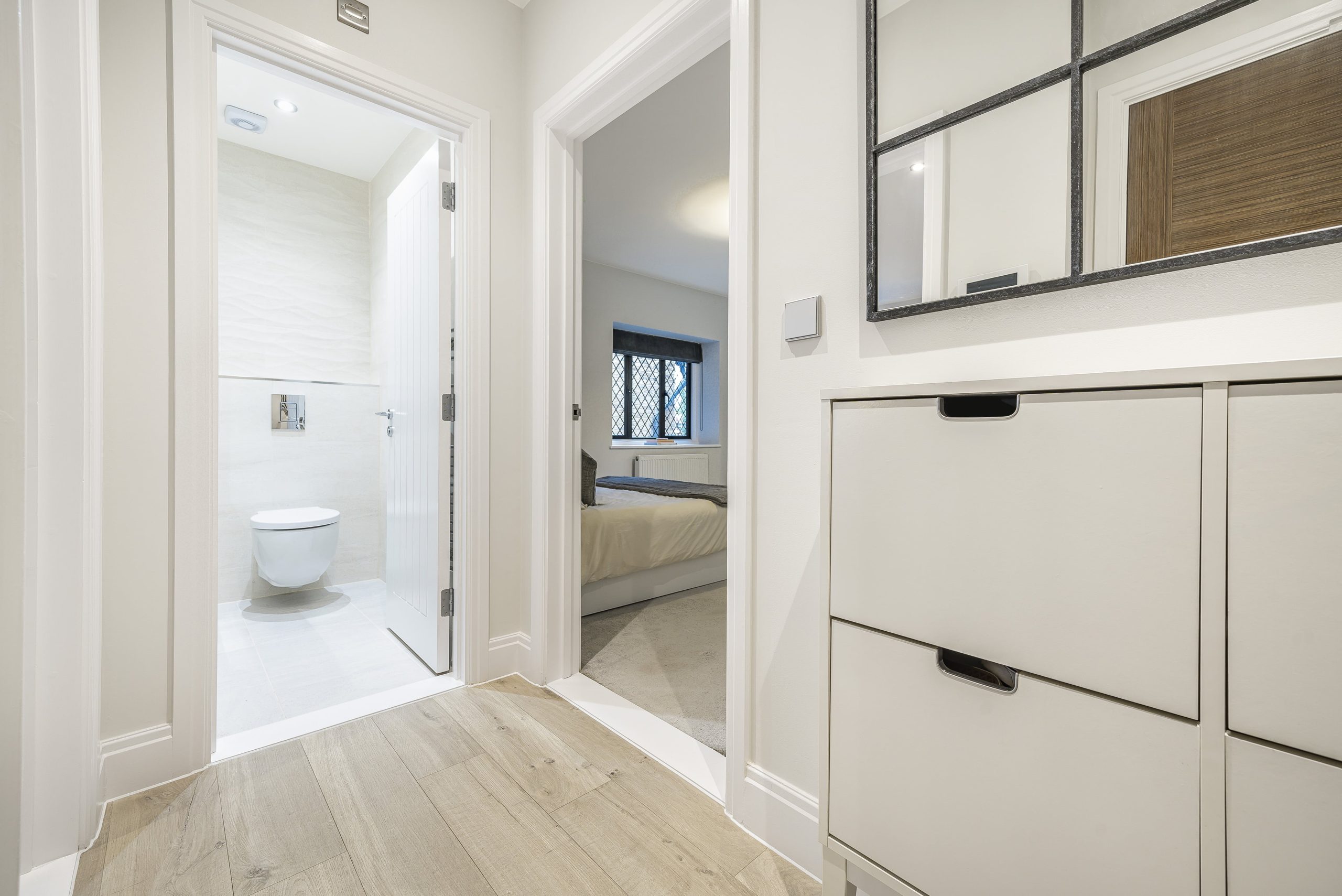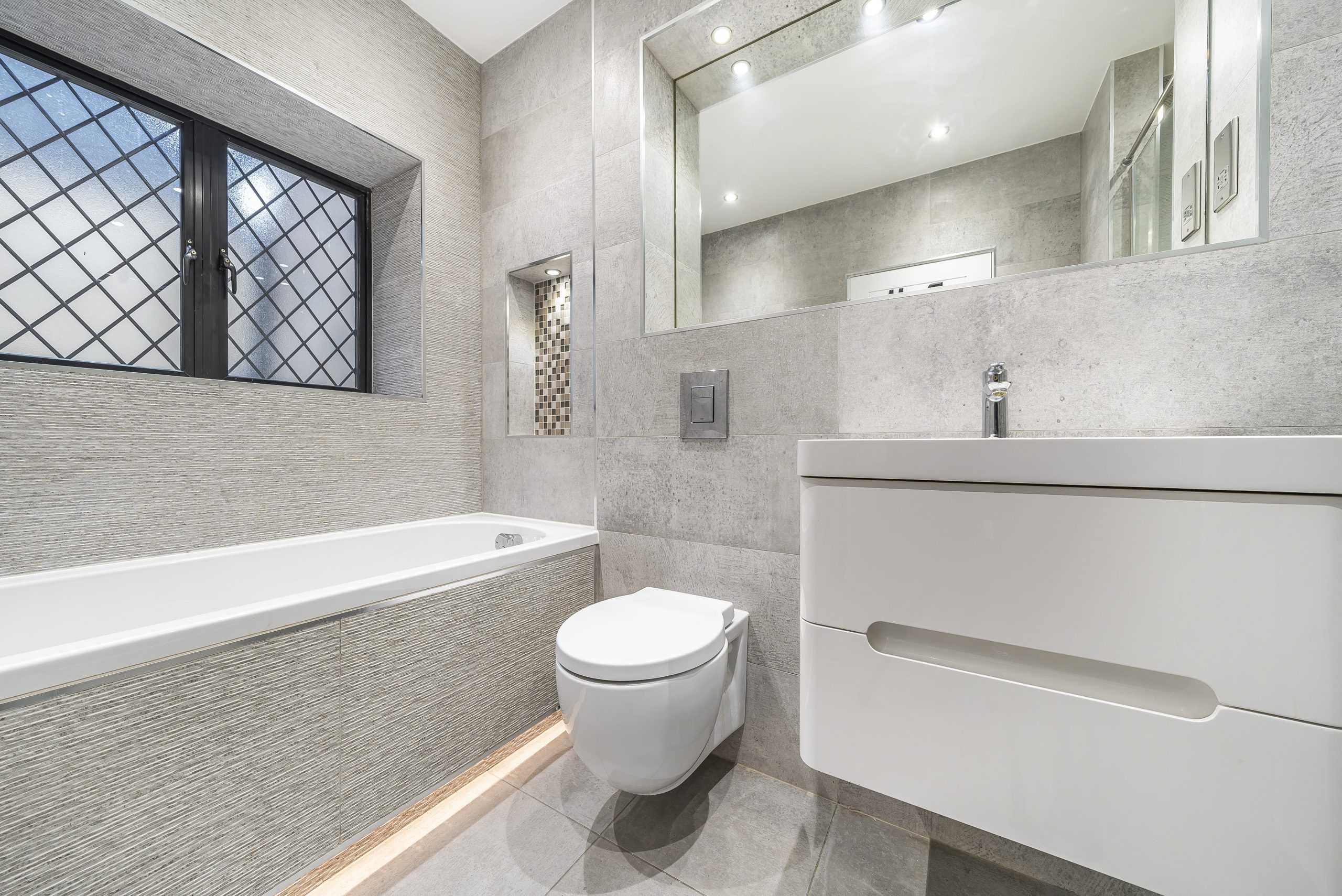 The double bedroom is set beyond the hallway, retaining the strong-white theme with a panelled wall painted 'Beige 05' by Lick. The room features bespoke cabinetry, cleverly blended in to the main walls and a white floating shelf sat beneath a large hollywood mirror. Completing the plan is a bathroom laid floor-to-ceiling in grey porcelain tiles with a bath tub and separate walk-in shower with feature mosaic flooring and a separate W.C.