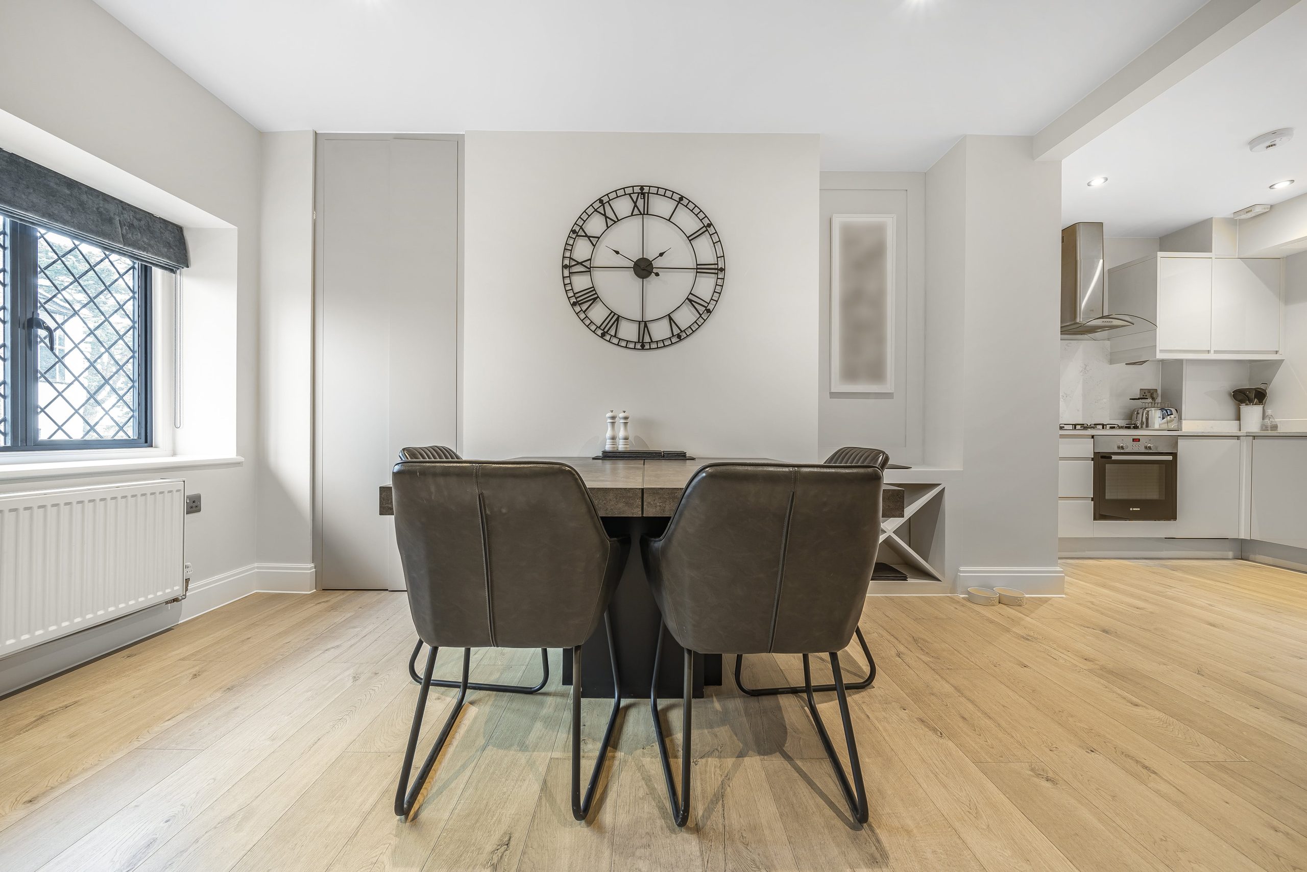 The living room and kitchen are arranged in an open plan, where dual-aspect windows work in harmony with the strong-white walls allowing for ample natural light. The large dining area, which can comfortably seat six people, is currently set to one side beneath a vintage skeleton clock next to a feature alcove with wall panelling and built-in wine storage cube. The kitchen leads from the living area with XenaQuartz worktops and cream J-pull cabinetry concealing appliances.