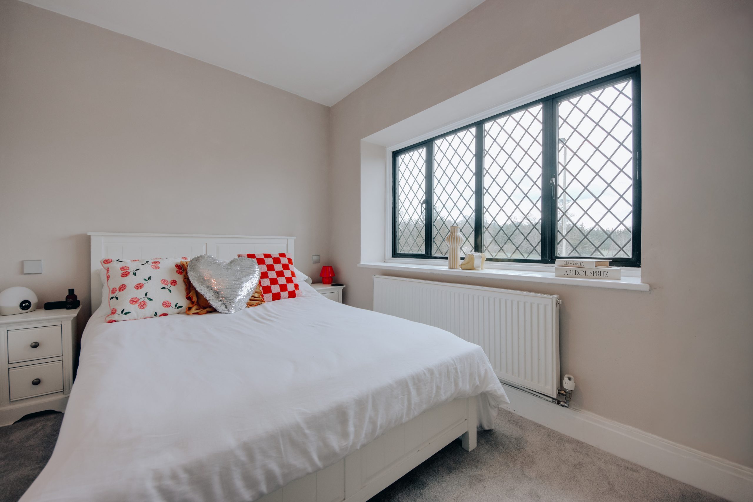 The expansive open-plan living room and kitchen are flooded with natural light, thanks to south-westerly facing windows that perfectly complement the pristine white walls, creating a bright, airy, and inviting atmosphere. A dining area, ideal for hosting, is elegantly nestled within a recessed space, highlighted by downlights that add an extra layer of sophistication, adjacent to a striking feature wall. The kitchen, seamlessly integrated into the living space, features sleek XenaQuartz worktops and sophisticated cream J-pull cabinetry that cleverly conceals high-end appliances.