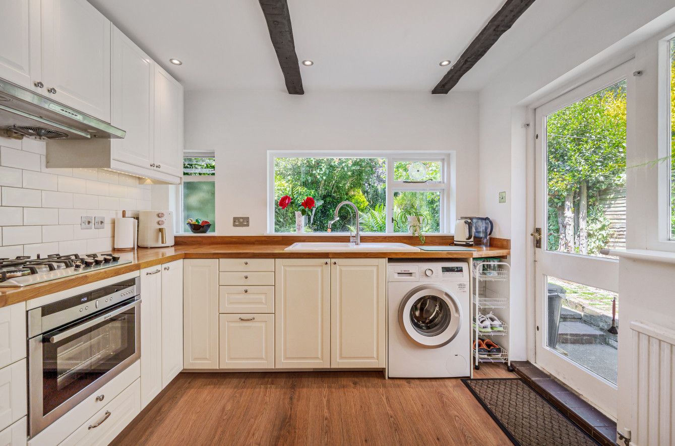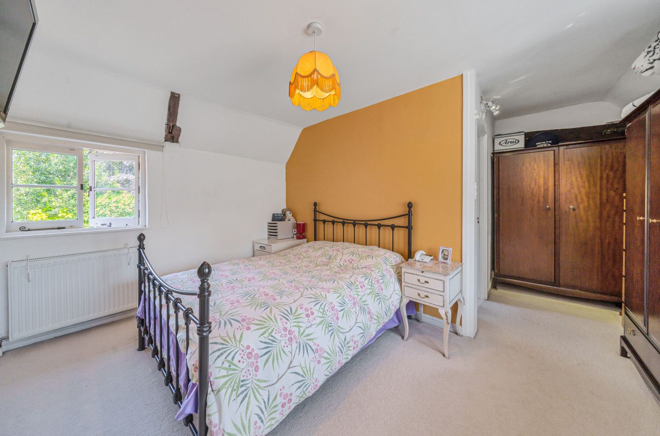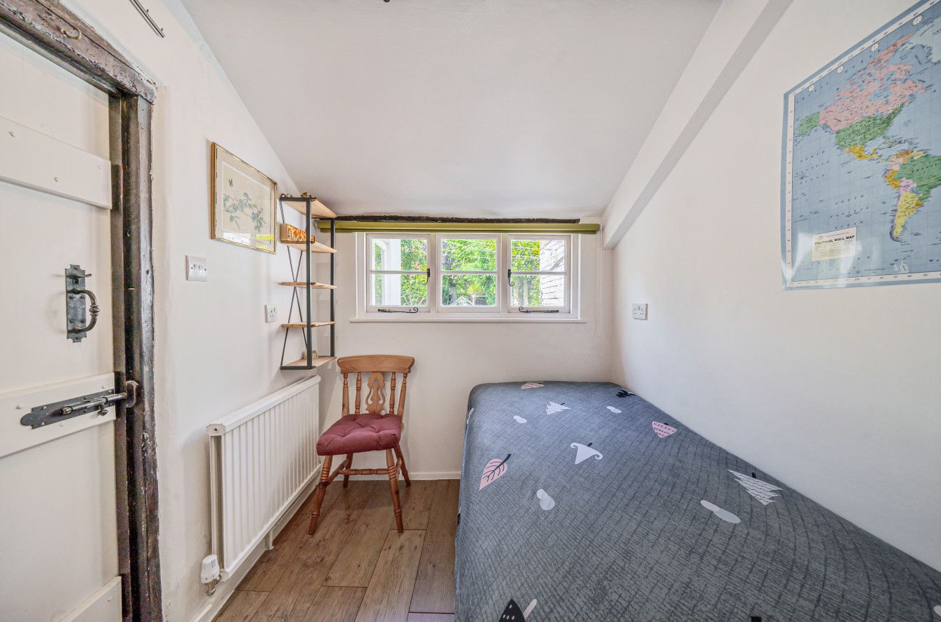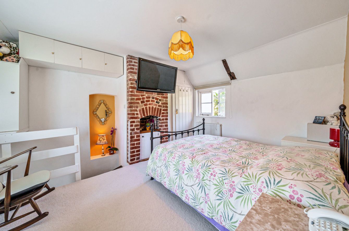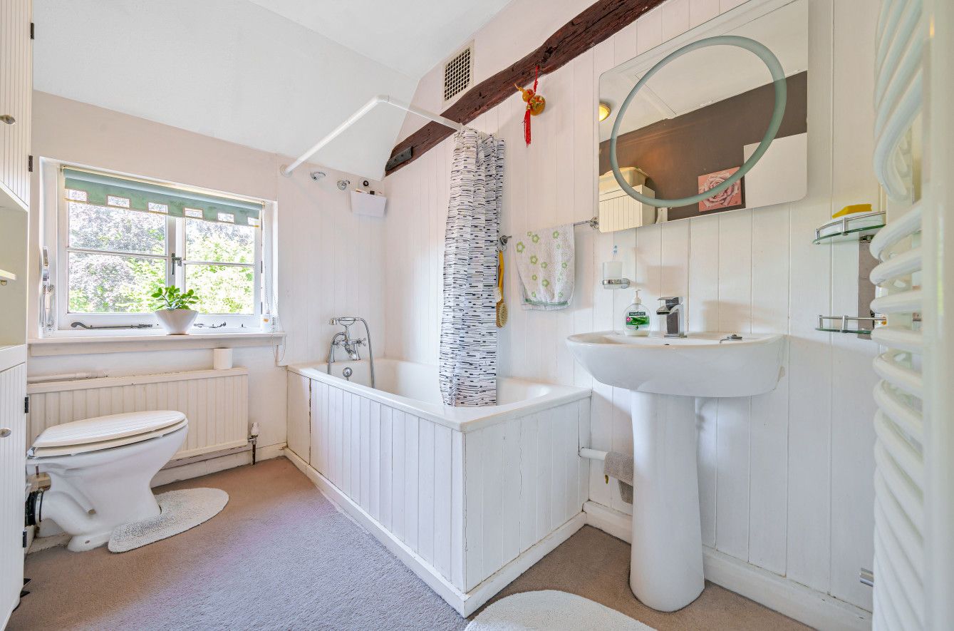 The house’s 18th-century vernacular origins are evident, with a clean, classical design throughout. Upon entering the residence, you are immediately greeted by a 14ft living room, with beautiful, exposed timber beams overhead. Towards the rear of the plan is an expansive kitchen and dining room. Lit by dual aspect windows and a patio door opening into the garden, the space has an exceptional quality of natural light. Topped with wooden surfaces, the kitchen's comprehensive range of neutral cabinetry is laid out so everything is within easy reach. Completing the ground floor is a useful bathroom, finished in tile, floor-to-ceiling.