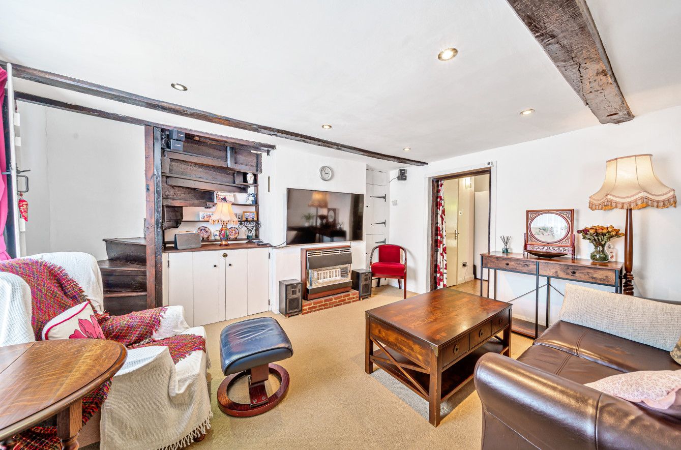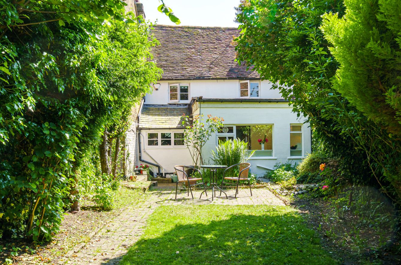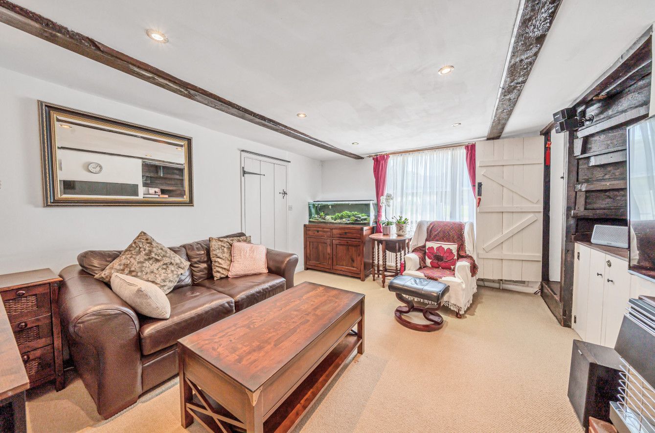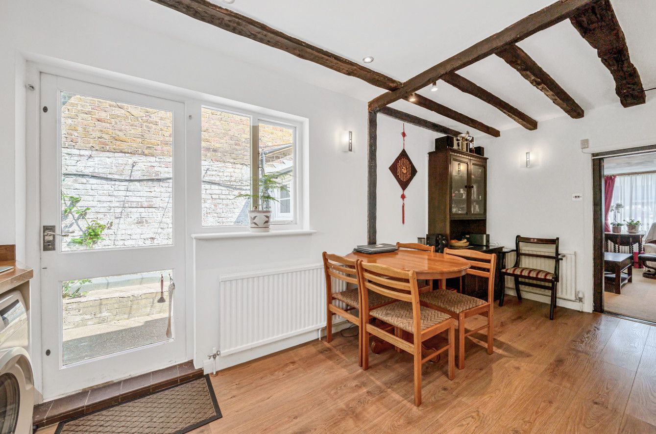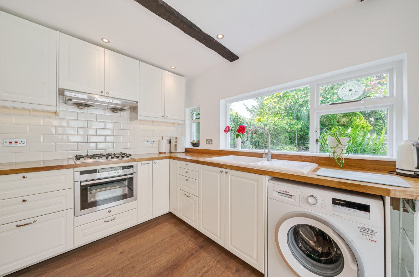The house’s 18th-century vernacular origins are evident, with a clean, classical design throughout. Upon entering the residence, you are immediately greeted by a 14ft living room, with beautiful, exposed timber beams overhead. Towards the rear of the plan is an expansive kitchen and dining room. Lit by dual aspect windows and a patio door opening into the garden, the space has an exceptional quality of natural light. Topped with wooden surfaces, the kitchen's comprehensive range of neutral cabinetry is laid out so everything is within easy reach. Completing the ground floor is a useful bathroom, finished in tile, floor-to-ceiling.