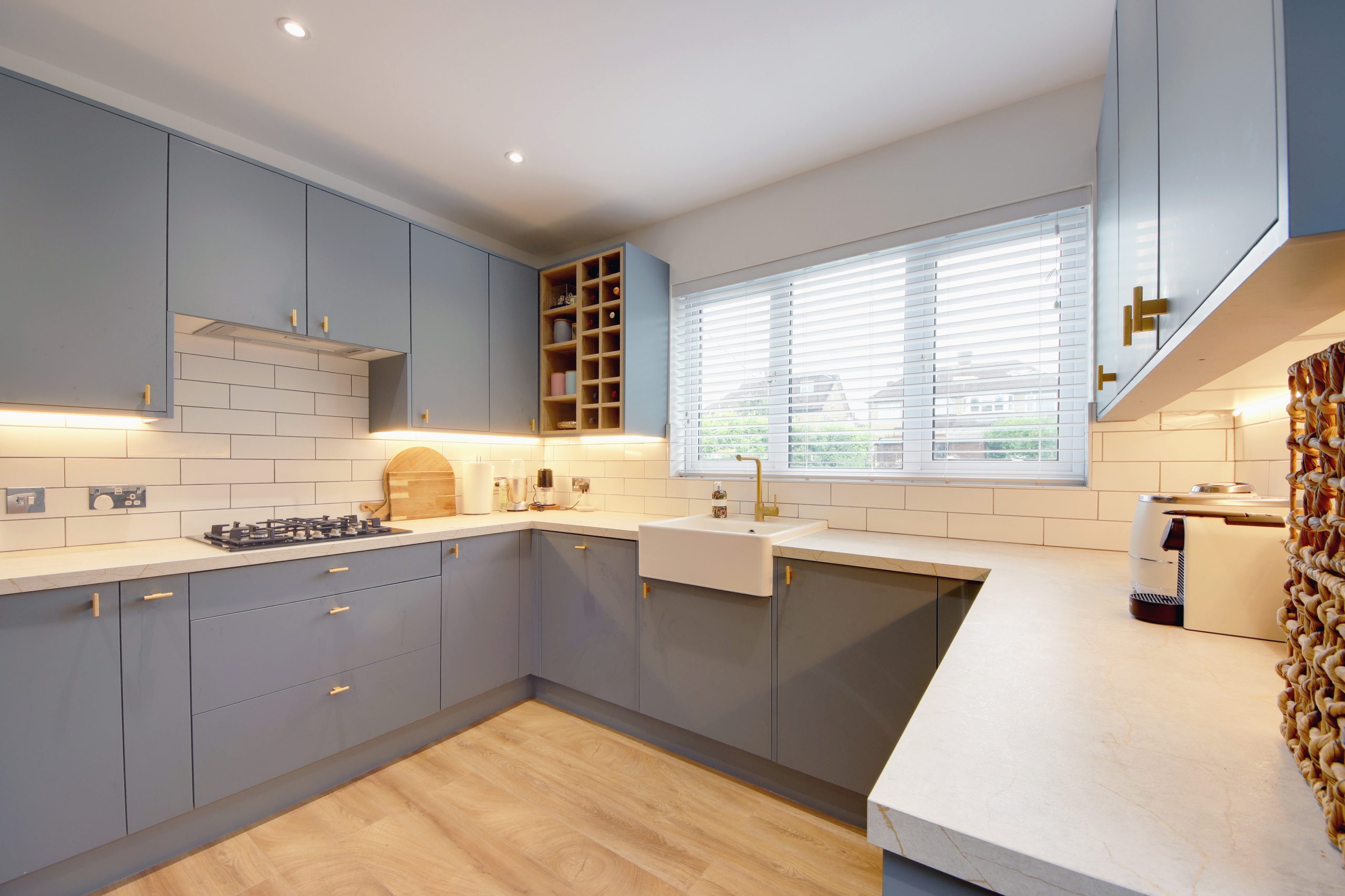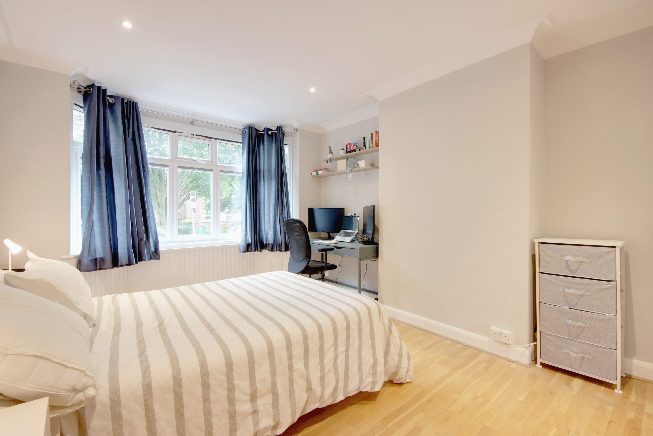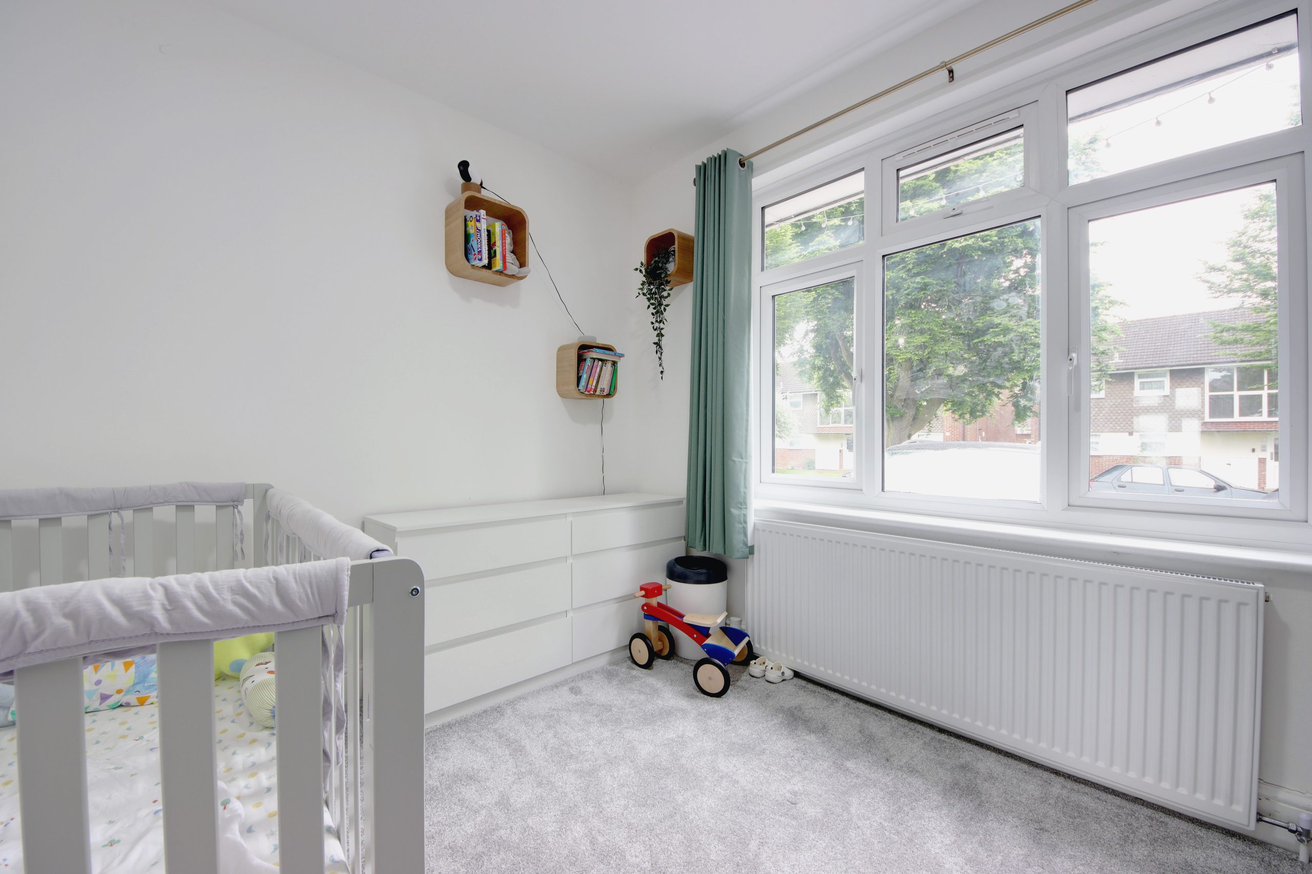 Upon stepping into the residence, you're welcomed by a spacious hallway that conveniently connects to all ground floor rooms. To the right, toward the rear of the layout, a 14ft living room sits at the heart of the space and provides direct access to the serene, westerly-facing conservatory overlooking the garden. A chimney breast with a floating television serves as the focal point, complemented by reinstated cornicing running along the walls. The ground floor also features a practically new kitchen; adorned with neutral worktops, the kitchen boasts a comprehensive range of pastel-blue cabinetry and appliances laid out for easy access. Rounding off the ground floor is a convenient modern shower room and a spacious third bedroom. A staircase leads up to the first floor, where you'll find a 16ft second bedroom featuring ample built-in cabinetry, along with a family bathroom.