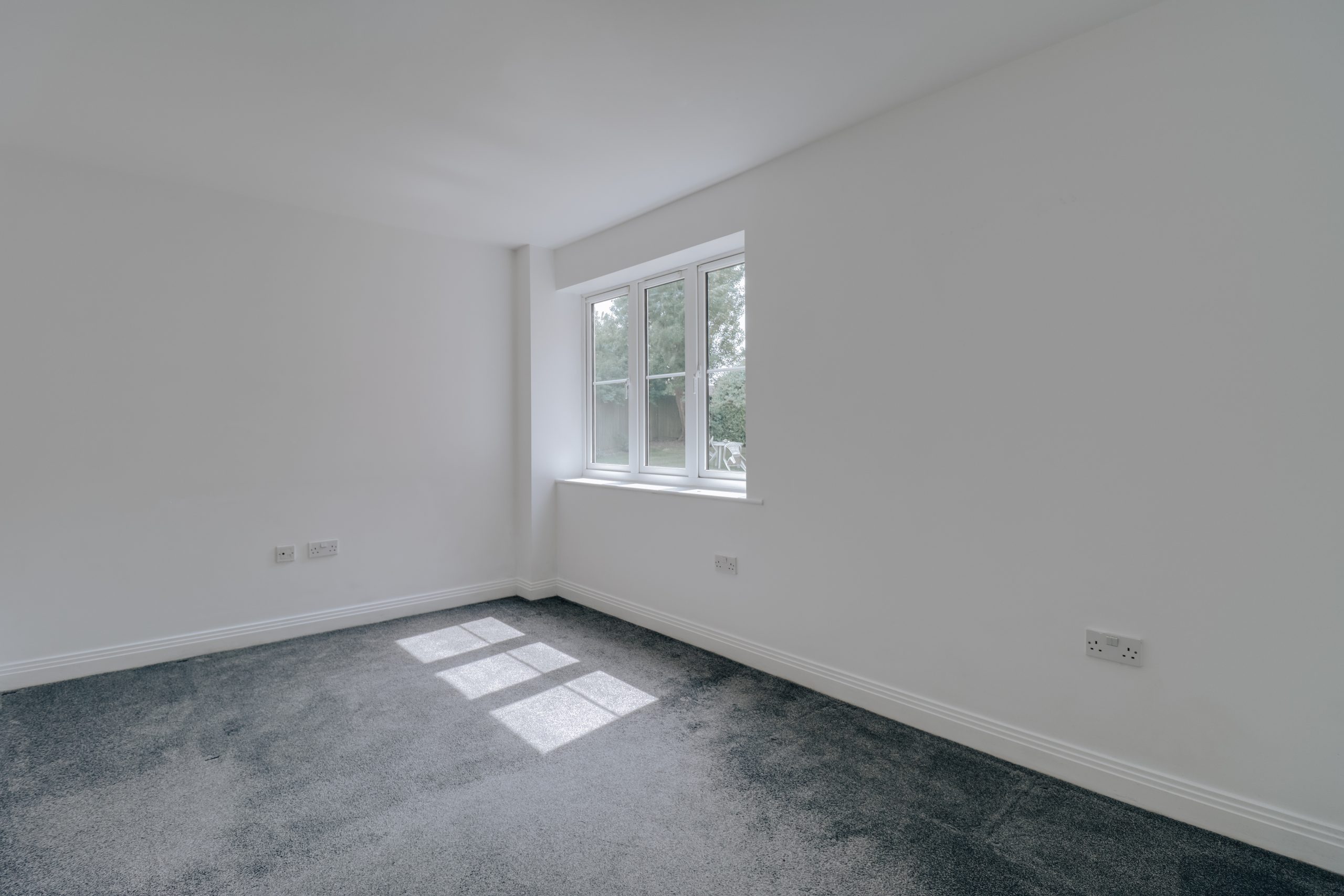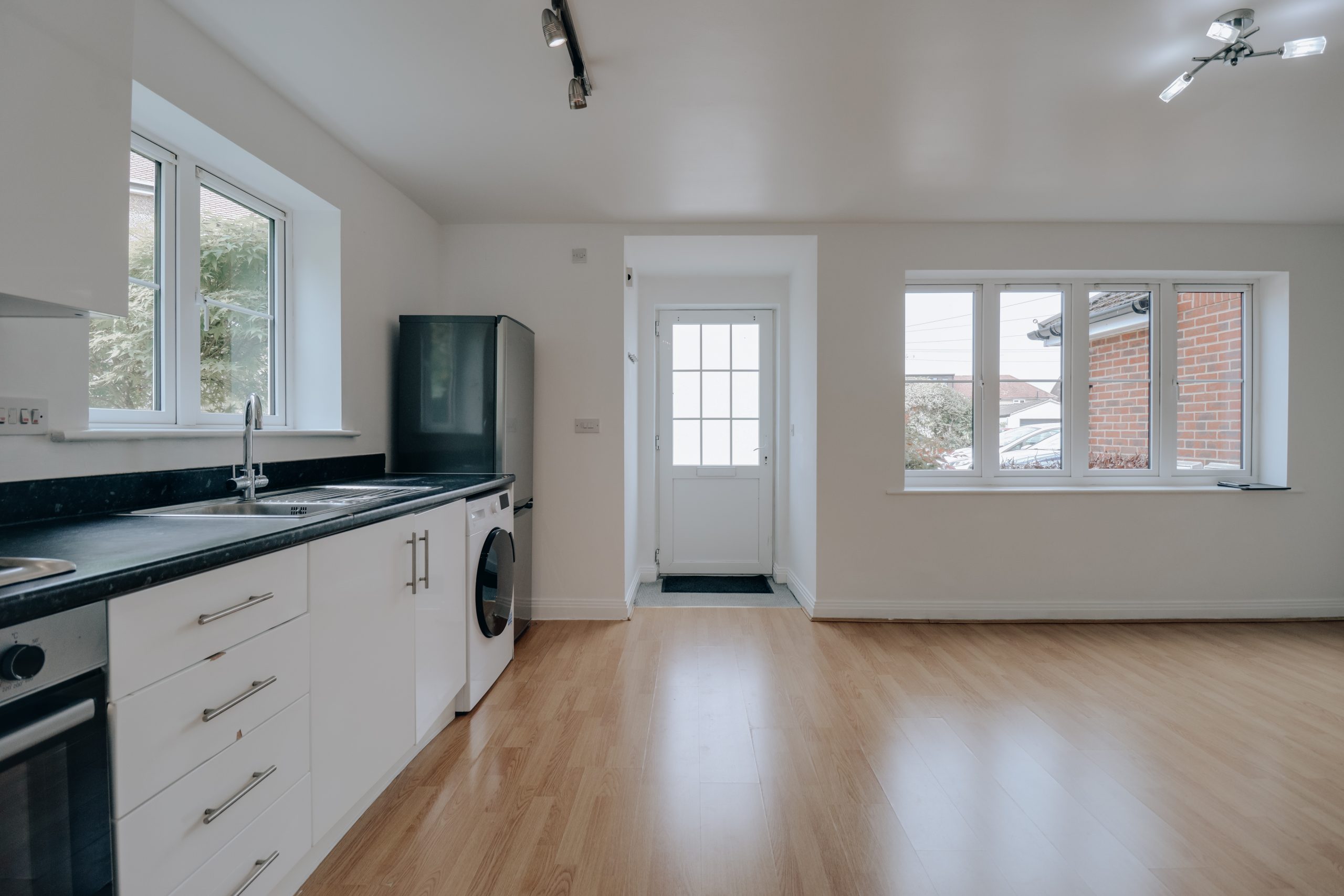 Inside, the interiors are sleek and minimalist, with a sophisticated open-plan living area measuring an impressive 20’4” x 17’3”. A contemporary kitchen runs the length of one wall, featuring crisp white cabinetry, dark laminate worktops and integrated electric appliances – in keeping with the home’s fully electric specification. To the rear, the generous double bedroom is flooded with natural light and enjoys leafy views across the manicured communal garden. The accommodation is completed by a modern bathroom.