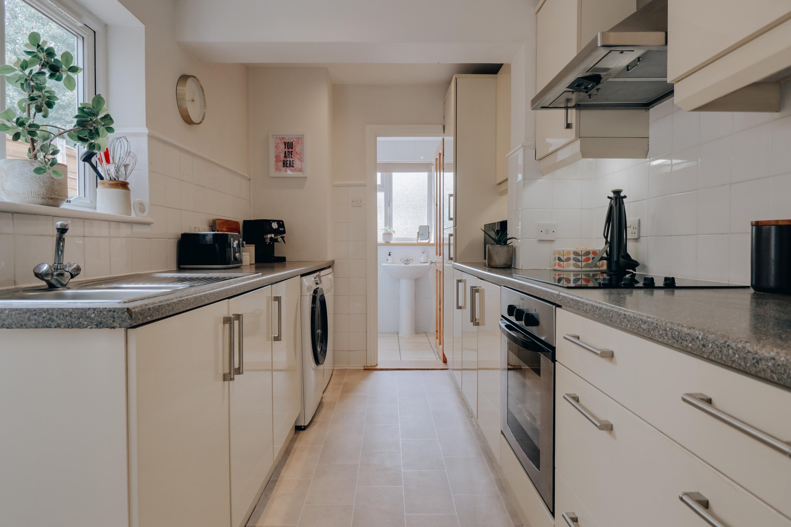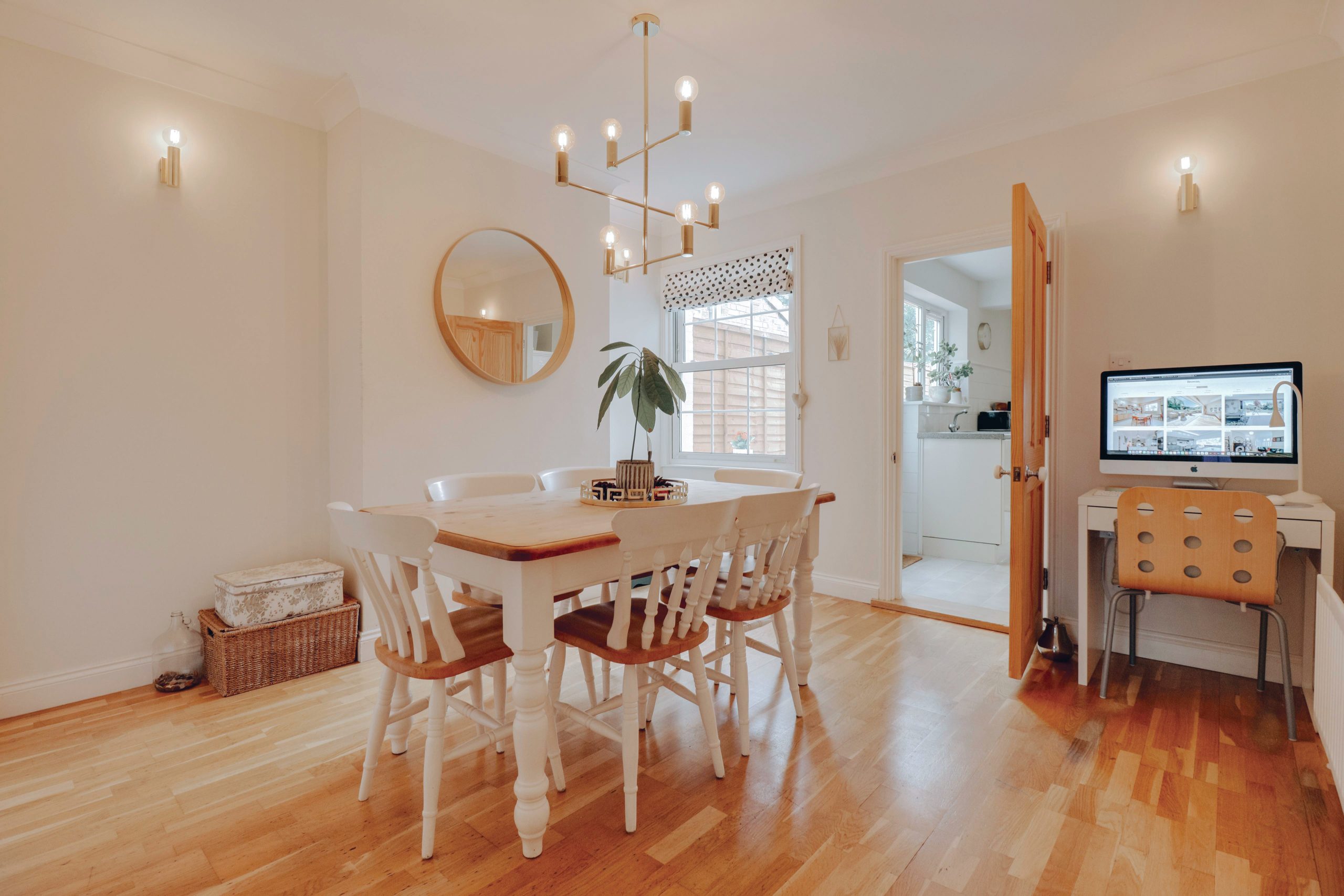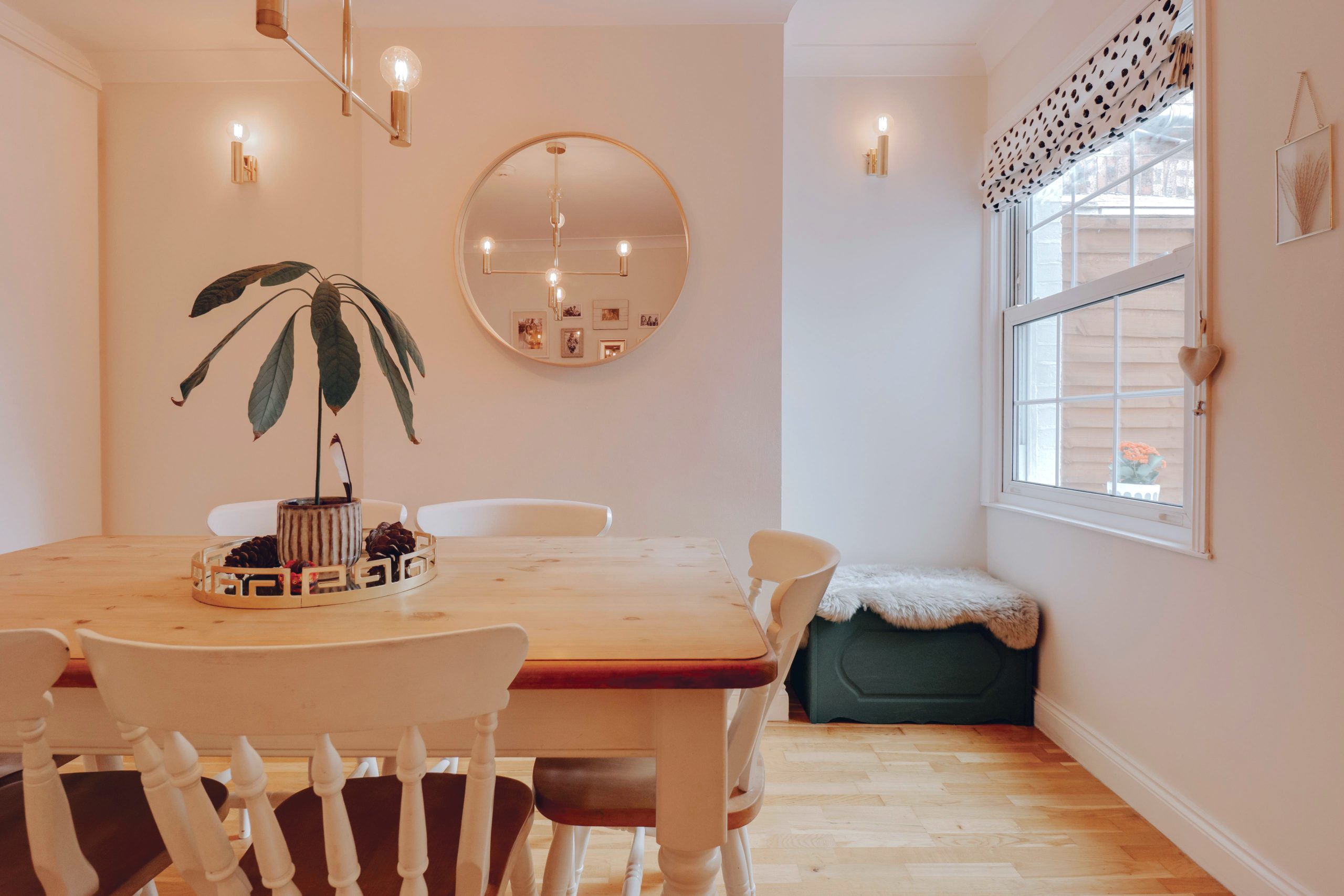 Step through the door and you’re greeted by a bright, south-westerly facing living room (12’5” x 11’8”), where natural light bounces across crisp shutters and restored period cornicing. A sleek, floor-to-ceiling integrated storage wall tucks away the day-to-day, ensuring the room remains as calm and composed as it is stylish. At the heart of the home lies a showstopping dining room (14’3” x 11’8”) - a space that feels both intimate and open, thanks to clever spatial flow and a cohesive design palette. It’s a room made for entertaining: statement lighting, neutral flooring and bold decorative touches create an atmosphere that’s sophisticated yet relaxed. Beyond, the kitchen continues the story, blending pared-back cabinetry, marble-effect worktops, and brushed chrome accents to form a workspace that’s equal parts functional and refined. A single door opens directly onto the garden, making inside-outside living an effortless extension of the home.