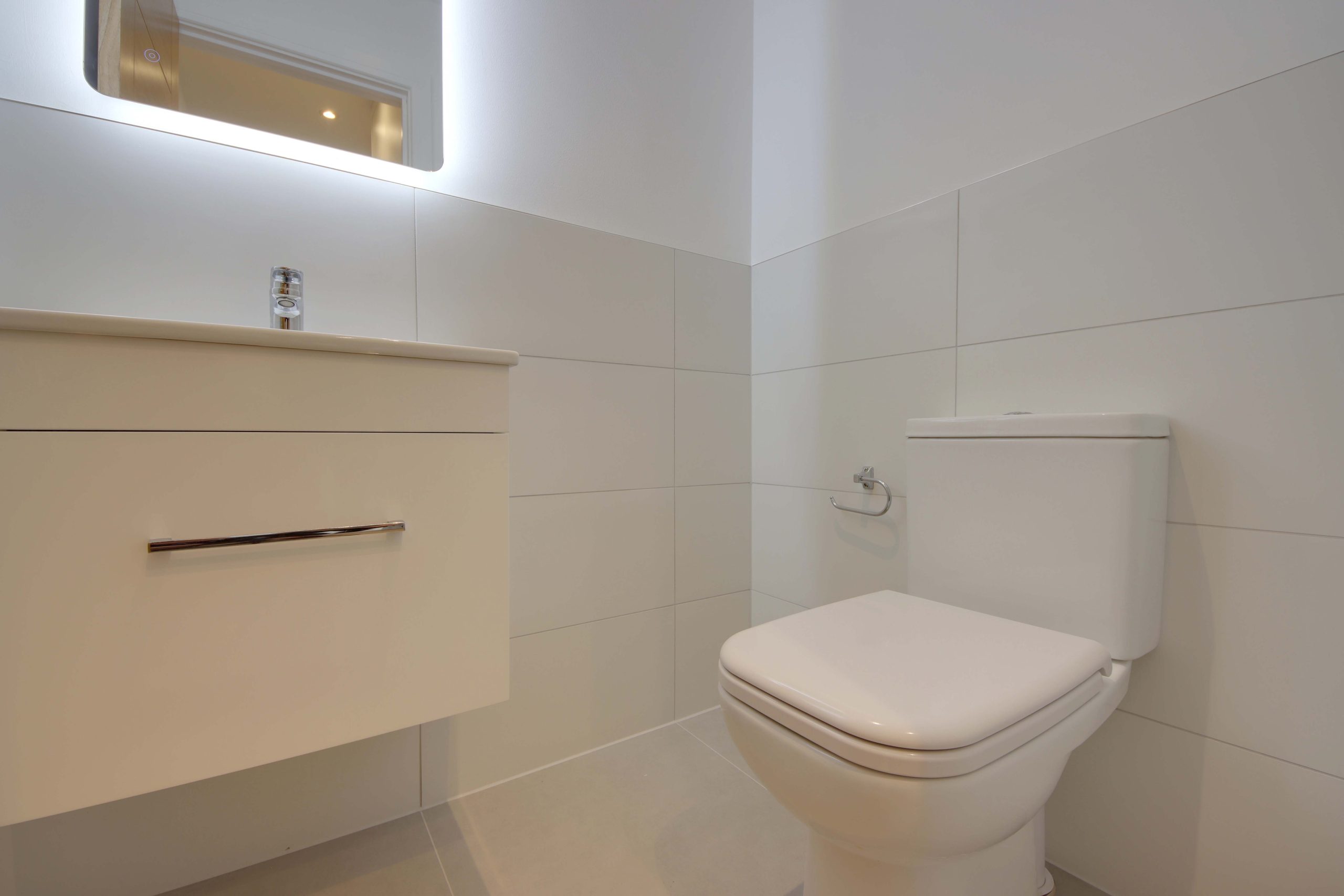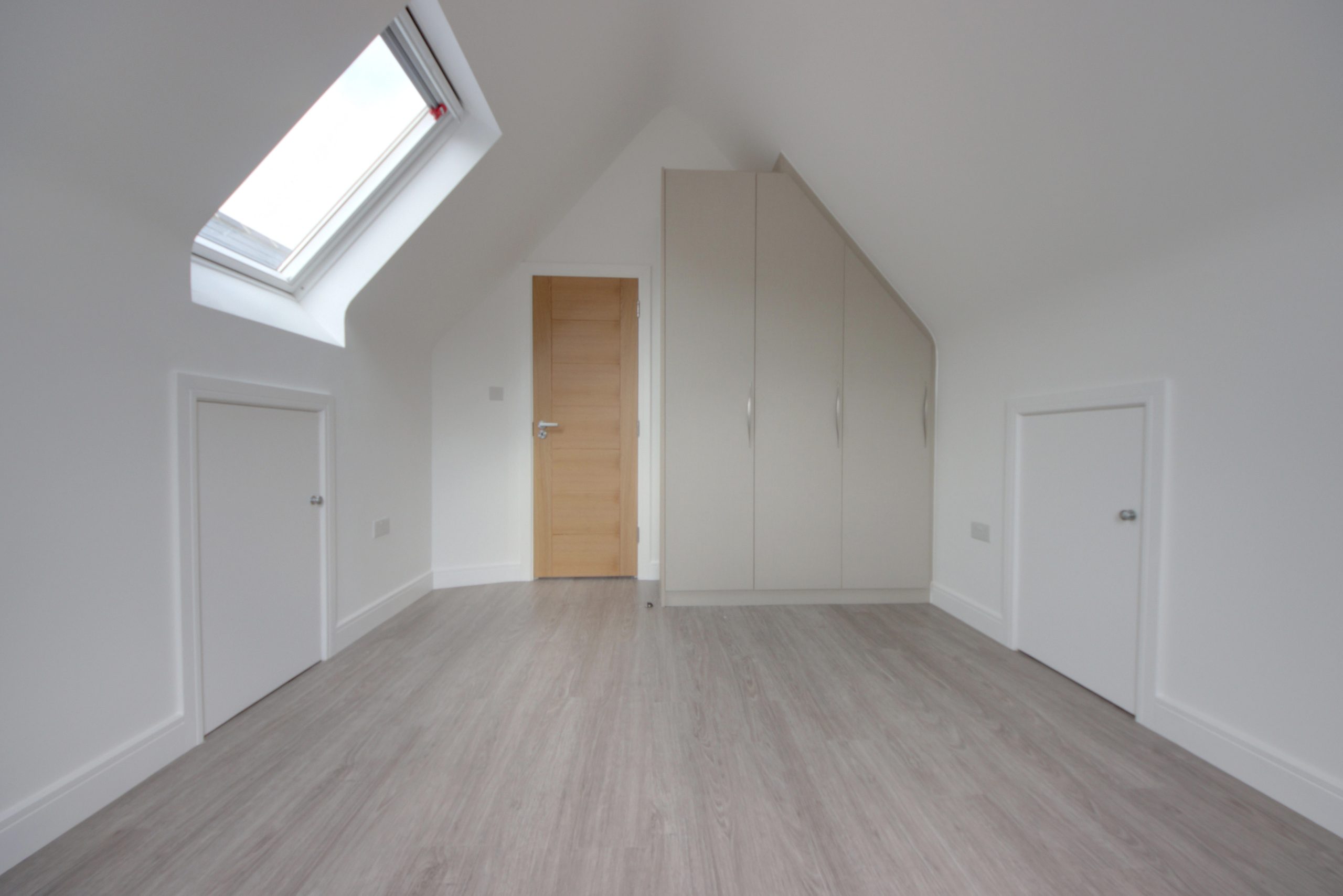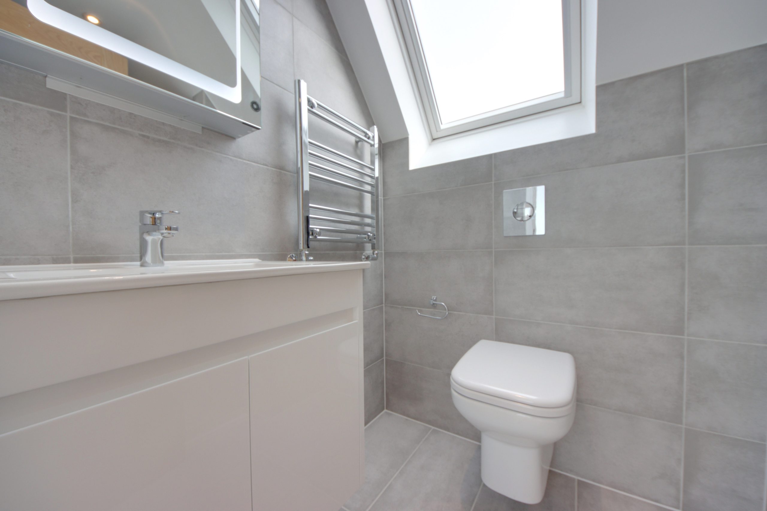Upon entering the residence you are immediately greeted by a 15ft living room, ideally situated at the front of the plan; a generous, south-facing window with bright-white, bespoke shutters serves as the focal point. The open-plan kitchen, located at the rear of the home, is an expansive space. Topped with stone surfaces, the kitchen’s comprehensive range of cabinetry and appliances (NEFF oven, microwave, extractor fan and induction hob) are laid out so everything is within easy reach; wide, anthracite sliding doors establish a seamless connection with the north-westerly facing garden. Completing the ground floor is a useful utility room and ground floor W.C, finished floor-to-ceiling in a modern, grey tile.