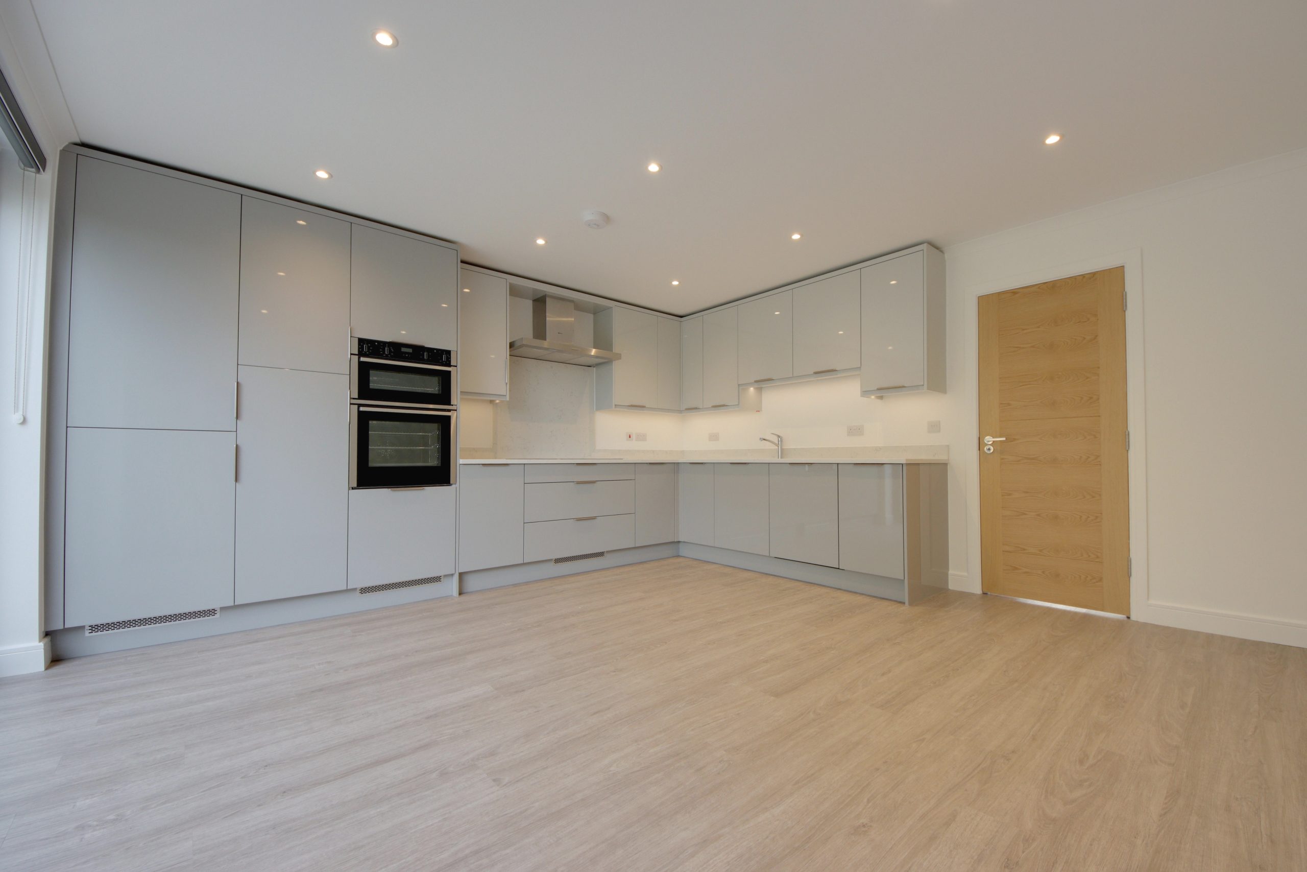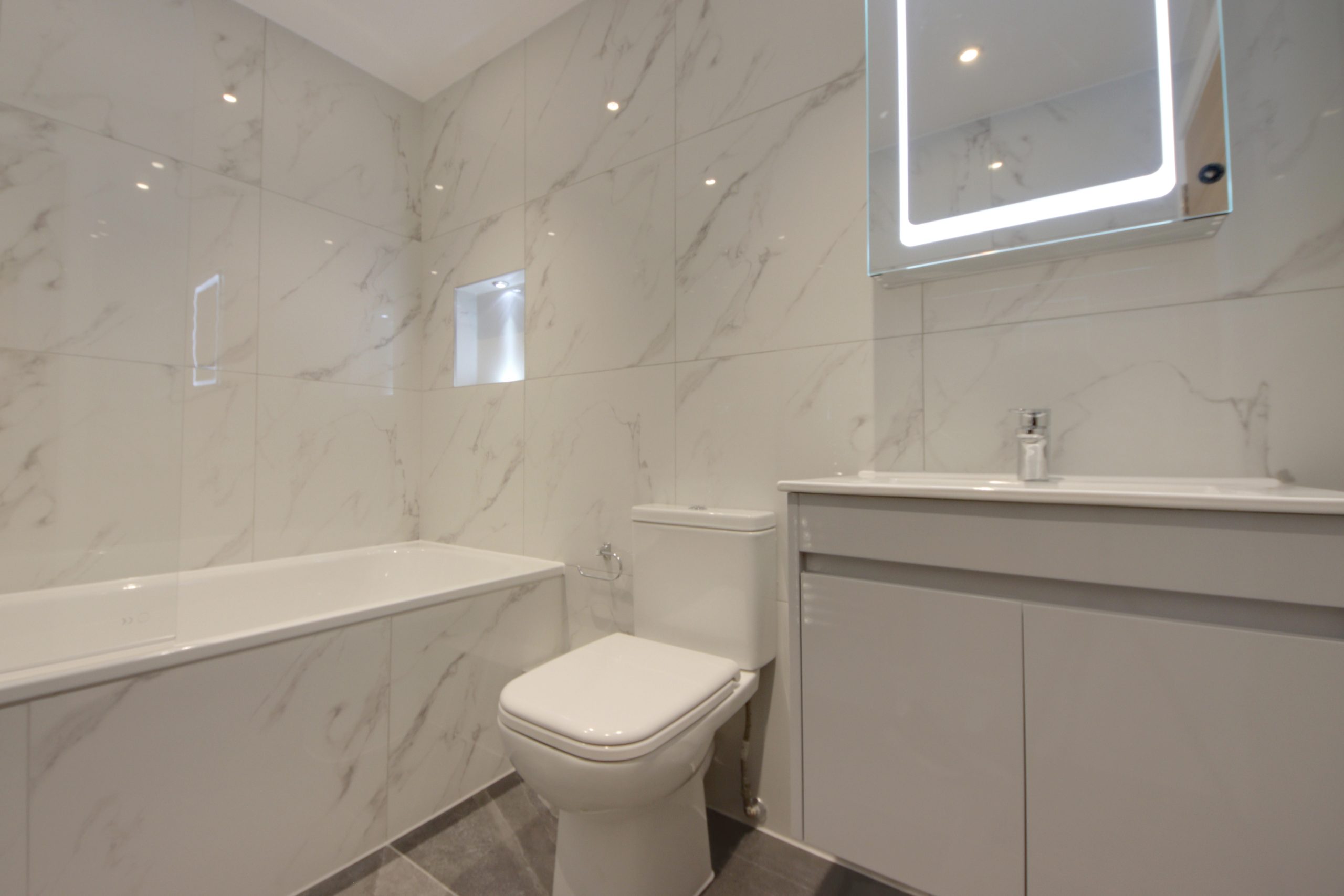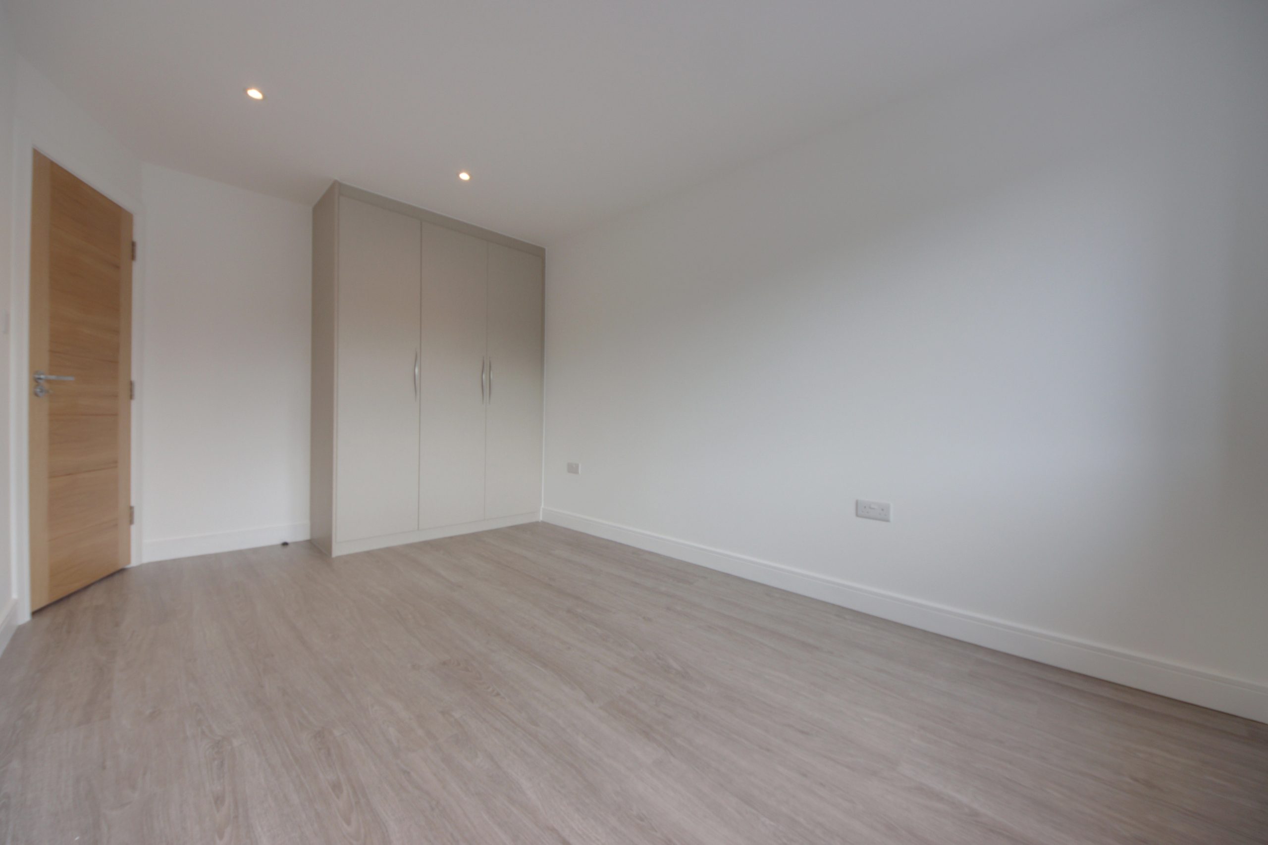 Upon entering the residence you are immediately greeted by a 15ft living room, ideally situated at the front of the plan; a generous, south-facing window with bright-white, bespoke shutters serves as the focal point. The open-plan kitchen, located at the rear of the home, is an expansive space. Topped with stone surfaces, the kitchen’s comprehensive range of cabinetry and appliances (NEFF oven, microwave, extractor fan and induction hob) are laid out so everything is within easy reach; wide, anthracite sliding doors establish a seamless connection with the north-westerly facing garden. Completing the ground floor is a useful utility room and ground floor W.C, finished floor-to-ceiling in a modern, grey tile.