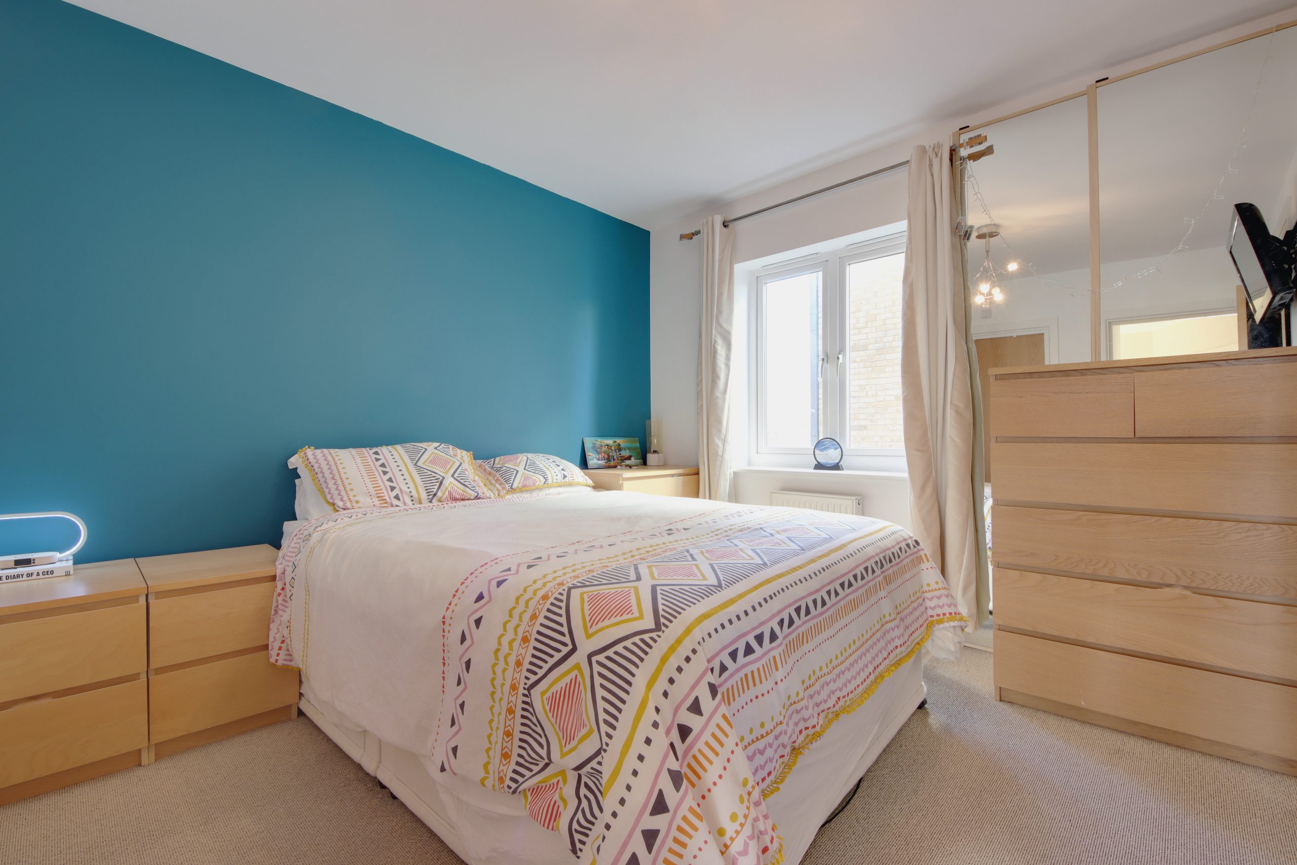 The main bedroom, measuring at a generous 12ft, features built-in storage cleverly concealed behind sliding doors and the added luxury of an en-suite bathroom with underfloor heating. The second bedroom offers versatility and comfort, while the family bathroom is beautifully appointed with a blue-painted feature wall and classic white tiling. The hallway also benefits from a large storage cupboard, ensuring practicality throughout the home.