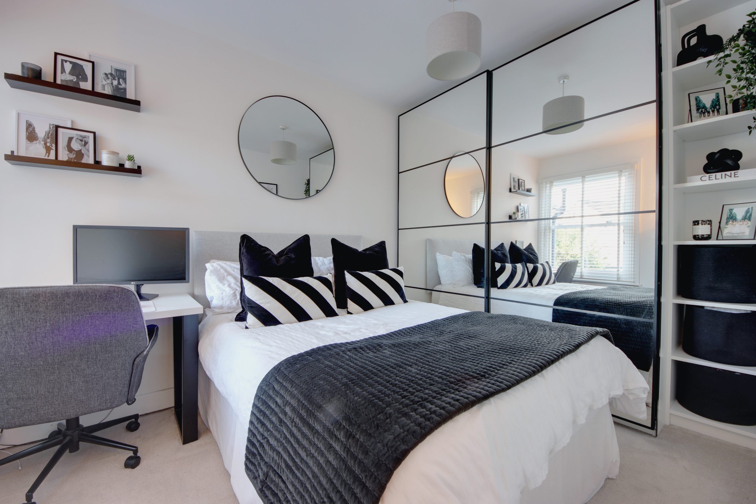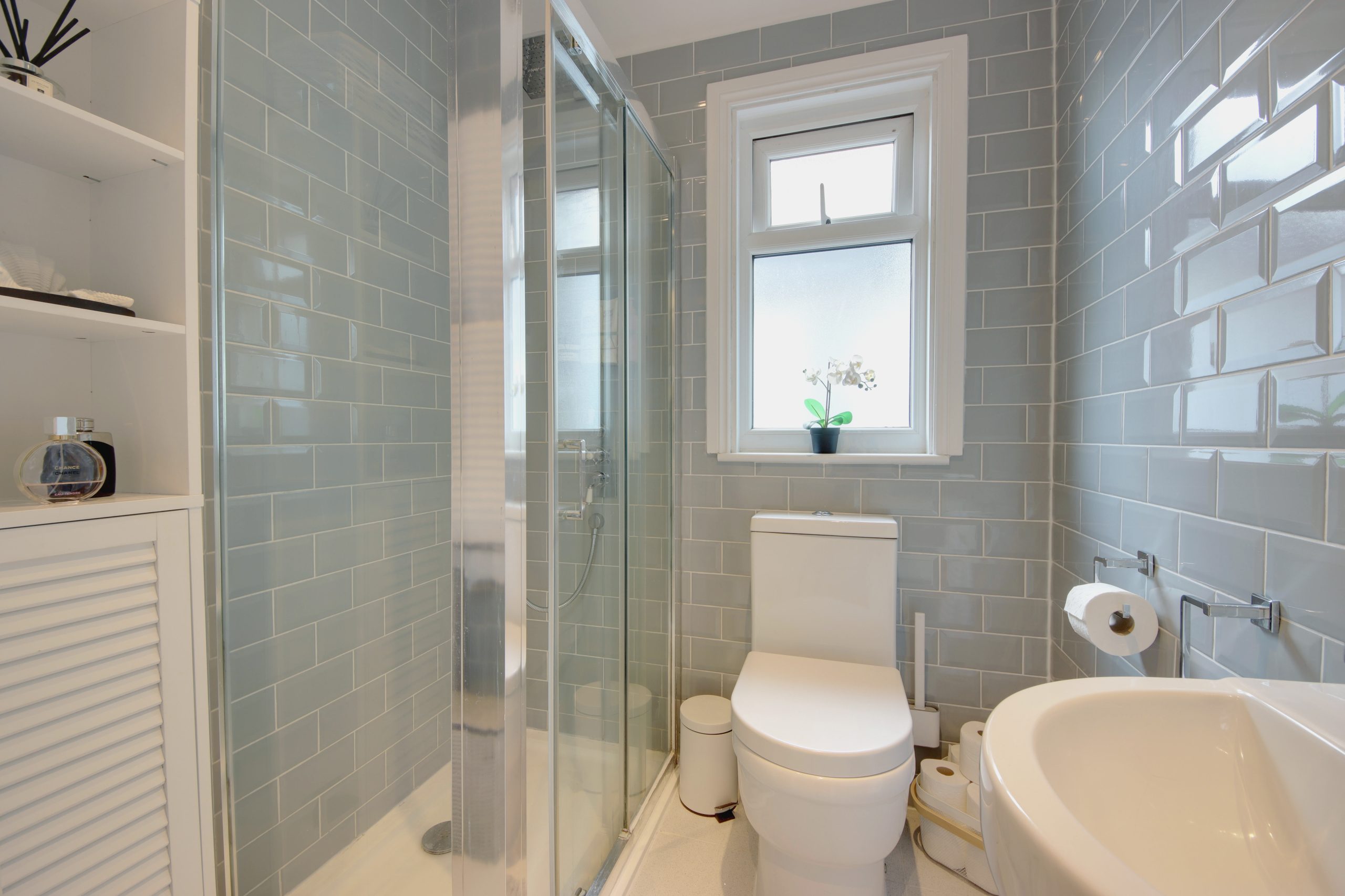 Upstairs, the first floor reveals three generously sized bedrooms, each offering comfort and style. The principal bedroom, measuring an impressive 13 feet, boasts inbuilt wardrobes and a bay window that mirrors the grandeur of the living room below. Completing this level is the chic family bathroom, adorned with grey tiles and a walk-in shower.